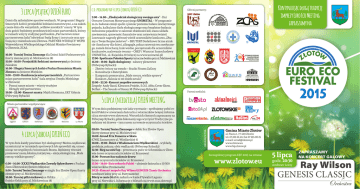 c.d. programu na 4 lipca (sobota) DZIEŃ ECO 10.00 • Turniej Tenisa Ziemnego dla Dzieci Szkół Podstawowych (korty ziemne przy al. Mickiewicza 18) 15.00 – 16.00 • Przejażdżki łodziami motorowymi po Jeziorze Zaleskim 16.00 • I Regaty Smoczych Łodzi o Puchar Burmistrza Miasta Złotowa na Jeziorze Miejskim 9.00 – 19.00 • Konferencja miast partnerskich „Partnerstwo miast partnerstwem ludzi” (sala sesyjna Urzędu Miejskiego w Złotowie) • Poznaj nasze miasto – wizyty studyjne • Okrągły stół partnerstwa 19.00 – 22.00 • Koncert szanty: Majtki Bosmana, EKT Gdynia (Półwysep Rybacki) Miasta partnerskie i współpracujące: Eggesin Gifhorn Rathenow Goole Nieśwież La Flèche 4 lipca (sobota) DZIEŃ ECO W tym dniu każdy powinien być ekologiczny! Można wędkować, uczestniczyć w turniejach sportowych lub sprawdzić się, uczestnicząc we wspólnych ćwiczeniach fitness. Będziemy również promować naszą lokalną inicjatywę – akcję ekologiczną „Małe rzeczy, wielkie sprawy”. 6.00 – 14.00 • XXXII Wędkarskie Zawody Spławikowe o Puchar Ziemi Złotowskiej (Jezioro Miejskie) 9.00 • Turniej Tenisa Ziemnego w singlu Eco Złotów Open (korty ziemne przy al. Mickiewicza) 10.00 • Turniej piłki siatkowej na Orliku (boisko Orlik przy al. Mickiewicza 18) 9.00 – 14.00 • „Zbadaj odcisk ekologiczny swojego auta” - Dni Otwarte Centrum Motoryzacyjnego UNIMETAL – W programie m.in. badanie emisji spalin i pomiar poziomu hałasu zewnętrznego pojazdu, kalkulator śladu ekologicznego oraz bezpłatne badania techniczne pojazdów w zakresie: zbieżności kół, stanu układu zawieszenia, sprawności hamulców oraz ustawienia świateł. Losowanie nagrody głównej wśród uczestników konkursu „Dbamy o Twoje Bezpieczeństwo” – SKUTER!! Dodatkowo liczne atrakcje i konkursy dla dzieci, alkogogle, pokaz ratownictwa medycznego, zamek dmuchany, kule wodne, poczęstunek dla uczestników konkursów, malowanie twarzy – OSKP i Warsztat Samochodowy UNIMETAL, ul. Kujańska 10 (więcej na www.unimetal.pl) 17.00 • Spotkanie Pokoleń Sparty (sztuczne boisko przy al. Mickiewicza) 16.00 – 19.00 • Bądź ekologiczny - zabawy plenerowe (Półwysep Rybacki) • Złotów ćwiczy na wesoło – Studio Fitness ZaGray • Konsultacje z dietetykiem • Kampania promocyjna „Małe rzeczy, wielkie sprawy” Konkurs „Suknia to też dzieło sztuki” 19.00 – 22.30 • Koncert zespołów coverowych Zespoły: Andy Band, Klenczon Projekt, S.O.S. Abba Cover Show, Belfast – The Sounds of Boney M (Półwysep Rybacki) 2015 Patroni medialni: 5 lipca (niedziela) DZIEŃ MEETING W tym dniu podejmiemy nie lada wyzwanie – spróbujemy pobić rekord Polski w utworzeniu łańcucha z wiatraczków (więcej informacji na stronie www.zlotow.eu). Wszystkich chętnych zapraszamy na Półwysep Rybacki, gdzie dokonamy tego wyczynu! Tradycyjne posadzimy też drzewa – tym razem na terenie oczyszczalni ścieków. 09.00 • Turniej Tenisa Ziemnego w deblu Eco Złotów Open (korty ziemne przy al. Mickiewicza) 10.00 • Grand Prix Pomorza w Skata (CWK Zacisze przy ul. Wioślarskiej 4) 10.00 – 19.00 • Dzień z Wiadomościami Wędkarskimi - wykłady, prelekcje, pokazy, obóz wędkarski (Półwysep Rybacki) 12.30 • Bieg na sześć łap – prezentacja psów ze Schroniska w Złotowie (teren oczyszczalni ścieków ul. Brzozowa) 13.00 • Powszechne sadzenie drzew (teren oczyszczalni ścieków ul. Brzozowa) 17.00 – 19.00 • Bicie rekordu Polski – ułożenie łańcucha z 10 500 wiatraczków (Promenada) 20.30 • Koncert zespołu Ray Wilson GENESIS Classic Orchestra (amfiteatr leśny przy ul. Partyzantów) Bilety w cenie 30 zł do nabycia w kasie Pływalni Laguna przy ul. Norwida 4. Informacje o biletach na www.zcas.zlotow.pl ZŁOTÓW Dzień dla miłośników sportów wodnych. W programie I Regaty Smoczych Łodzi i przejażdżki łodziami motorowymi, a na zakończenie dnia dla wszystkich „wilków morskich” szanty. W tym dniu gościć będziemy przedstawicieli miast partnerskich, którzy w ramach wizyty studyjnej pod hasłem „Partnerstwo miast partnerstwem ludzi”odwiedzać będą firmy i instytucje oraz spotkają się z mieszkańcami Złotowa. PARTNER WIODĄCY: WOPR Województwa Wielkopolskiego Oddział Miejsko-Powiatowy w Złotowie, ZCAS. Kontynuując długą tradycję imprezy Euro Eco Meeting zapraszamy na Główni partnerzy: ORGANIZATOR: 3 lipca (piątek) DZIEŃ EURO NaGłos Gmina Miasto Złotów al. Piasta 1, 77-400 Złotów tel. 67 263 26 40, fax 67 265 00 25 e-mail: [email protected] www.zlotow.eu www.bip.zlotow.pl Szczegółowy program EEF 2015 na stronie: www.zlotow.eu 5 lipca godz. 20:30 ZAPRASZAMY NA KONCERT GALOWY Ray Wilson GENESIS CLASSIC Amfiteatr Leśny PROGRAM EURO ECO FESTIVAL 27 czerwca (sobota) DZIEŃ TRADYCJI Zapraszamy na tradycyjne w naszym mieście Świętojanki Złotowianki. W trakcie imprezy zagrają dla Nas nasze lokalne złotowskie zespoły. PARTNER WIODĄCY: Fundacja Złotowianka. 10.00 • Euro Eco Fes�ival Cup – turniej piłki nożnej żaków (sztuczne boisko przy al. Mickiewicza 18) 15.00 – 17.00 • Międzynarodowy Turniej Strzelecki (strzelnica sportowa LOK Złotów) 16.00 – 22.00 • Świętojanki Złotowianki (Półwysep Rybacki) • koncert „Lokalsi dla Złotowianki” • Jarmark Świętojański • Projekt: Zooterapia, co to takiego? • Biegi Jasia i Janeczki • Szukanie kwiatu Paproci • Inscenizacja NOCY KUPAŁY (puszczanie wianków) 28 czerwca (niedziela) DZIEŃ RODZINY Zapraszamy rodziny do wspólnego spędzenia niedzielnego popołudnia. Hasło tego dnia to „Postaw na rodzinę!”. PARTNER WIODĄCY: Stowarzyszenie Zastępczego Rodzicielstwa Oddział w Złotowie. 13.00 – 16.00 • Piknik Stowarzyszenia Rodzicielstwa Zastępczego oddział w Złotowie (Półwysep Rybacki) • Koncert Mariusza Wentowskiego • Konkurencje dla dzieci • Pokaz chemii wybuchowej • Pokazy karate, zumba, bańki, malowanie twarzy, mierzenie