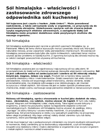 Sól himalajska – właściwości i zastosowanie zdrowszego odpowiednika soli kuchennej Sól kojarzona jest często z hasłem „biała śmierć”. Może powodować nadciśnienie, a także zatrzymanie wody w organizmie, co przyczynia się do powstawania obrzęków. Umiarkowane spożycie soli nie stwarza jednak ryzyka negatywnych efektów zdrowotnych, a zastąpienie białej soli himalajską może przynieść dodatkowo wiele pozytywnych skutków dla naszego organizmu. Sól himalajska Sól himalajska wydobywana jest ręcznie w górskich pasmach Himalajów np. w Pakistanie. Miliony lat temu słońce wysuszyło morza i powstały złoża soli, która jest naturalnie różowa, przez zawartość wielu pierwiastków chemicznych. Wcześniej sól himalajska zarezerwowana była tylko dla rodzin królewskich, natomiast teraz można używać jej bez problemu w każdej kuchni. Z ogromną korzyścią dla zdrowia można nią w całości zastąpić powszechnie używaną sól kuchenną. Sól himalajska – właściwości Sól himalajska uważana jest za najzdrowszą i najczystszą sól na całej ziemi. W przeciwieństwie do białej soli kuchennej wykazuje niezwykłe właściwości zdrowotne. Sól ta jest całkowicie wolna od zanieczyszczeń i zawiera aż 84 minerały między innymi jod, magnez, żelazo czy wapń. Produkt ten w bardzo łatwy sposób uzupełnia niedobory mikro i makroelementów. Dzięki zawartości tak wielu różnych pierwiastków, różowa sól wspomaga układ krwionośny, obniża ciśnienie, działa przeciwbakteryjnie, ma działanie odtruwające oraz detoksykujące, jak również oczyszcza z metali ciężkich. Sól różowa nie jest w żaden sposób przetwarzana chemicznie, dzięki czemu zachowuje swoje pierwotne składniki w nienaruszonym stanie. Sól himalajska – zastosowanie Różową sól himalajską, oprócz stosowania w kuchni jako dodatek do mięs, kasz, ziemniaków, czy sałatek, można używać do kąpieli. W tym celu należy wsypać kilogram soli himalajskiej i zalać ciepłą wodą. Taka kąpiel usuwa toksyny z organizmu, a także ma pozytywny wpływ na łagodzenie objawów schorzeń reumatologicznych. Dodatkowo sól himalajską można używać do peelingu, który „wyciąga” ze skóry toksyny i usuwa martwy naskórek, co przyspiesza jej regenerację. Sól przechowywana w słoiku czy specjalnym pojemniku na przyprawy łatwo ulega krystalizacji. Aby tego uniknąć należy dodać ziarenko ryżu lub laskę cynamonu, które pochłaniają łatwo wilgoć. Sól nie musi kojarzyć się z podwyższonym ciśnieniem czy innymi skutkami zdrowotnymi w momencie, kiedy zamienimy ją na doskonalszy odpowiednik, czyli sól himalajską. Uzupełni ona niedobory mikro i makro elementów w organizmie oraz oczyści organizm z metali ciężkich i wzmocni układ krwionośny. Kup sól himalajską z rabatem 3% już teraz ! (wpisz bonavita w polu „kod specjalny” w koszyku) Author: Anna Mielczarek Link do artykułu: http://bonavita.pl/sol-himalajska-wlasciwosci-i-zastosowaniezdrowszego-odpowiednika-soli-kuchennej
