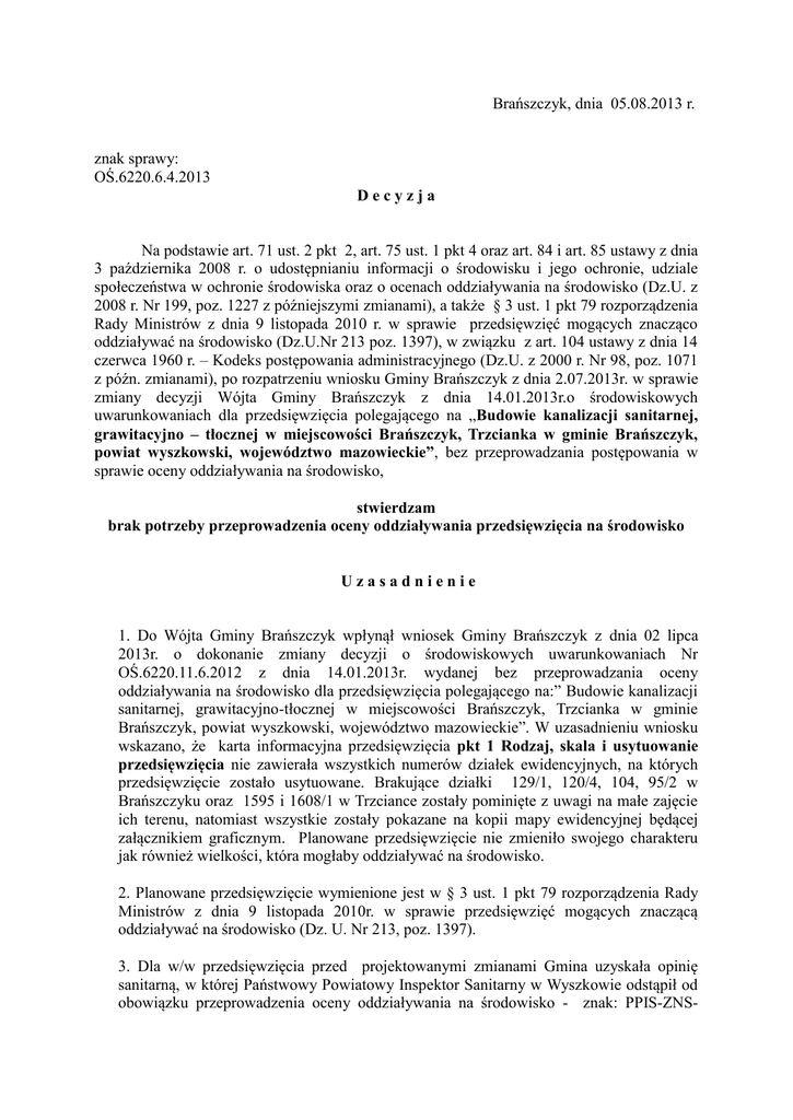 Brańszczyk, dnia 05.08.2013 r. znak sprawy: OŚ.6220.6.4.2013 Decyzja Na podstawie art. 71 ust. 2 pkt 2, art. 75 ust. 1 pkt 4 oraz art. 84 i art. 85 ustawy z dnia 3 października 2008 r. o udostępnianiu informacji o środowisku i jego ochronie, udziale społeczeństwa w ochronie środowiska oraz o ocenach oddziaływania na środowisko (Dz.U. z 2008 r. Nr 199, poz. 1227 z późniejszymi zmianami), a także § 3 ust. 1 pkt 79 rozporządzenia Rady Ministrów z dnia 9 listopada 2010 r. w sprawie przedsięwzięć mogących znacząco oddziaływać na środowisko (Dz.U.Nr 213 poz. 1397), w związku z art. 104 ustawy z dnia 14 czerwca 1960 r. – Kodeks postępowania administracyjnego (Dz.U. z 2000 r. Nr 98, poz. 1071 z późn. zmianami), po rozpatrzeniu wniosku Gminy Brańszczyk z dnia 2.07.2013r. w sprawie zmiany decyzji Wójta Gminy Brańszczyk z dnia 14.01.2013r.o środowiskowych uwarunkowaniach dla przedsięwzięcia polegającego na „Budowie kanalizacji sanitarnej, grawitacyjno – tłocznej w miejscowości Brańszczyk, Trzcianka w gminie Brańszczyk, powiat wyszkowski, województwo mazowieckie”, bez przeprowadzania postępowania w sprawie oceny oddziaływania na środowisko, stwierdzam brak potrzeby przeprowadzenia oceny oddziaływania przedsięwzięcia na środowisko Uzasadnienie 1. Do Wójta Gminy Brańszczyk wpłynął wniosek Gminy Brańszczyk z dnia 02 lipca 2013r. o dokonanie zmiany decyzji o środowiskowych uwarunkowaniach Nr OŚ.6220.11.6.2012 z dnia 14.01.2013r. wydanej bez przeprowadzania oceny oddziaływania na środowisko dla przedsięwzięcia polegającego na:” Budowie kanalizacji sanitarnej, grawitacyjno-tłocznej w miejscowości Brańszczyk, Trzcianka w gminie Brańszczyk, powiat wyszkowski, województwo mazowieckie”. W uzasadnieniu wniosku wskazano, że karta informacyjna przedsięwzięcia pkt 1 Rodzaj, skala i usytuowanie przedsięwzięcia nie zawierała wszystkich numerów działek ewidencyjnych, na których przedsięwzięcie zostało usytuowane. Brakujące działki 129/1, 120/4, 104, 95/2 w Brańszczyku oraz 1595 i 1608/1 w Trzciance zostały pominięte z uwagi na małe zajęcie ich terenu, natomiast wszystkie zostały pokazane na kopii mapy ewidencyjnej będącej załącznikiem graficznym. Planowane przedsięwzięcie nie zmieniło swojego charakteru jak również wielkości, która mogłaby oddziaływać na środowisko. 2. Planowane przedsięwzięcie wymienione jest w § 3 ust. 1 pkt 79 rozporządzenia Rady Ministrów z dnia 9 listopada 2010r. w sprawie przedsięwzięć mogących znaczącą oddziaływać na środowisko (Dz. U. Nr 213, poz. 1397). 3. Dla w/w przedsięwzięcia przed projektowanymi zmianami Gmina uzyskała opinię sanitarną, w której Państwowy Powiatowy Inspektor Sanitarny w Wyszkowie odstąpił od obowiązku przeprowadzenia oceny oddziaływania na środowisko - znak: PPIS-ZNS- 712/50/2012 z dnia 20.11.2012r. oraz opinię Regionalnego Dyrektora Ochrony Środowiska w Warszawie z dnia 13 grudnia 2012r. – Postanowienie znak:WOOŚII.4240.1430.2012.OŁ, zgodnie z którym nie ma konieczności przeprowadzania oceny oddziaływania na środowisko. 4. W związku z wnioskiem Gminy Brańszczyk z dnia 02 lipca 2013r. o dokonanie zmiany decyzji Wójta Gminy Brańszczyk o środowiskowych uwarunkowaniach OŚ.6220.11.6.2012 z dnia 14.01.2013r. wydanej bez przeprowadzania oceny oddziaływania na środowisko dla przedsięwzięcia polegającego na:” Budowie kanalizacji sanitarnej, grawitacyjno-tłocznej w miejscowości Brańszczyk, Trzcianka w gminie Brańszczyk, powiat wyszkowski, województwo mazowieckie”, zgodnie z art. 64 ustawy z dnia 3 października 2008r. o udostępnianiu informacji o środowisku i jego ochronie, udziale społeczeństwa w ochronie środowiska oraz ocenach oddziaływania na środowisko (Dz. U. Nr 199, poz. 1227 ze zm.), organ prowadzący postępowanie wystąpił o opinię co do potrzeby przeprowadzenia oceny oddziaływania na środowisko oraz co do zakresu ewentualnego raportu do Regionalnego Dyrektora Ochrony Środowiska w Warszawie oraz do Państwowego Powiatowego Inspektora Sanitarnego w Wyszkowie. 5. Organy te wydały: - Państwowy Powiatowy Inspektor Sanitarny w Wyszkowie – opinię sanitarną z dnia 11.07.2013r. znak: PPIS-ZNS-712/47/2012 w której stwierdził brak potrzeby przeprowadzania oceny oddziaływania na środowisko dla przedmiotowej inwestycji. - Regionalny Dyrektor Ochrony Środowiska w Warszawie – postanowienie z dnia 22 lipca 2013r. znak: WOOŚ-II.4240.984.2013. AWI stwierdzające brak potrzeby przeprowadzenia oceny oddziaływania na środowisko dla powyższego przedsięwzięcia. 6. Wójt Gminy Brańszczyk po przeanalizowaniu dostarczonych wraz z wnioskiem materiałów, uwzględniając łącznie uwarunkowania wymienione w art. 63 ust. 1 ustawy z dnia 3 października 2008r. o udostępnianiu informacji o środowisku i jego ochronie, udziale społeczeństwa w ochronie środowiska oraz o ocenach oddziaływania na środowisko, podzielił opinię wyrażoną przez Regionalnego Dyrektora Ochrony Środowiska w Warszawie oraz Państwowego Powiatowego Inspektora Sanitarnego Wyszkowie co do braku konieczności przeprowadzenia oceny oddziaływania przedsięwzięcia na środowisko. Wójt Gminy Brańszczyk nie stwierdził potrzeby przeprowadzenia oceny oddziaływania przedmiotowego przedsięwzięcia na środowisko, argumentując to w odniesieniu do poszczególnych uwarunkowań w następujący sposób: 1. Rodzaj i charakterystyka przedsięwzięcia, uwzględnieniem: a) skali przedsięwzięcia i wielkości zajmowanego terenu oraz ich wzajemnych proporcji: Planowane przedsięwzięcie polegać będzie na budowie kanalizacji sanitarnej, grawitacyjno-tłocznej na działkach o nr ewidencyjnych 82, 129/1, 120/4, 104, 95/2 w miejscowości Brańszczyk oraz na działkach o nr ewidencyjnych 1595, 1609/3, 1608/1 i 1609/1 w miejscowości Trzcianka w gminie Brańszczyk, powiat wyszkowski, województwo mazowieckie. W ramach planowanego przedsi