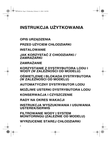 3pl33089.fm Page 4 Wednesday, February 11, 2004 5:40 PM INSTRUKCJA UŻYTKOWANIA OPIS URZĄDZENIA PRZED UŻYCIEM CHŁODZIARKI INSTALOWANIE JAK KORZYSTAĆ Z CHłODZIARKI / ZAMRAŻARKI ZAMRAŻANIE KORZYSTANIE Z DYSTRYBUTORA LODU I WODY (W ZALEŻNOŚCI OD MODELU) OŚWIETLENIE I BLOKADA DYSTRYBUTORA (W ZALEŻNOŚCI OD MODELU) AUTOMATYCZNY DYSTRYBUTOR LODU MOŻLIWE USTERKI DYSTRYBUTORA LODU KONSERWACJA I CZYSZCZENIE RADY NA OKRES WAKACJI INSTRUKCJA WYSZUKIWANIA I USUWANIA USTEREK/SERWIS FILTROWANIE WODY I SYSTEM MONITORINGU (ZALEŻNIE OD MODELU) WYRZUCENIE STAREJ CHŁODZIARKI 4 3pl33089.fm Page 5 Wednesday, February 11, 2004 5:40 PM OPIS URZĄDZENIA Komora zamrażarki S. Automatyczny dystrybutor lodu T. Kratki U. Kosz dolny (zależnie od modelu) V. Górny kosz W. Pojemnik na kostki lodu X. Wkładka do wewnętrznej strony drzwiczek zamrażarki Y. Półki drzwiowe po wewnętrznej stronie drzwiczek zamrażarki Z. Górna wewnętrzna lampka (oraz dolna wewnętrzna lampka, zależnie od modelu) Komora chłodziarki A. Lampka wewnętrzna B. Lampka środkowa (zależnie od modelu) C. Półka regulowana D. Pokrywa szuflady E. Szuflada (zależnie od modelu) F. Szuflada na owoce i jarzyny G. Regulacja szuflady na owoce i jarzyny H. Szuflada na mięso I. Regulacja szuflady na mięso L. Komora M. Półka drzwiowa (z uchwytem na butelki, zależnie od modelu) N. 2-litrowa półka drzwiowa (z uchwytem na butelki, zależnie od modelu) O. 0,75-litrowa półka drzwiowa P. Przegroda półki (zależnie od modelu) Q. Półka na jajka R. Filtr wody (zależnie od modelu) 5 3pl33089.fm Page 6 Wednesday, February 11, 2004 5:40 PM PRZED UŻYCIEM CHŁODZIARKI • Po rozpakowaniu urządzenia należy upewnić się, czy nie jest ono uszkodzone oraz czy drzwi dokładnie się zamykają. Ewentualne szkody powinny być zgłoszone sprzedawcy w ciągu 24 godzin od dostawy. • Opakowanie nadaje się do powtórnego przetworzenia i jest oznaczone symbolem . • Urządzenie jest wyprodukowane przy zastosowaniu materiałów nadających się do powtórnego przetworzenia. Przy złomowaniu należy stosować się do lokalnych przepisów ochrony środowiska. Aby zapobiec niebezpieczeństwu zatrzaśnięcia się dzieci wewnątrz chłodziarki i, w konsekwencji, ich uduszenia się, nie wolno dopuścić, aby dzieci bawiły się lub chowały wewnątrz chłodziarki. Przed złomowaniem, należy uniemożliwić użytkowanie chłodziarki usuwając drzwiczki i odcinając przewód zasilający. Proszę nie porzucać urządzenia, ale oddać je do złomowania w odpowiednich punktach zbiórki surowców wtórnych, celem odzyskania gazów chłodniczych. • Urządzenie powinno być podłączone i zainstalowane przez wykwalifikowanego technika, zgodnie z instrukcją producenta i lokalnymi przepisami bezpieczeństwa. Deklaracja zgodności • Urządzenie przeznaczone jest do przechowywania artykułów spożywczych i jest wyprodukowane zgodne z Dyrektywą Rady nr: 89/109/ EWG. • Niniejsze urządzenie jest zaprojektowane, wyprodukowane i sprzedawane w zgodzie z: • - wymogami dotyczącymi bezpieczeństwa Dyrektywy Rady dot. niskiego napięcia nr: 73/23/EWG; - wymogami zabezpieczeń w zakresie zgodności elektromagnetycznej wynikającymi z Dyrektywy nr 89/336/EWG, zmienioną przez Dyrektywę nr 93/68/EWG. Urządzenie nie zawiera CFC. Więcej szczegółów znajduje się na tabliczce znamionowej na urządzeniu. Środki ostrożności i zalecenia ogólne • Komora chłodnicza powinna być używana wyłącznie do przechowywania świeżych produktów żywnościowych, natomiast komora zamrażarki wyłącznie do przechowywania mrożonek, zamrażania świeżych produktów i wytwarzania kostek lodu. • Po zainstalowaniu upewnić się, czy chłodziarka nie stoi na przewodzie zasilającym. • Nie należy przechowywać szklanych pojemników w chłodziarce, gdyż mogą eksplodować. • Kostki lodu lub sople nie powinny być wkładane do ust zaraz po wyjęciu z komory zamrażalnika, gdyż może to spowodować odmrożenia. • Przed przeprowadzeniem jakiejkolwiek naprawy lub przed czyszczeniem należy zawsze odłączyć urządzenie od zasilania. • Nie przechowywać gazoliny czy innych gazów lub płynów łatwopalnych w pobliżu urządzenia. Opary mogą stworzyć zagrożenie wybuchowe. INSTALOWANIE • Upewnić się, że chłodziarka nie stoi obok źródła ciepła. • Instalować w suchym pomieszczeniu o dobrej wentylacji. • W celu zapewnienia właściwej wentylacji należy pozostawić z obydwu boków i ponad nią 1 cm wolnej przestrzeni. • Przed użyciem, wnętrze chłodziarki należy wyczyścić. • Nie należy jej przesuwać co najmniej przez godzinę przed jej podłączeniem do zasilania. • Urządzenie należy podłączyć do źródła wody pitnej lub chemicznie oczyszczonej. • Zainstalować i wypoziomować chłodziarkę na podłożu, które wytrzyma jej ciężar oraz w pomieszczeniu odpowiednim do jej wymiarów oraz zastosowania. • Nie korzystać z chłodziarki w pomieszczeniach, w których temperatura może spaść poniżej 13°C. • Przy przesuwaniu urządzenia, należy uważać, aby nie uszkodzić podłogi (np. parkietu). 6 3pl33089.fm Page 7 Wednesday, February 11, 2004 5:40 PM JAK KORZYSTAĆ Z CHłODZIARKI / ZAMRAŻARKI • Podłączyć urządzenie do zasilania oraz do instalacji wodnej (patrz instrukcja instalacji). • Gdy urządzenie jest podłączone do zasilania, na wyświetlaczu zamrażarki pojawią się dwa myślniki i będą świecić dopóki nie osiągnie się optymalnej temperatury. Wyświetlacz chłodziarki będzie wskazywał temperaturę 5°C (ustawienie fabryczne). • Gdy urządzenie jest ciepłe, zacznie migać czerwona dioda alarmowa i rozlegnie się alarm dźwiękowy, wskazując, że urządzenie jeszcze nie osiągnęło optymalnej temperatury przechowywania artykułów żywnościowych. • Nacisnąć przycisk Reset , aby wyłączyć alarm dźwiękowy. • Czerwona dioda przestanie migać, gdy temperatura w komorze zamrażarki osią