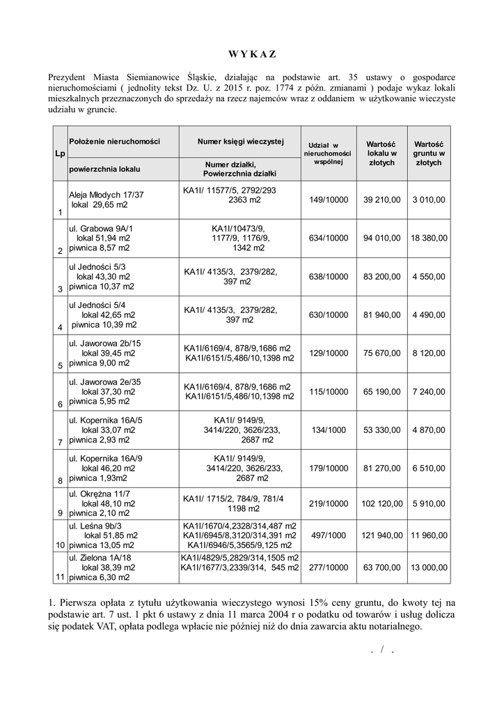 WYKAZ Prezydent Miasta Siemianowice Śląskie, działając na podstawie art. 35 ustawy o gospodarce nieruchomościami ( jednolity tekst Dz. U. z 2015 r. poz. 1774 z późn. zmianami ) podaje wykaz lokali mieszkalnych przeznaczonych do sprzedaży na rzecz najemców wraz z oddaniem w użytkowanie wieczyste udziału w gruncie. Położenie nieruchomości Numer księgi wieczystej Lp powierzchnia lokalu 1 Aleja Młodych 17/37 lokal 29,65 m2 ul. Grabowa 9A/1 lokal 51,94 m2 2 piwnica 8,57 m2 Numer działki, Powierzchnia działki KA1I/ 11577/5, 2792/293 2363 m2 KA1I/10473/9, 1177/9, 1176/9, 1342 m2 Udział w nieruchomości wspólnej Wartość lokalu w złotych Wartość gruntu w złotych 149/10000 39 210,00 3 010,00 634/10000 94 010,00 18 380,00 ul Jedności 5/3 lokal 43,30 m2 piwnica 10,37 m2 3 KA1I/ 4135/3, 2379/282, 397 m2 638/10000 83 200,00 4 550,00 ul Jedności 5/4 lokal 42,65 m2 piwnica 10,39 m2 4 KA1I/ 4135/3, 2379/282, 397 m2 630/10000 81 940,00 4 490,00 ul. Jaworowa 2b/15 lokal 39,45 m2 5 piwnica 9,00 m2 KA1I/6169/4, 878/9,1686 m2 KA1I/6151/5,486/10,1398 m2 129/10000 75 670,00 8 120,00 ul. Jaworowa 2e/35 lokal 37,30 m2 piwnica 5,95 m2 6 KA1I/6169/4, 878/9,1686 m2 KA1I/6151/5,486/10,1398 m2 115/10000 65 190,00 7 240,00 ul. Kopernika 16A/5 lokal 33,07 m2 piwnica 2,93 m2 7 KA1I/ 9149/9, 3414/220, 3626/233, 2687 m2 134/1000 53 330,00 4 870,00 ul. Kopernika 16A/9 lokal 46,20 m2 8 piwnica 1,93m2 KA1I/ 9149/9, 3414/220, 3626/233, 2687 m2 179/10000 81 270,00 6 510,00 KA1I/ 1715/2, 784/9, 781/4 1198 m2 219/10000 102 120,00 5 910,00 497/1000 121 940,00 11 960,00 277/10000 63 700,00 ul. Okrężna 11/7 lokal 48,10 m2 9 piwnica 2,10 m2 ul. Leśna 9b/3 lokal 51,85 m2 10 piwnica 13,05 m2 ul. Zielona 1A/18 lokal 38,39 m2 11 piwnica 6,30 m2 KA1I/1670/4,2328/314,487 m2 KA1I/6945/8,3120/314,391 m2 KA1I/6946/5,3565/9,125 m2 KA1I/4829/5,2829/314,1505 m2 KA1I/1677/3,2339/314, 545 m2 13 000,00 1. Pierwsza opłata z tytułu użytkowania wieczystego wynosi 15% ceny gruntu, do kwoty tej na podstawie art. 7 ust. 1 pkt 6 ustawy z dnia 11 marca 2004 r o podatku od towarów i usług dolicza się podatek VAT, opłata podlega wpłacie nie później niż do dnia zawarcia aktu notarialnego. . / . - 2 2. Opłata roczna z tytułu użytkowania wieczystego wynosi 1% cena gruntu, do kwoty tej na podstawie art. 7 ust. 1 pkt 6 ustawy z dnia 11 marca 2004 r o podatku od towarów i usług dolicza się podatek VAT. Opłaty roczne wnosi się przez cały okres użytkowania wieczystego, w terminie do dnia 31 marca każdego roku, z góry za dany rok. 3. Wysokość opłaty rocznej z tytułu użytkowania wieczystego gruntu, może być aktualizowana, nie częściej niż raz na 3 lata, jeżeli wartość gruntu ulegnie zmianie. 4. Zgodnie z planem zagospodarowania przestrzennego miasta, nieruchomości lokalowe objęte wykazem oznaczone zostały symbolem MU I „ obszar mieszkaniowo-usługowy intensywnej zabudowy” 5. Osoby, którym przysługuje pierwszeństwo w nabyciu przedmiotowych nieruchomości lokalowych, na podstawie art. 34 ust. 1 pkt. 3 cytowanej na wstępie ustawie, mogą składać odpowiednie wnioski w terminie 6 tygodni, od dnia wywieszenia wykazu. Wykaz wywiesza się na okres 21 dni. Wywieszono dnia ….................................. Zdjęto dnia DK …..................................