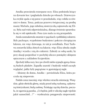 Anulka przecierała rozespane oczy. Eliza podniosła leżący na dywanie koc i pogłaskała dziecko po włosach. Dziewczynka zwykle spała o tej porze w przedszkolu, więc robiła to również w domu. Teraz, podczas przerwy świątecznej, na prośbę mamy Michała, jego młodszą siostrzyczką zajmowała się Eliza. Była nad wiek odpowiedzialna, dlatego świetnie sprawdzała się w roli opiekunki. Poza tym mała za nią przepadała. Anula zasmakowała ostatnio w pączkach z pobliskiej cukierni. Były pachnące, wypełnione budyniem i pokryte chrupiącym lukrem, nic więc dziwnego, że tak je uwielbiała. Pani Tarłowa zostawiła kilka złotych na łakocie, więc Eliza ubrała ciepło Anulkę i wyszła z nią do cukierni. Zabrały ze sobą sanki, by przy okazji pozjeżdżać w pochyłej uliczce pomiędzy sklepem optycznym a zakładem fryzjerskim. Zjechały kilka razy, lecz po chwili niebo sypnęło gęstą chmarą białych płatków. Zapadła szarość i budynki wokół zaczęły wyglądać, jakby były pogrążone w gęstniejącej mgle. – Idziemy do domu, Anulko – powiedziała Eliza, która poczuła się niepewnie. Padało coraz mocniej, więc wkrótce straciła orientację. Wszędzie, gdzie obróciła głowę, miała przed sobą ruchomą, cętkowaną śnieżynkami, białą zasłonę. Ściskając rączkę dziecka, poczuła, że ogarnia ją panika. „Co będzie, jeśli w uliczkę nagle wjedzie jakiś samochód…?” – wyobraźnia potęgowała niepewność. 21 Dziewczynki tkwiły w zadymce niczym w egipskich ciemnościach, tyle że śnieżnobiałych. Trudno było uwierzyć, że znajdują się w odległości dwudziestu metrów od głównej ulicy miasta. Docierały tu wprawdzie odgłosy przejeżdżających samochodów, jednakże były stłumione niczym watą i nie można było określić, skąd dochodzą. Eliza była zupełnie zdezorientowana. „Nie mam pojęcia, w którą stronę pójść!” – rozpaczała w myślach, przytulając do siebie Anulkę. Nagle poczuła, że tuż obok jej stóp… poruszyło się z metalicznym dźwiękiem coś dużego. Nie zdążyła mrugnąć okiem, gdy ujrzała przed sobą osobnika, który wyrósł jak spod ziemi. Wyglądał tak, jakby wylazł nie ze śnieżnej dujawicy, lecz spod rynny podczas ulewy. Dosłownie ociekał wodą, kosmyki jego przydługich włosów przylepione były do policzków, zaś mokra kurtka wisiała na nim jak łachman. – Którędy do jeziora? – spytał, szeroko ziewając. I od razu dodał: – Zresztą, nieważne… – i zniknął równie szybko, jak się pojawił. 22 11
