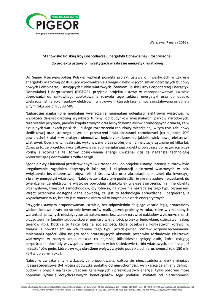 Warszawa, 7 marca 2016 r. Stanowisko Polskiej Izby Gospodarczej Energetyki Odnawialnej i Rozproszonej do projektu ustawy o inwestycjach w zakresie energetyki wiatrowej Do Sejmu Rzeczypospolitej Polskiej wpłynął poselski projekt ustawy o inwestycjach w zakresie energetyki wiatrowej postulujący wprowadzenie szeregu daleko idących zmian dotyczących budowy nowych i eksploatacji istniejących turbin wiatrowych. Zdaniem Polskiej Izby Gospodarczej Energetyki Odnawialnej i Rozproszonej (PIGEOR), przyjęcie projektu ustawy w zaproponowanym kształcie doprowadzi do całkowitego zablokowania rozwoju tego sektora energetyki oraz do upadku większości istniejących parków elektrowni wiatrowych, których łączna moc zainstalowana osiągnęła w tym roku poziom 5300 MW. Najbardziej nagłośnione medialnie wyznaczenie minimalnej odległości elektrowni wiatrowej, w wysokości dziesięciokrotnej wysokości turbiny, od budynków mieszkalnych, parków narodowych, rezerwatów przyrody, parków krajobrazowych oraz leśnych kompleksów promocyjnych oznacza, że w aktualnych warunkach polskich – dużego rozproszenia zabudowy mieszkalnej, w tym tzw. zabudowy siedliskowej oraz istotnego nasycenia przestrzeni kraju obszarami chronionymi (co najmniej 40% powierzchni kraju) – w praktyce niemożliwe będzie zlokalizowanie jakiejkolwiek nowej elektrowni wiatrowej. Oceny w tym zakresie, wykonywane przez profesjonalne instytucje są znane od kilku lat. Oznacza to, że projektodawcy całkowicie świadomie zgłaszają projekt prowadzący do rezygnacji przez Polskę z rozwijania tej formy pozyskiwania energii uważanej dziś za najtańszą technologię wykorzystującą odnawialne źródła energii. Zgodnie z wyjaśnieniami przedstawionymi w uzasadnieniu do projektu ustawy, intencją autorów było uregulowanie zagadnień dotyczących lokalizacji i eksploatacji elektrowni wiatrowych w celu zwiększenia bezpieczeństwa obywateli i środowiska oraz akceptacji społecznej dla inwestycji z branży energetyki wiatrowej. Należy w związku z tym podkreślić, że nie ma żadnych przesłanek do twierdzenia, że elektrownie wiatrowe powodują jakiekolwiek większe zagrożenia, niż inne obiekty przemysłowe, transport samochodowy, czy lotniczy, na które nie nakłada się tego typu ograniczeń. Wręcz przeciwnie dostępne dane dowodzą, że jest to technologia sprawdzona i bezpieczna, a wypadkowość w tej branży jest znacznie niższa niż w innych obiektach energetycznych. Przyjęcie ustawy w proponowanym kształcie, bez odpowiednio długiego vacatio legis, oznaczałoby wielomilionowe straty po stronie inwestorów realizujących projekty w toku, które w zmienionych warunkach prawnych musiałyby zostać zakończone, bez szansy na zwrot nakładów wyłożonych na ich przygotowanie (analizy środowiskowe, pomiary wietrzności, projekty budowlane, dzierżawy i zakup terenów itp.). Dotknie to także lokalne społeczności, które oczekiwały konkretnych korzyści w związku z powstaniem na ich terenie tego typu przedsięwzięć. Wbrew rozpowszechnionemu mniemaniu oprócz kliku tysięcy osób protestujących aktywnie przeciwko rozbudowie elektrowni wiatrowych w naszym kraju mieszka co najmniej kilkadziesiąt tysięcy osób, które osiągają bezpośrednie dochody w związku z powstaniem w ich sąsiedztwie turbin wiatrowych, nie licząc już mieszkańców gmin, które uzyskują określone wpływy z tytułu podatku od nieruchomości (ok. 150 mln PLN w ubiegłym roku). Należy w związku z tym wskazać, że proponowana, całkowicie nieuzasadniona, dyskryminująca i bezprecedensowa 3-4 krotna podwyżka podatku od nieruchomości, wynikająca ze zmiany definicji budowli i objęcia nią także urządzeń generujących i przekazujących energię, tylko pozornie może poprawić sytuację dotychczasowych beneficjentów tego podatku. Podatek od nieruchomości Polska Izba Gospodarcza Energetyki Odnawialnej i Rozproszonej ul. Gotarda 9, 02-683 Warszawa, tel. + 48 (22) 548 4999, fax + 48 (22) 548 4998, www.pigeor.pl, [email protected] BNP PARIBAS FORTIS Fortis Bank Polska S.A. Oddział Warszawa 54 1600 1127 0003 0122 3528 8001 NIP 5213317108, KRS 0000222568, REGON: 015880073 naliczany według aktualnych przepisów obciąża 1 MWh energii wytworzonej w typowej elektrowni wiatrowej o względnie dobrej produktywności kwotą1 15-17 zł/MWh. Uznanie za podstawę opodatkowania całego nakładu inwestycyjnego oznacza wzrost tego obciążenia do co najmniej 60 zł/MWh, co według aktualnych cen rynkowych oznaczałoby obciążenie przychodów ze sprzedaży energii elektrycznej na poziomie 35-40%. Byłaby to danina bezprecedensowa i nieznana w żadnej innej branży, której wytwórca nie mógłby w żaden sposób skompensować sobie wzrostem cen sprzedawanej energii, gdyż jest ona kształtowana przez rynek lub ustalana jako cena urzędowa przez Prezesa Urzędu Regulacji Energetyki. Większość istniejących przedsiębiorstw wiatrowych nie byłoby w stanie unieść takiego obciążenia i znalazłoby się w sytuacji zmuszającej do ogłoszenia upadłości. Przejęcie masy upadłościowej przez banki lub innych przedsiębiorców prowadziłoby w wielu przypadkach do faktycznego zaprzestania działalności i sprzedaży turbin oraz elementów wież do krajów trzecich. Propozycje projektodawców nijak się mają także do wypowiedzi przedstawicieli rządu, którzy oczekują, że branża wiatrowa w coraz większym stopniu rozwijając się będzie na warunkach rynkowych, przy malejącej lub całkowicie wycofanej pomocy ze strony państwa. Nałożenie takiej bezprecedensowej i nieznanej w innych branżach daniny oznacza, że elektrownie wiatrowe nigdy nie będą w stanie takiego postulatu spełnić. Dodatkowe obciążenie, nieznajdujące uzasadnienia ani we wskaźnikach wypadkowości, ani też w realnych nakładach stanowić ma danina na rzecz Urzędu Dozoru Technicznego. Abstrahując już od faktu, że instytucja ta to relikt z czasów PRL, nie maj