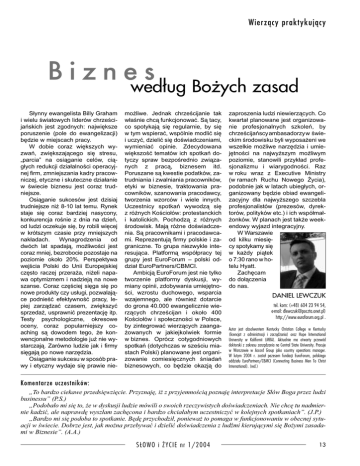Wierzący praktykujący B i z n ewedług s Bożych zasad Słynny ewangelista Billy Graham i wielu światowych liderów chrześcijańskich jest zgodnych: największe poruszenie (pole do ewangelizacji) będzie w miejscach pracy. W dobie coraz większych wyzwań, zwiększającego się stresu, „parcia” na osiąganie celów, ciągłych redukcji działalności operacyjnej firm, zmniejszania kadry pracowniczej, etyczne i skuteczne działanie w świecie biznesu jest coraz trudniejsze. Osiąganie sukcesów jest dzisiaj trudniejsze niż 8-10 lat temu. Rynek staje się coraz bardziej nasycony, konkurencja rośnie z dnia na dzień, od ludzi oczekuje się, by robili więcej w krótszym czasie przy mniejszych nakładach. Wynagrodzenia od dwóch lat spadają, możliwości jest coraz mniej, bezrobocie pozostaje na poziomie około 20%. Perspektywa wejścia Polski do Unii Europejskiej często raczej przeraża, niżeli napawa optymizmem i nadzieją na nowe szanse. Coraz częściej sięga się po nowe produkty czy usługi, pozwalające podnieść efektywność pracy, lepiej zarządzać czasem, zwiększyć sprzedaż, usprawnić prezentację itp. Testy psychologiczne, okresowe oceny, coraz popularniejszy coaching są dowodem tego, że konwencjonalne metodologie już nie wystarczają. Zarówno ludzie jak i firmy sięgają po nowe narzędzia. Osiąganie sukcesu w sposób prawy i etyczny wydaje się prawie nie- możliwe. Jednak chrześcijanie tak właśnie chcą funkcjonować. Są tacy, co spotykają się regularnie, by się w tym wspierać, wspólnie modlić się i uczyć, dzielić się doświadczeniami, wymieniać opinie. Zdecydowana większość tematów ich spotkań dotyczy spraw bezpośrednio związanych z pracą, biznesem itd. Poruszane są kwestie podatków, zatrudniania i zwalniania pracowników, etyki w biznesie, traktowania pracowników, szanowania pracodawcy, tworzenia wzorców i wiele innych. Uczestnicy spotkań wywodzą się z różnych Kościołów: protestanckich i katolickich. Pochodzą z różnych środowisk. Mają różne doświadczenia. Są pracownikami i pracodawcami. Reprezentują firmy polskie i zagraniczne. To grupa niezwykle interesująca. Platformą współpracy tej grupy jest EuroForum – polski oddział EuroPartners/CBMCI. Ambicją EuroForum jest nie tylko tworzenie platformy dyskusji, wymiany opinii, zdobywania umiejętności, wzrostu duchowego, wsparcia wzajemnego, ale również dotarcie do grona 40.000 ewangelicznie wierzących chrześcijan i około 400 Kościołów i społeczności w Polsce, by zintegrować wierzących zaangażowanych w jakiejkolwiek formie w biznes. Oprócz cotygodniowych spotkań (dotychczas w sześciu miastach Polski) planowane jest organizowanie comiesięcznych śniadań biznesowych, co będzie okazją do zaproszenia ludzi niewierzących. Co kwartał planowane jest organizowanie profesjonalnych szkoleń, by chrześcijańscy ambasadorzy w świeckim środowisku byli wyposażeni we wszelkie możliwe narzędzia i umiejętności na najwyższym możliwym poziomie, stanowili przykład profesjonalizmu i wiarygodności. Raz w roku wraz z Executive Ministry (w ramach Ruchu Nowego Życia), podobnie jak w latach ubiegłych, organizowany będzie obiad ewangelizacyjny dla najwyższego szczebla profesjonalistów (prezesów, dyrektorów, polityków etc.) i ich współmałżonków. W planach jest także weekendowy wyjazd integracyjny. W Warszawie od kilku miesięcy spotykamy się w każdy piątek o 7:30 rano w hotelu Hyatt. Zachęcam do dołączenia do nas. DANIEL LEWCZUK tel. kom: (+48) 604 23 94 54, e-mail: [email protected]) http://www.euroforum.org.pl . Autor jest absolwentem Kentucky Christian College w Kentucky (licencjat z administracji i zarządzania) oraz Hope International University w Kalifornii (MBA). Aktualnie ma otwarty przewód doktorski z zakresu zarządzania na Central State University. Pracuje w Warszawie w Accord Group jako country operations manager. W lutym 2004 r. został pezesem fundacji EuroForum, polskiego oddziału EuroPartners/CBMCI (Connecting Business Men To Christ International). (red.) Komentarze uczestników: „To bardzo ciekawe przedsięwzięcie. Przyznaję, iż z przyjemnością poznaję interpretacje Słów Boga przez ludzi businessu” (P.S.) „Podobało mi się to, że w dyskusji ludzie mówili o swoich rzeczywistych doświadczeniach. Nie chcę tu nadmiernie kadzić, ale naprawdę wyszłam zachęcona i bardzo chciałabym uczestniczyć w kolejnych spotkaniach”. (J.P.) „Bardzo mi się podoba to spotkanie. Będę przychodził, ponieważ to pomaga w funkcjonowaniu w obecnej sytuacji w świecie. Dobrze jest, jak można przebywać i dzielić doświadczenia z ludźmi kierującymi się Bożymi zasadami w Biznesie”. (A.A.) S£ OW O i ¯ YCI E nr 1/2004 13