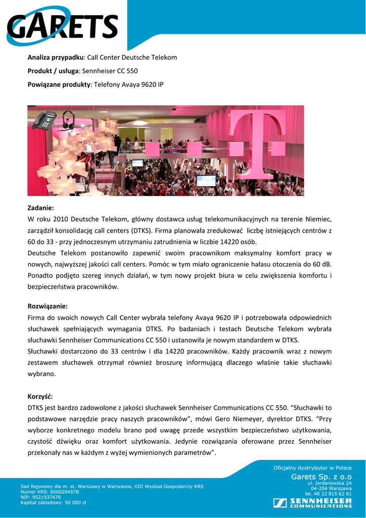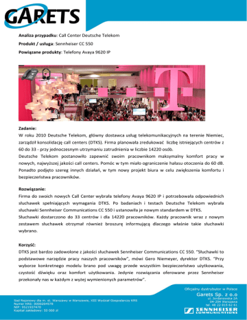 Analiza przypadku: Call Center Deutsche Telekom Produkt / usługa: Sennheiser CC 550 Powiązane produkty: Telefony Avaya 9620 IP Zadanie: W roku 2010 Deutsche Telekom, główny dostawca usług telekomunikacyjnych na terenie Niemiec, zarządził konsolidację call centers (DTKS). Firma planowała zredukować liczbę istniejących centrów z 60 do 33 ‐ przy jednoczesnym utrzymaniu zatrudnienia w liczbie 14220 osób. Deutsche Telekom postanowiło zapewnić swoim pracownikom maksymalny komfort pracy w nowych, najwyższej jakości call centers. Pomóc w tym miało ograniczenie hałasu otoczenia do 60 dB. Ponadto podjęto szereg innych działań, w tym nowy projekt biura w celu zwiększenia komfortu i bezpieczeństwa pracowników. Rozwiązanie: Firma do swoich nowych Call Center wybrała telefony Avaya 9620 IP i potrzebowała odpowiednich słuchawek spełniających wymagania DTKS. Po badaniach i testach Deutsche Telekom wybrała słuchawki Sennheiser Communications CC 550 i ustanowiła je nowym standardem w DTKS. Słuchawki dostarczono do 33 centrów i dla 14220 pracowników. Każdy pracownik wraz z nowym zestawem słuchawek otrzymał również broszurę informującą dlaczego właśnie takie słuchawki wybrano. Korzyść: DTKS jest bardzo zadowolone z jakości słuchawek Sennheiser Communications CC 550. “Słuchawki to podstawowe narzędzie pracy naszych pracowników”, mówi Gero Niemeyer, dyrektor DTKS. “Przy wyborze konkretnego modelu brano pod uwagę przede wszystkim bezpieczeństwo użytkowania, czystość dźwięku oraz komfort użytkowania. Jedynie rozwiązania oferowane przez Sennheiser przekonały nas w każdym z wyżej wymienionych parametrów”.