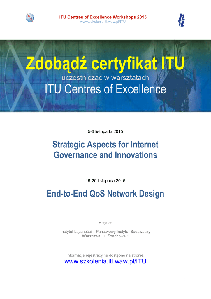 ITU Centres of Excellence Workshops 2015 www.szkolenia.itl.waw.pl/ITU . Zdobądź certyfikat ITU uczestnicząc w warsztatach ITU Centres of Excellence 5-6 listopada 2015 Strategic Aspects for Internet Governance and Innovations 19-20 listopada 2015 End-to-End QoS Network Design Miejsce: Instytut Łączności – Państwowy Instytut Badawaczy Warszawa, ul. Szachowa 1 Informacje rejestracyjne dostępne na stronie: www.szkolenia.itl.waw.pl/ITU 1 ITU Centres of Excellence Workshops 2015 www.szkolenia.itl.waw.pl/ITU Program Warsztatów Strategic Aspects for Internet Governance and Innovations 5-6 listopada 2015 Dzień 1. (9:30 – 10:00) – REGISTRATION (10:00 – 11:00) – Convergence in Telecommunications toward Internet (11:00 – 11:30) – COFFEE BREAK (11:30 – 13:00) – Broadband Strategies and Innovations (13:00 – 14:00) – LUNCH BREAK (14:00 – 15:00) – Internet Standardization and Policy (15:00 – 15:30) – Innovation management in ICT (15:30 – 16:00) – COFFEE BREAK (16:00 – 17:00) – Google model vs. Apple model Dzień 2. (10:00 – 11:00) – Mobile and Internet telephony (11:00 – 11:30) – COFFEE BREAK (11:30 – 13:00) – IPTV innovations (13:00 – 14:00) – LUNCH BREAK (14:00 – 14:45) – Innovative services and applications (14:45 – 15:00) – Network neutrality (15:30 – 16:00) – COFFEE BREAK (16:00 – 17:00) – Management and regulation of Internet 2 ITU Centres of Excellence Workshops 2015 www.szkolenia.itl.waw.pl/ITU Program Warsztatów End-to-End QoS Network Design 19-20 listopada 2015 Dzień 1. (9:30 – 10:00) – REGISTRATION (10:00 – 11:00) – QoS Design Strategies (11:00 – 11:30) – COFFEE BREAK (11:30 – 13:00) – QoS Design Strategies (13:00 – 14:00) – LUNCH BREAK (14:00 – 15:00) – Campus QoS Design (15:00 – 15:30) – Wireless LAN QoS Design (15:30 – 16:00) – COFFEE BREAK (16:00 – 17:00) – Data Center QoS Design Dzień 2. (10:00 – 11:00) – WAN and Branch QoS Design (11:00 – 11:30) – COFFEE BREAK (11:30 – 13:00) – WAN and Branch QoS Design (13:00 – 14:00) – LUNCH BREAK (14:00 – 14:45) – MPLS VPN QoS Design (14:45 – 15:00) – MPLS VPN QoS Design (15:30 – 16:00) – COFFEE BREAK (16:00 – 17:00) – IPsec QoS Design 3 ITU Centres of Excellence Workshops 2015 www.szkolenia.itl.waw.pl/ITU Ważne informacje Płatność Koszt udziału w jednych warsztatach wynosi 500 USD. Wpłata powinna być dokonana przed rozpoczęciem Warsztatów bezpośrednio na konto ITU. Faktura za udział w Warsztatach zostanie wystawiona przez ITU po zakończeniu szkolenia. Miejsce realizacji Ośrodek Szkolenia Instytutu Łączności, ul. Szachowa 1, Warszawa, sala 754. Język wykładowy Angielski Tryb rejestracji 1. Prześlij na adres [email protected] swoje imię i nazwisko, nazwę firmy oraz numer telefonu kontaktowego jak również tytuł warsztatów, którymi jesteś zainteresowany. 2. Po otrzymaniu zwrotnie potwierdzenia o możliwości wzięcia udziału w warsztatach dokonaj wpłaty kwoty kosztu udziału na konto ITU i prześlij na powyższy adres potwierdzenie dokonania przelewu. Certyfikat Szkolenie kończy się egzaminem. Uczestnicy, którzy pomyślnie go zdadzą otrzymają certyfikat sygnowany przez ITU. ITU BANK ACCOUNT DETAILS Name and Address of UBS SA Bank: Case postale 2600 CH 1211 Geneva 2 Switzerland Beneficiary: Union Internationale des Télécommunications Account number: 240-C8108252.2 (USD) Swift: UBSWCHZH80A IBAN: CH54 0024 0240 C810 8252 2 Amount: 500 USD Payment Reference: [Course code number*] *Course code number: o o 15WS14300EUR-E – for „Strategic Aspects for Internet Governance and Innovations” 15WS14298EUR-E – for „End-to-End QoS Network Design” Kontakt Dr inż. Sylwester Laskowski, [email protected], tel. (22) 51 28 230, www.szkolenia.itl.waw.pl/ITU 4 ITU Centres of Excellence Workshops 2015 www.szkolenia.itl.waw.pl/ITU ITU - największa tradycja w branży International Telecommunication Union – Międzynarodowy Związek Telekomunikacyjny – to najstarsza na świecie organizacja międzynarodowa, jedna z organizacji wyspecjalizowanych ONZ, ustanowiona w celu standaryzowania oraz regulowania rynku telekomunikacyjnego i radiokomunikacyjnego. Została ona założona jako International Telegraph Union (Międzynarodowy Związek Telegraficzny) 17 maja 1865 roku w Paryżu. Do Międzynarodowego Związku Telekomunikacyjnego należą obecnie 193 państwa. Polska została członkiem Międzynarodowego Związku Telekomunikacyjnego w 1921 roku. Jedyne ITU CoE w Polsce Możliwość bycia jedynym przedstawicielem Polski w projekcie ITU Centres of Excellence jest dla nas nie tylko wyróżnieniem, ale i motywacją, by zachowywać poziom i standardy wyznaczone przez ITU na wszystkich polach naszej szkoleniowej aktywności. ITU Centres of Excellence to projekt o zasięgu ogólnoświatowym. Mamy przyjemność brać w nim czynny udział od 2003 roku organizując warsztaty we współpracy i pod patronatem ITU. 5