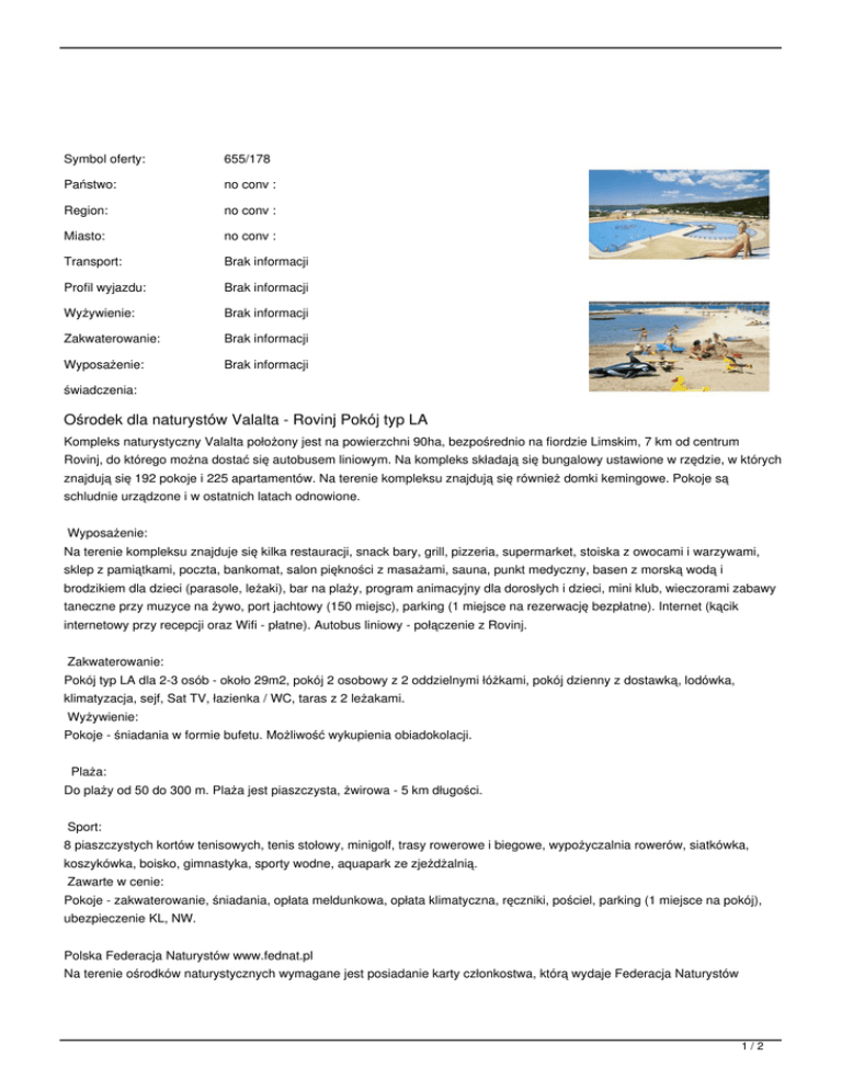 Symbol oferty: 655/178 Państwo: no conv : Region: no conv : Miasto: no conv : Transport: Brak informacji Profil wyjazdu: Brak informacji Wyżywienie: Brak informacji Zakwaterowanie: Brak informacji Wyposażenie: Brak informacji świadczenia: Ośrodek dla naturystów Valalta - Rovinj Pokój typ LA Kompleks naturystyczny Valalta położony jest na powierzchni 90ha, bezpośrednio na fiordzie Limskim, 7 km od centrum Rovinj, do którego można dostać się autobusem liniowym. Na kompleks składają się bungalowy ustawione w rzędzie, w których znajdują się 192 pokoje i 225 apartamentów. Na terenie kompleksu znajdują się również domki kemingowe. Pokoje są schludnie urządzone i w ostatnich latach odnowione. Wyposażenie: Na terenie kompleksu znajduje się kilka restauracji, snack bary, grill, pizzeria, supermarket, stoiska z owocami i warzywami, sklep z pamiątkami, poczta, bankomat, salon piękności z masażami, sauna, punkt medyczny, basen z morską wodą i brodzikiem dla dzieci (parasole, leżaki), bar na plaży, program animacyjny dla dorosłych i dzieci, mini klub, wieczorami zabawy taneczne przy muzyce na żywo, port jachtowy (150 miejsc), parking (1 miejsce na rezerwację bezpłatne). Internet (kącik internetowy przy recepcji oraz Wifi - płatne). Autobus liniowy - połączenie z Rovinj. Zakwaterowanie: Pokój typ LA dla 2-3 osób - około 29m2, pokój 2 osobowy z 2 oddzielnymi łóżkami, pokój dzienny z dostawką, lodówka, klimatyzacja, sejf, Sat TV, łazienka / WC, taras z 2 leżakami. Wyżywienie: Pokoje - śniadania w formie bufetu. Możliwość wykupienia obiadokolacji. Plaża: Do plaży od 50 do 300 m. Plaża jest piaszczysta, żwirowa - 5 km długości. Sport: 8 piaszczystych kortów tenisowych, tenis stołowy, minigolf, trasy rowerowe i biegowe, wypożyczalnia rowerów, siatkówka, koszykówka, boisko, gimnastyka, sporty wodne, aquapark ze zjeżdżalnią. Zawarte w cenie: Pokoje - zakwaterowanie, śniadania, opłata meldunkowa, opłata klimatyczna, ręczniki, pościel, parking (1 miejsce na pokój), ubezpieczenie KL, NW. Polska Federacja Naturystów www.fednat.pl Na terenie ośrodków naturystycznych wymagane jest posiadanie karty członkostwa, którą wydaje Federacja Naturystów 1/2 Polskich. Informacje na ten temat można znaleźć na stronie internetowej Polskiej Federacji Naturystów w zakładce Członkostwo. Koszt wyrobienia karty na okres jednego roku wynosi ok. 40 PLN od osoby dorosłej oraz ok. 10 PLN od dziecka. TERMINY: od: 2017-07-15 do: 2017-07-29 (15 dni), miejsca: sprawdź miejsca cena od: 1755 PLN = 423 CENNIK: Długość pobytu: 15 dni Grupa cenowa: A Ubezpieczenie (obligatoryjne) (*) Ubezpieczenie KL, NW 8 (*) Turystyczny Fundusz Gwarancyjny Pobyt w obiekcie (do wyboru) 2.5 (*) Pokój typ LA standardowo dla osób: 3 minimalnie: 2 Rodzaj osoby (do wyboru) Dziecko 0-2 (*) Adult 3 osoba dorosła na dostawce Dziecko 3-11 Wyżywienie (opcjonalne) HB - śniadania i obiadokolacje (-) (-) 413 289 207 35 Waluta: EUR Aktualne ceny z systemu S.A.R.T. (-) - cena usługi, podatku kalkulowana przy osobie lub gratis (*) - kwota wliczona w cenę standardową 2/2