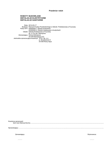 Przedmiar robót ROBOTY BUDOWLANE INSTALACJE ELEKTRYCZNE INSTALACJE SANITARNE Data: 2014-03-17 Budowa: Remont Punktu Przedszkolnego w Szkole Podstawowej w Frycowej Kody CPV: 45000000-7 Roboty budowlane 45300000-0 Roboty instalacyjne w budynkach Obiekt: Szkoła Podstawowa w Frycowej dz. nr 78, gm. Nawojowa Zamawiający: Gmina Nawojowa 33-335 Nawojowa 313 Jednostka opracowująca kosztorys: "ETA" Sp. o.o. ul. Śniadeckich 8 33-300 Nowy Sącz Kosztorys opracowali: tech. bud. Mariusz Surma, ............................................................................................................................................................................................. Sprawdzający: .......................................................................................................................................................................................................................... Zamawiający: Wykonawca: .......... .......... Przedszkole - Frycowa Zuzia (C) DataComp 1994-2009(lic. 3204) strona nr: 2 Przedmiar robót Podstawa nakładu, opis pozycji, wyliczenie ilości robót Ilość Krot. Jedn. 1 ROBOTY ROZBIÓRKOWE I WYBURZENIOWE 1.1 KNR 401/354/4 Wykucie z muru, ościeżnic drewnianych, powierzchnia do 2˙m2 1.2 KNR 401/329/3 Wykucie otworów w ścianach z cegieł dla otworów drzwiowych i okiennych, zaprawa wapienna lub cementowo-wapienna, grubość ponad 1/2 cegły - wybicie otworu na okno podawcze + (0,80*1,00+0,10*2,05+0,20*2,05)*0,28+ poszerzenia otworów drzwiowych: (0,05*2*2,05)*0,25 = 0,4475 0,448 1.3 KNR 401/348/3 Rozebranie ścianek, z cegieł, zaprawa cem-wap, grubość ścianki 1/2 cegły (1,72+2,40+2,62+5,72+5,72+2,55+1,60+ 2,71)*2,55-(0,80*2,00*5) = 55,8520 55,852 1.4 KNR 401/329/2 Wykucie otworów w ścianach z cegieł dla otworów drzwiowych i okiennych, zaprawa wapienna lub cementowo-wapienna, grubość do 1/2 cegły -otwory do pom. magaz. i szatni: 1,00*2,05+0,90*2,05 = 3,8950 3,895 1.5 KNR 401/819/15 Rozebranie wykładziny ściennej z płytek (1,72+2,28+1,61+2,13)*2*2,00-(0,80* 2,00*2)+(2,18+2,00)*1,60 = 34,4480 34,45 1.6 KNR 401/811/7 Rozebranie posadzek z płytek z kamieni sztucznych na zaprawie cementowej 1,62*2,02+1,71*2,26 = 7,1370 7,137 1.7 KNR 401/818/5 Zerwanie posadzki z tworzyw sztucznych 2,71*2,74+2,73*1,12+0,98*2,30+5,72* 3,11+5,74*3,09+4,37*2,50+3,38*1,24+ 0,79*1,05+3,32*2,71+2,71*3,87 = 83,6934 83,693 1.8 KNR 401/354/12 Wykucie z muru, podokienników betonowych z lastryko -parapet w podgrzewalni (likwidacja) 1,85 = 1,8500 1,850 1.9 KNR 401/354/13 Wykucie z muru, kratek wentylacyjnych wykucie nieprawidłowo podłączonej kratki 1 = 1,0000 1,0000 1.10 KNR 404/1105/1 Wywiezienie gruzu z terenu rozbiórki przy ręcznym załadowaniu i mechanicznym wyładowaniu samochodem samowyładowczym, na odległość do 1˙km 8,40+0,60+0,52+0,15+0,85+0,03 = 10,5500 10,550 1.11 KNR 404/1105/2 Wywiezienie gruzu z terenu rozbiórki przy ręcznym załadowaniu i mechanicznym wyładowaniu samochodem samowyładowczym, dodatek za każdy dalszy rozpoczęty 1˙km ponad 1˙km 9,000 szt ~0,448 m3 ~55,852 m2 ~3,895 m2 ~34,45 m2 ~7,137 m2 ~83,693 m2 ~1,850 m ~1,0000 szt ~10,550 m3 10,550 4,00 m3 Przedszkole - Frycowa Zuzia (C) DataComp 1994-2009(lic. 3204) strona nr: 3 Podstawa nakładu, opis pozycji, wyliczenie ilości robót Ilość Krot. Jedn. 2 ROBOTY MUROWE 2.1 KNR 401/332/1 Wykucie strzępi w płaszczyźnie ścian z cegieł, na zaprawie wapiennej, grubość ścian 1/2 cegły 2,55*6 = 2.2 KNR 904/111/8 Ścianki działowe, grubości 12,0˙cm (1/2 cegły) z cegieł kratówek K3 (2,64+1,36+2,53+1,61)*2,55-(0,90+ 1,00)*2,20 = 15,3000 15,300 ~15,300 m 16,5770 16,577 ~16,577 m2 2.3 KNR 401/306/3 (1) Przymurowanie ścianek z cegieł do ościeży lub powierzchni ścian, zaprawa cementowo-wapienna, grubość 1 cegły (1,40*2,20-1,00*2,05)+(0,10*2,05) = 1,2350 1,235 2.4 KNR 202/126/5 Otwory w ścianach murowanych, ułożenie nadproży prefabrykowanych POROTHERM 11,5 (lub równoważne) -nadproża w nowych ścianach działowych + nad drzwiami wejściowymi: 5*1,25 = 6,2500 6,250 2.5 KNR 202/126/2 Otwory w ścianach murowanych, grubości 1 cegły, z cegieł pojedynczych, bloczków i pustaków, otwory (bez nadproży) na drzwi, drzwi balkonowe i wrota ~1,235 m2 ~6,250 m 4,000 szt Przedszkole - Frycowa Zuzia (C) DataComp 1994-2009(lic. 3204) strona nr: 4 Podstawa nakładu, opis pozycji, wyliczenie ilości robót Ilość Krot. Jedn. 3 WENTYLACJA 3.1 KNR 401/310/4 (1) Przewody kominowe - zamurowanie otworów po wykuciu kratki -sala: 1 3.2 KNR 401/310/3 Przewody kominowe - wykucie otworów dla kratek wentylacyjnych - podgrzewalnia: 1 3.3 KNR 401/322/2 Obsadzenie drobnych elementów, w ścianach z cegieł, kratki wentylacyjne -kratki (14x21,5cm): 4 = = = 1,0000 1,0000 ~1,0000 szt 1,0000 1,0000 ~1,0000 szt 4,0000 4,0000 ~4,0000 szt Przedszkole - Frycowa Zuzia (C) DataComp 1994-2009(lic. 3204) strona nr: 5 Podstawa nakładu, opis pozycji, wyliczenie ilości robót Ilość Krot. Jedn. 4 PODŁOGI I POSADZKI 4.1 KNNR 2/1208/1 Samopoziomujące masy szpachlowe typu Terplan-N wewnątrz budynków pod płytki z kamieni sztucznych, wykładziny i parkiet, wylewka korygująco-wyrównująca grubości 2˙mm - wyrównanie powierzchni z dostosowaniem do pozomu posadzki w komunikacji: 10,30+11,70+3,20+50,00+8,00+7,20 = 90,4000 90,400 4.2 KNNR 2/1208/2 Samopoziomujące masy szpachlowe typu Terplan-N wewnątrz budynków pod płytki z kamieni sztucznych, wykładziny i parkiet, dopłata za każdy 1˙mm grubości nie więcej jak do 10˙mm 4.3 KNR 39/115/1 Uszczelnienie pomieszczeń mokrych i wilgotnych (łazienki, kuchnie, pralnie itp.) oraz balkonów i tarasów pod okładziną ceramiczną płynną folią uszczelniającą, powierzchnie poziome, bez wkładki z włókniny -izolacja z folii w płynie pod posadzki ceramiczne (podgrzewalnia, zmywalnia i łazienka): 11,70+3,20+8,00 = 22,9000 22,900 4.4 KNR 29/638/1 Izolacja folią w płynie, wklejenie taśmy uszczelniającej - Analogia -taśma na styku podł