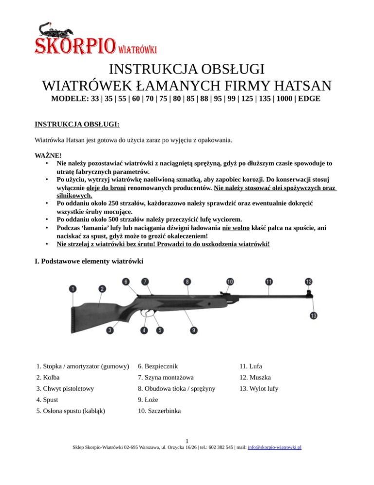 INSTRUKCJA OBSŁUGI WIATRÓWEK ŁAMANYCH FIRMY HATSAN MODELE: 33 | 35 | 55 | 60 | 70 | 75 | 80 | 85 | 88 | 95 | 99 | 125 | 135 | 1000 | EDGE INSTRUKCJA OBSŁUGI: Wiatrówka Hatsan jest gotowa do użycia zaraz po wyjęciu z opakowania. WAŻNE! • Nie należy pozostawiać wiatrówki z naciągniętą sprężyną, gdyż po dłuższym czasie spowoduje to utratę fabrycznych parametrów. • Po użyciu, wytrzyj wiatrówkę naoliwioną szmatką, aby zapobiec korozji. Do konserwacji stosuj wyłącznie oleje do broni renomowanych producentów. Nie należy stosować olei spożywczych oraz silnikowych. • Po oddaniu około 250 strzałów, każdorazowo należy sprawdzić oraz ewentualnie dokręcić wszystkie śruby mocujące. • Po oddaniu około 500 strzałów należy przeczyścić lufę wyciorem. • Podczas ‘łamania’ lufy lub naciągania dźwigni ładowania nie wolno kłaść palca na spuście, ani naciskać za spust, gdyż może to grozić okaleczeniem! • Nie strzelaj z wiatrówki bez śrutu! Prowadzi to do uszkodzenia wiatrówki! I. Podstawowe elementy wiatrówki 1. Stopka / amortyzator (gumowy) 6. Bezpiecznik 11. Lufa 2. Kolba 7. Szyna montażowa 12. Muszka 3. Chwyt pistoletowy 8. Obudowa tłoka / sprężyny 13. Wylot lufy 4. Spust 9. Łoże 5. Osłona spustu (kabłąk) 10. Szczerbinka 1 Sklep Skorpio-Wiatrówki 02-695 Warszawa, ul. Orzycka 16/26 | tel.: 602 382 545 | mail: [email protected] II. Ładowanie wiatrówki łamanej 1. Wiatrówka musi być trzymana w sposób pewny. Dla osób o słabszym chwycie polecane jest oprzeć stopkę o wewnętrzną część uda. 2. Otwartą ręką uderzyć wylot lufy do dołu, aby otworzyć zamek (rys. 1). 3. Używając lufy jako dźwigni, pociągnij lufę do dołu, aż do momentu zatrzaśnięcia sprężyny (wydany będzie charakterystyczny dźwięk cyknięcia) (rys. 2). 4. Włożyć śrut do lufy odpowiednią stroną (rys. 3). 5. Lufę doprowadzić do położenia wyjściowego (rys. 4) 6. Wiatrówka jest załadowana i gotowa do oddania strzału (rys. 5) Przy naciąganiu oraz zamykaniu wiatrówki nie używać nadmiernej siły. Po przeładowaniu bezpiecznik jest automatycznie zabezpieczany. WAŻNE! Każdorazowo sprawdź położenie bezpiecznika po załadowaniu wiatrówki. 2 Sklep Skorpio-Wiatrówki 02-695 Warszawa, ul. Orzycka 16/26 | tel.: 602 382 545 | mail: [email protected] III. Przed oddaniem strzału należy: • • Upewnić się, że na linii strzału ani w jej najbliższym otoczeniu nie ma nikogo i nie znajdzie się tam w momencie strzału (odległość co najmniej 200 – 300 metrów). Dopiero po wycelowaniu w kierunku tarczy położyć palec na spuście. Pociągnij za spust, gdy będziesz gotowy. PRZY ŁADOWANIU I ODDAWANIU STRZAŁU NALEŻY ZACHOWAĆ SZCZEGÓLNĄ OSTROŻNOŚĆ !!! IV. Ogólne zasady dotyczące bezpiecznego obchodzenia się z wiatrówką: 1. ZAWSZE traktuj KAŻDĄ wiatrówkę jak załadowaną, ZAWSZE zaczynaj od sprawdzenia czy jest nabita. 2. ZAWSZE kieruj lufę w bezpiecznym kierunku. NIGDY nie kieruj wylotu lufy w kierunku ludzi ani zwierząt. 3. NIGDY nie kładź palca na spuście, jeżeli nie chcesz strzelać. 4. ZAWSZE przenoś wiatrówkę zabezpieczoną i niezaładowaną. NIGDY nie baw się wiatrówką. 5. NIGDY nie zostawiaj wiatrówki bez nadzoru. ZAWSZE trzymaj ją w miejscu zabezpieczonym przed kradzieżą, z dala od dzieci. 6. ZAWSZE utrzymuj wiatrówkę w czystości i w dobrym stanie technicznym. 7. UŻYWAJ tylko śrutu przeznaczonego do danego typu wiatrówki. ZAWSZE uważaj czym ładujesz wiatrówkę. 8. Bardzo starannie sprawdzaj śrut przed strzelaniem. NIE UŻYWAJ śrutu pogiętego, z zadziorami czy brudnego, ani takiego, który upadł na ziemię. V. KWESTIE PRAWNE 1. Każda wiatrówka o początkowej energii kinetycznej śrutu wyższej niż 17J podlega rejestracji. 2. Wiatrówkę mogą nabyć wyłącznie osoby pełnoletnie. 3. Za szkody spowodowane niewłaściwym użyciem wiatrówki odpowiada wyłącznie właściciel wiatrówki. 3 Sklep Skorpio-Wiatrówki 02-695 Warszawa, ul. Orzycka 16/26 | tel.: 602 382 545 | mail: [email protected]