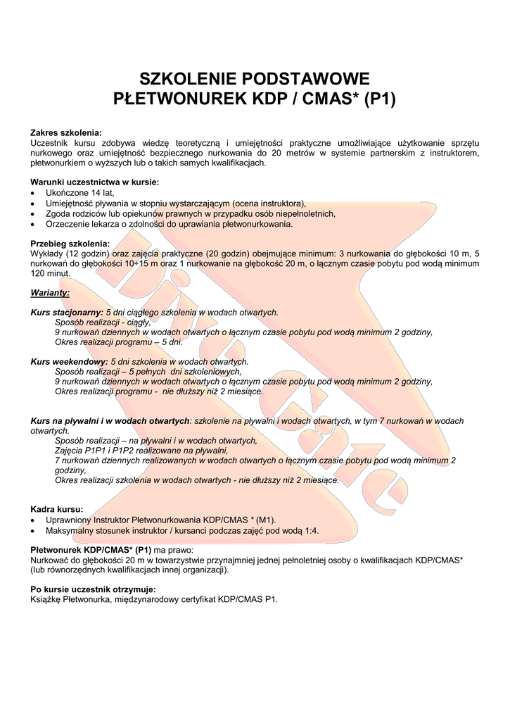 SZKOLENIE PODSTAWOWE PŁETWONUREK KDP / CMAS* (P1) Zakres szkolenia: Uczestnik kursu zdobywa wiedzę teoretyczną i umiejętności praktyczne umożliwiające użytkowanie sprzętu nurkowego oraz umiejętność bezpiecznego nurkowania do 20 metrów w systemie partnerskim z instruktorem, płetwonurkiem o wyższych lub o takich samych kwalifikacjach. Warunki uczestnictwa w kursie: Ukończone 14 lat, Umiejętność pływania w stopniu wystarczającym (ocena instruktora), Zgoda rodziców lub opiekunów prawnych w przypadku osób niepełnoletnich, Orzeczenie lekarza o zdolności do uprawiania płetwonurkowania. Przebieg szkolenia: Wykłady (12 godzin) oraz zajęcia praktyczne (20 godzin) obejmujące minimum: 3 nurkowania do głębokości 10 m, 5 nurkowań do głębokości 10÷15 m oraz 1 nurkowanie na głębokość 20 m, o łącznym czasie pobytu pod wodą minimum 120 minut. Warianty: Kurs stacjonarny: 5 dni ciągłego szkolenia w wodach otwartych. Sposób realizacji - ciągły, 9 nurkowań dziennych w wodach otwartych o łącznym czasie pobytu pod wodą minimum 2 godziny, Okres realizacji programu – 5 dni. Kurs weekendowy: 5 dni szkolenia w wodach otwartych. Sposób realizacji – 5 pełnych dni szkoleniowych, 9 nurkowań dziennych w wodach otwartych o łącznym czasie pobytu pod wodą minimum 2 godziny, Okres realizacji programu - nie dłuższy niż 2 miesiące. Kurs na pływalni i w wodach otwartych: szkolenie na pływalni i wodach otwartych, w tym 7 nurkowań w wodach otwartych. Sposób realizacji – na pływalni i w wodach otwartych, Zajęcia P1P1 i P1P2 realizowane na pływalni, 7 nurkowań dziennych realizowanych w wodach otwartych o łącznym czasie pobytu pod wodą minimum 2 godziny, Okres realizacji szkolenia w wodach otwartych - nie dłuższy niż 2 miesiące. Kadra kursu: Uprawniony Instruktor Płetwonurkowania KDP/CMAS * (M1). Maksymalny stosunek instruktor / kursanci podczas zajęć pod wodą 1:4. Płetwonurek KDP/CMAS* (P1) ma prawo: Nurkować do głębokości 20 m w towarzystwie przynajmniej jednej pełnoletniej osoby o kwalifikacjach KDP/CMAS* (lub równorzędnych kwalifikacjach innej organizacji). Po kursie uczestnik otrzymuje: Książkę Płetwonurka, międzynarodowy certyfikat KDP/CMAS P1. SZCZEGÓŁOWY PROGRAM SZKOLENIA ZAJĘCIA TEORETYCZNE SPOTKANIE ORGANIZACYJNE, ZAGADNIENIA WSTĘPNE P1T1 1. 2. 3. 4. 5. 6. 7. 8. 9. Przedstawienie uczestników i kadry szkolenia. Cel i wartość szkolenia P1. Przebieg szkolenia P1. Znaczenie szkolenia P1 w indywidualnym rozwoju nurkowym. Zdobywanie uprawnień, dokumenty płetwonurka. Dalsze etapy szkolenia, struktura stopni nurkowych. KDP PTTK – struktura organizacyjna, cele i formy działalności. CMAS – struktura, cele i formy działalności. Sprawy bieżące. SPRZĘT PODSTAWOWY P1T2 1. 2. 3. 4. 5. 6. 7. P1T3 P1T4 60’ Definicja ciśnienia. Jednostki ciśnienia – obowiązujące i stosowane. Ciśnienie atmosferyczne, hydrostatyczne, absolutne. Prawo Boyle’a-Mariotte’a – zastosowanie w nurkowaniu. Prawo Archimedesa – zastosowanie w nurkowaniu. Siła wyporu, siła ciężkości, pływalność. Podstawy optyki i akustyki podwodnej. PODSTAWY FIZJOLOGII I PATOFIZJOLOGII NURKOWANIA 1. 2. 3. 4. 5. 6. 7. 60’ Maska – funkcja, budowa, rodzaje, technika używania. Fajka – funkcja, budowa, rodzaje, technika używania. Płetwy – funkcja, budowa, rodzaje, technika używania. Skafander mokry – funkcja, budowa, rodzaje, zasada działania. Buty i rękawice mokre - funkcja, budowa, rodzaje. Pas balastowy – funkcja, rodzaje, technika używania. Nóż nurkowy – funkcja, rodzaje, technika używania. PODSTAWY FIZYKI NURKOWANIA 1. 2. 3. 4. 5. 6. 7. 60’ Ucho – budowa i funkcje. Zatoki – budowa i funkcje. Układ oddechowy – budowa i funkcja. Układ krążenia – budowa i funkcje. Wymiana gazowa w organizmie. Urazy ciśnieniowe. Choroba ciśnieniowa. 120’ SPRZĘT POWIETRZNY I POMOCNICZY P1T5 1. 2. 3. 4. 5. 6. 7. Butla nurkowa – funkcja, rodzaje, legalizacja. Automat oddechowy - funkcja, budowa i zasada działania. Konfiguracja automatu oddechowego. Kamizelka ratunkowo-wypornościowa – funkcja, rodzaje. Przyrządy pomiarowe - rodzaje, zastosowanie. Latarki, bojki – rodzaje i zastosowanie. Konserwacja i przechowywanie sprzętu nurkowego. TECHNIKA I BEZPIECZEŃSTWO NURKOWANIA P1T6 120’ 120’ 1. Podstawowe zasady bezpieczeństwa nurkowania 2. Komunikacja pod wodą – znaki umowne CMAS, 3. Asekuracja w nurkowaniu – nurkowanie parami, nurkowanie w grupie, asekuracja z brzegu. 4. Plan nurkowania. 5. Przygotowanie do nurkowania. 6. Kontrola sprzętu. 7. Sposoby wchodzenia do wody. 8. Zasady wyważania się. 9. Sposoby zanurzania się. 10. Statyczna i dynamiczna pływalność zerowa. 11. Technika używania kamizelki RW. 12. Pozycja ciała, trym. 13. Technika oddychania z automatu oddechowego. 14. Kontrola prędkości wynurzania się. 15. Przystanki - kontrolny, dekompresyjny, bezpieczeństwa. 16. Droga ewakuacyjna. 17. Dokumenty nurkowania. P1T7 PODSTAWOWE ZABIEGI RESUSCYTACYJNE 1. 2. 3. 4. 1. 2. 3. 4. P1TE Ocena i zabezpieczenie miejsca wypadku. Algorytm postępowania z poszkodowanym. Znaczenie pierwszej pomocy tlenowej. Komora dekompresyjna w ratowaniu płetwonurków. ŚRODOWISKO WODNE P1T8 60’ 60’ Podstawowe wiadomości o rzekach, jeziorach i morzach. Życie w wodach śródlądowych i morskich. Ochrona środowiska wodnego Wybór miejsca nurkowania. EGZAMIN, ZAKOŃCZENIE KURSU 1. Sprawdzian końcowy – test. 60’ SZCZEGÓŁOWY PROGRAM SZKOLENIA ZAJĘCIA PRAKTYCZNE PŁYWANIE I NURKOWANIE W SPRZĘCIE ABC P1P1 0 2 1. 2. 3. 4. 5. 0 5 1. 2. 3. 4. 5. 6. 7. 8. 9. 10. 11. 12. 5 1. 2. 3. 4. 5. 6. 7. 8. 9. 10. 5 10 1. 2. 3. 4. 5. 6. 7. 8. 9. 10. 11. 12. 120’ Przygotowanie i sprawdzenie sprzętu do nurkowania. Zanurzenie do twardego dna lub platformy. Technika napełniania kamizelki ustami i przy pomocy inflatora. Technika opróżniania kamizelki pod wodą. Uzyskiwanie pływalności dodatniej i ujemnej przy pomocy kamize