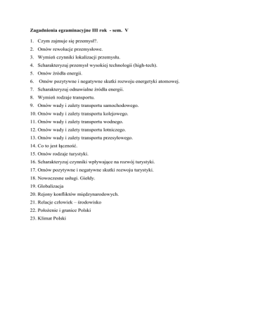 Zagadnienia egzaminacyjne III rok - sem. V 1. Czym zajmuje się przemysł?. 2. Omów rewolucje przemysłowe. 3. Wymień czynniki lokalizacji przemysłu. 4. Scharakteryzuj przemysł wysokiej technologii (high-tech). 5. Omów źródła energii. 6. Omów pozytywne i negatywne skutki rozwoju energetyki atomowej. 7. Scharakteryzuj odnawialne źródła energii. 8. Wymień rodzaje transportu. 9. Omów wady i zalety transportu samochodowego. 10. Omów wady i zalety transportu kolejowego. 11. Omów wady i zalety transportu wodnego. 12. Omów wady i zalety transportu lotniczego. 13. Omów wady i zalety transportu przesyłowego. 14. Co to jest łączność. 15. Omów rodzaje turystyki. 16. Scharakteryzuj czynniki wpływające na rozwój turystyki. 17. Omów pozytywne i negatywne skutki rozwoju turystyki. 18. Nowoczesne usługi. Giełdy. 19. Globalizacja 20. Rejony konfliktów międzynarodowych. 21. Relacje człowiek – środowisko 22. Położenie i granice Polski 23. Klimat Polski