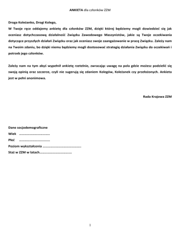 1 ANKIETA dla członków ZZM Droga Koleżanko, Drogi Kolego, W