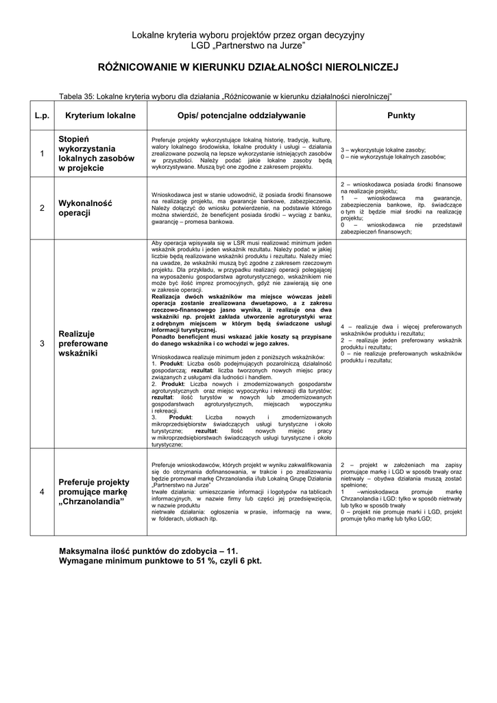 Lokalne kryteria wyboru projektów przez organ decyzyjny LGD „Partnerstwo na Jurze” RÓŻNICOWANIE W KIERUNKU DZIAŁALNOŚCI NIEROLNICZEJ Tabela 35: Lokalne kryteria wyboru dla działania „Różnicowanie w kierunku działalności nierolniczej” L.p. 1 2 3 4 Kryterium lokalne Opis/ potencjalne oddziaływanie Punkty Stopień wykorzystania lokalnych zasobów w projekcie Preferuje projekty wykorzystujące lokalną historię, tradycję, kulturę, walory lokalnego środowiska, lokalne produkty i usługi – działania zrealizowane pozwolą na lepsze wykorzystanie istniejących zasobów w przyszłości. Należy podać jakie lokalne zasoby będą wykorzystywane. Muszą być one zgodne z zakresem projektu. 3 – wykorzystuje lokalne zasoby; 0 – nie wykorzystuje lokalnych zasobów; Wykonalność operacji Wnioskodawca jest w stanie udowodnić, iż posiada środki finansowe na realizację projektu, ma gwarancje bankowe, zabezpieczenia. Należy dołączyć do wniosku potwierdzenie, na podstawie którego można stwierdzić, że beneficjent posiada środki – wyciąg z banku, gwarancję – promesa bankowa. 2 – wnioskodawca posiada środki finansowe na realizacje projektu; 1 – wnioskodawca ma gwarancje, zabezpieczenia bankowe, itp. świadczące o tym iż będzie miał środki na realizację projektu; 0 – wnioskodawca nie przedstawił zabezpieczeń finansowych; Realizuje preferowane wskaźniki Preferuje projekty promujące markę „Chrzanolandia” Aby operacja wpisywała się w LSR musi realizować minimum jeden wskaźnik produktu i jeden wskaźnik rezultatu. Należy podać w jakiej liczbie będą realizowane wskaźniki produktu i rezultatu. Należy mieć na uwadze, że wskaźniki muszą być zgodne z zakresem rzeczowym projektu. Dla przykładu, w przypadku realizacji operacji polegającej na wyposażeniu gospodarstwa agroturystycznego, wskaźnikiem nie może być ilość imprez promocyjnych, gdyż nie zawierają się one w zakresie operacji. Realizacja dwóch wskaźników ma miejsce wówczas jeżeli operacja zostanie zrealizowana dwuetapowo, a z zakresu rzeczowo-finansowego jasno wynika, iż realizuje ona dwa wskaźniki np. projekt zakłada utworzenie agroturystyki wraz z odrębnym miejscem w którym będą świadczone usługi informacji turystycznej. Ponadto beneficjent musi wskazać jakie koszty są przypisane do danego wskaźnika i co wchodzi w jego zakres. Wnioskodawca realizuje minimum jeden z poniższych wskaźników: 1. Produkt: Liczba osób podejmujących pozarolniczą działalność gospodarczą; rezultat: liczba tworzonych nowych miejsc pracy związanych z usługami dla ludności i handlem. 2. Produkt: Liczba nowych i zmodernizowanych gospodarstw agroturystycznych oraz miejsc wypoczynku i rekreacji dla turystów; rezultat: ilość turystów w nowych lub zmodernizowanych gospodarstwach agroturystycznych, miejscach wypoczynku i rekreacji. 3. Produkt: Liczba nowych i zmodernizowanych mikroprzedsiębiorstw świadczących usługi turystyczne i około turystyczne; rezultat: Ilość nowych miejsc pracy w mikroprzedsiębiorstwach świadczących usługi turystyczne i około turystyczne; Preferuje wnioskodawców, których projekt w wyniku zakwalifikowania się do otrzymania dofinansowania, w trakcie i po zrealizowaniu będzie promował markę Chrzanolandia i/lub Lokalną Grupę Działania „Partnerstwo na Jurze” trwałe działania: umieszczanie informacji i logotypów na tablicach informacyjnych, w nazwie firmy lub części jej przedsięwzięcia, w nazwie produktu nietrwałe działania: ogłoszenia w prasie, informację na www, w folderach, ulotkach itp. Maksymalna ilość punktów do zdobycia – 11. Wymagane minimum punktowe to 51 %, czyli 6 pkt. 4 – realizuje dwa i więcej preferowanych wskaźników produktu i rezultatu; 2 – realizuje jeden preferowany wskaźnik produktu i rezultatu; 0 – nie realizuje preferowanych wskaźników produktu i rezultatu; 2 – projekt w założeniach ma zapisy promujące markę i LGD w sposób trwały oraz nietrwały – obydwa działania muszą zostać spełnione; 1 –wnioskodawca promuje markę Chrzanolandia i LGD: tylko w sposób nietrwały lub tylko w sposób trwały 0 – projekt nie promuje marki i LGD, projekt promuje tylko markę lub tylko LGD;