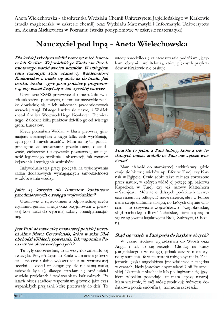 Aneta Wielechowska - absolwentka Wydziału Chemii Uniwersytetu Jagiellońskiego w Krakowie (studia magisterskie w zakresie chemii) oraz Wydziału Matematyki i Informatyki Uniwersytetu im. Adama Mickiewicza w Poznaniu (studia podyplomowe w zakresie matematyki). Nauczyciel pod lupą - Aneta Wielechowska Dla każdej szkoły to wielki zaszczyt mieć laureata lub finalistę Wojewódzkiego Konkursu Przedmiotowego wśród swoich uczniów. W ubiegłym roku szkolnym Pani uczniowi, Waldemarowi Krakowiakowi, udało się dojść aż do finału. Jak bardzo trzeba wyjść poza podstawę programową, aby uczeń liczył się w tak wysokiej stawce? Uczniowie ZSMS przyzwyczaili mnie już do swoich sukcesów sportowych, natomiast niezwykle rzadko dowiaduję się o ich sukcesach przedmiotowych wysokiej rangi. Dlatego bardzo się cieszę, iż Waldek został finalistą Wojewódzkiego Konkursu Chemicznego. Zaledwie kilka punktów dzieliło go od ścisłego grona laureatów. Kiedy poznałam Waldka w klasie pierwszej gimnazjum, dostrzegłam u niego kilka cech wyróżniających go od innych uczniów. Mam na myśli ponadprzeciętne zainteresowanie przedmiotem, dociekliwość, ciekawość i aktywność poznawczą, umiejętność logicznego myślenia i obserwacji, jak również kojarzenia i wyciągania wniosków. Indywidualizacja pracy polegała na wykonywaniu zadań dodatkowych wymagających samodzielności w zdobywaniu wiedzy. Jakie są korzyści dla laureatów konkursów przedmiotowych o zasięgu wojewódzkim? Uczniowie ci są zwolnieni z odpowiedniej części egzaminu gimnazjalnego oraz przyjmowani w pierwszej kolejności do wybranej szkoły ponadgimnazjalnej. Jest Pani absolwentką najstarszej polskiej uczelni Alma Mater Cracoviensis, która w roku 2014 obchodzi 650-lecie powstania. Jak wspomina Pani tamten okres swojego życia? To były cudowne lata, to tu wszystko zmieniło się i zaczęło. Przyjeżdżając do Krakowa miałam główny cel - zdobyć solidne wykształcenie na wymarzonej uczelni…i został on osiągnięty, ale nie samą nauką człowiek żyje :-), dlatego starałam się brać udział w wielu projektach i wydarzeniach kulturalnych. Po latach okres studiów wspominam głównie jako czas wspaniałych przyjaźni, które przetrwały do dziś. To Str. 10 wtedy narodziło się zainteresowanie podróżami, językami obcymi i architekturą, której pięknych przykładów w Krakowie nie brakuje. Podróże to jedno z Pani hobby, które z odwiedzonych miejsc zrobiło na Pani największe wrażenie? Mam słabość do starożytnej architektury, gdzie czuje się historię wieków np. Efez w Turcji czy Karnak w Egipcie. Cenię sobie także miejsca stworzone przez naturę, w których widać jej potęgę np. bajkowa Kapadocja w Turcji czy też surowy Matterhorn w Szwajcarii. Mówiąc o dalszych podróżach zazwyczaj staram się odkrywać nowe miejsca, ale i w Polsce mam swoje ulubione zakątki, do których chętnie wracam – to oczywiście województwo świętokrzyskie, skąd pochodzę i Bory Tucholskie, które kojarzą mi się ze spływami kajakowymi Brdą, Zubrzycą i Chociną. Skąd się wzięła u Pani pasja do języków obcych? W czasie studiów wyjeżdżałam do Włoch oraz Anglii i tak to się zaczęło. Chodzę na kursy j. angielskiego i włoskiego, jednak zawsze mam wyrzuty sumienia, iż w tej materii robię zbyt mało. Znajomość języka angielskiego jest właściwie niezbędna w czasach, kiedy jesteśmy obywatelami Unii Europejskiej. Natomiast słuchanie lub posługiwanie się językiem włoskim powoduje, że mam lepszy nastrój. Mam wrażenie, iż mój mózg produkuje wówczas dodatkową porcję endorfin tj. hormonu szczęścia. ZSMS News Nr 5 (wrzesień 2014 r.) Gdy ktoś się zakochuje, to mówi się, że czuje do kogoś chemię. Czy to stwierdzenie jest uzasadnione naukowo? Naukowcy potwierdzili, iż podwzgórze mózgu zakochanej osoby produkuje więcej niż normalnie fenyloetyloaminy zwanej też „molekułą miłości” o wzorze C6H5-NH-C2H5 (w skrócie PEA). Substancja ta kontroluje ilość: noradrenaliny, która przyśpiesza gonitwę myśli, serotoniny - odpowiadającej za dobry nastrój i dopaminy – uruchamiającej fantazję i wyobraźnię. Odchodząc od tych chemicznych nazw myślę, iż najważniejsze jest, by miłość dodawała skrzydeł każdego dnia. Warto pamiętać, że możemy zmusić nasz organizm do wytwarzania endorfin, dzięki którym czujemy się szczęśliwsi uprawiając jakąkolwiek aktywność fizyczną i stosując odpowiednią dietę. Co sprawia Pani szczególną radość w szkole? Każdy nauczyciel oprócz tego, że rzetelnie naucza swojego przedmiotu powinien być wychowawcą. Staram się rozwiązywać problemy moich uczniów, widzieć ich zadowolone oczy to widok bezcenny. Budujące jest obserwować na przestrzeni lat młodych ludzi, którzy pozytywnie zmieniają się…, pięknie rozwijają. Moim uczniom staram się uświadomić i pokazać, jak ogromny wpływ na efekty jakichkolwiek działań ma nasze nastawienie i serducho włożone w pracę. Dziękuję za miłą rozmowę! ZSMS News Nr 5 (wrzesień 2014 r.) Sławomira Marczyńska Str. 11