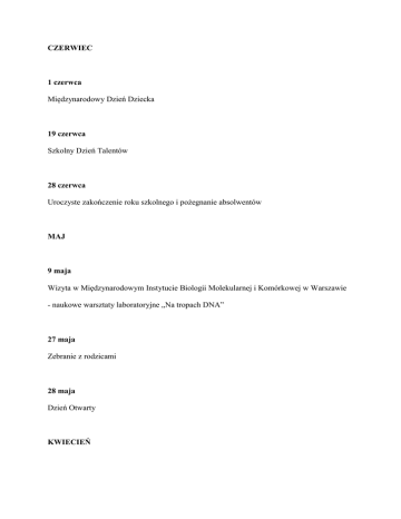 CZERWIEC 1 czerwca Międzynarodowy Dzień Dziecka 19 czerwca Szkolny Dzień Talentów 28 czerwca Uroczyste zakończenie roku szkolnego i pożegnanie absolwentów MAJ 9 maja Wizyta w Międzynarodowym Instytucie Biologii Molekularnej i Komórkowej w Warszawie - naukowe warsztaty laboratoryjne „Na tropach DNA” 27 maja Zebranie z rodzicami 28 maja Dzień Otwarty KWIECIEŃ 3 kwietnia Prezentacja Centrum Kształcenia Zawodowego i Ustawicznego im. Bohaterów Ziemi Iłżeckiej w Chwałowicach 11 kwietnia Dzień Otwarty w Gimnazjum TWP 12 - 13 kwietnia Dzień Otwarty w III LO 15 kwietnia Zajęcia laboratoryjne z chemii na Wydziale Materiałoznawstwa, Technologii i Wzornictwa Uniwersytetu Technologiczno-Humanistycznego im. Kazimierza Pułaskiegow Radomiu Zebranie z rodzicami 18 kwietnia Przedstawienie z okazji Dnia Pamięci o Holokauście i przeciwdziałaniu zbrodniom przeciwko ludzkości 23 - 25 kwietnia Egzamin gimnazjalny 26 kwietnia Dzień Kultury Chińskiej w Gimnazjum TWP - warsztaty językowe i kulturowe, prezentacje multimedialne MARZEC 5 marca Akademia z okazji Międzynarodowego Dnia Kobiet 6 - 8 marca Rekolekcje Wielkopostne 14 marca Dzień Otwarty w Gimnazjum TWP 14 - 20 marca Diagnoza wiadomości i umiejętności uczniów klasy III LUTY 15 lutego Wycieczka do Warszawy: "Wizyta w Sejmie" - wykład i zwiedzanie Sejmu RP oraz lekcja muzealna „Polskie powstania narodowe w XIX wieku” w Muzeum Wojska Polskiego 27 lutego Zajęcia związane z planowaniem kariery i wyborem zawodu prowadzone przez pracownika Poradni Psychologiczno-Pedagogicznej Nr 3 STYCZEŃ 18 stycznia Spotkanie informujące o zasobach biblioteki Centrum Kultury i Informacji Amerykańskiej American Corner Radom 23 stycznia Pokazy Chemiczne w III LO 25 stycznia Wręczenie nagród finalistom Konkursu Wiedzy o Społeczeństwie, Państwie i Prawie "RES PUBLICA" GRUDZIEŃ 3 grudnia Lekcja muzealna „Okres „złotowy” I Rzeczypospolitej” z cyklu „Historia pieniądza” w Muzeum im. Jacka Malczewskiego 6 grudnia Klasowe Mikołajki 10 grudnia Lekcja muzealna „Greckie i rzymskie monety antyczne” z cyklu „Historia pieniądza” z wykorzystaniem wystawy „Z mitologią w świat antyku” w Muzeum im. Jacka Malczewskiego 13 grudnia Uroczyste zebranie radomskich numizmatyków poświęcone 200. rocznicy Cmentarza Rzymskokatolickiego w Radomiu - RKŚTiG „Łaźnia” 14 grudnia Projekcja filmu „Dom Usherów” w wersji oryginalnej 16 grudnia Spotkanie z diakonem z Kamerunu 19 grudnia Wigilia Klasowa 20 grudnia Misterium Bożonarodzeniowe LISTOPAD 12 listopada Akademia z okazji Narodowego Święta Niepodległości 13-15 listopada Diagnoza wiadomości i umiejętności uczniów klasy III PAŹDZIERNIK 1 października Dzień Chłopca - wyjście do kina „HELIOS” na film „Felix, Nek i Nika” 9 października Pokazy Chemiczne w III LO 12 października Akademia z okazji Dnia Edukacji Narodowej 16 października Warsztaty muzyczne „Making old music new” – prowadzi Pamela Howland, zorganizowane przez American Corner w Szkole Muzycznej 19 października Warsztaty muzyczne „Skarby pieśni sefaradyjskiej” – prowadzi Gerard Edery, zorganizowane przez American Corner w RKŚTiG „Łaźnia” 26 października Wyjście do kina „HELIOS” na film „Bitwa pod Wiedniem” WRZESIEŃ 3 września Uroczysta inauguracja roku szkolnego 2012/2013 27 września Europejski Dzień Języków