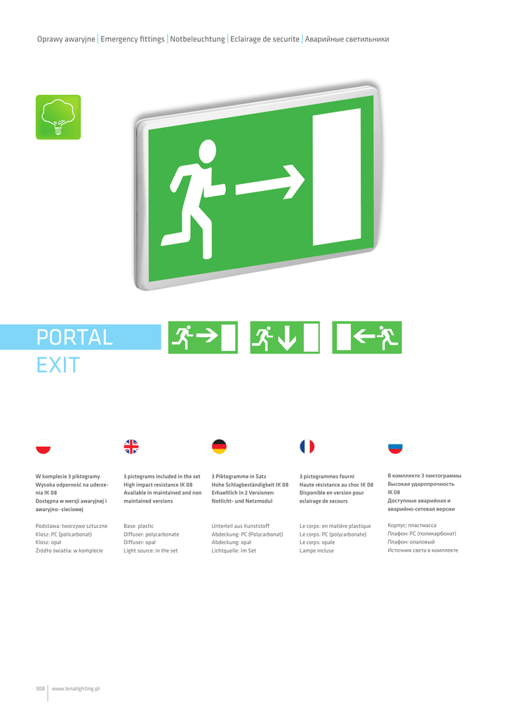 Oprawy awaryjne Emergency fittings Notbeleuchtung Eclairage de securite Аварийные светильники PORTAL EXIT W komplecie 3 piktogramy Wysoka odporność na uderzenia IK 08 Dostępna w wersji awaryjnej i awaryjno- sieciowej 3 pictograms included in the set High impact resistance IK 08 Available in maintained and non maintained versions 3 Piktogramme in Satz Hohe Schlagbeständigkeit IK 08 Erhaeltlich in 2 Versionen: Notlicht- und Netzmodul 3 pictogrammes fourni Haute résistance au choc IK 08 Disponible en version pour eclairage de secours В комплекте 3 пиктограммы Высокая ударопрочность IK 08 Доступные аварийная и аварийно-сетевая версии Podstawa: tworzywo sztuczne Klosz: PC (policarbonat) Klosz: opal Źródło światła: w komplecie Base: plastic Diffuser: polycarbonate Diffuser: opal Light source: in the set Unterteil aus Kunststoff Abdeckung: PC (Polycarbonat) Abdeckung: opal Lichtquelle: im Set Le corps: en matière plastique Le corps: PC (polycarbonate) Le corps: opale Lampe incluse Корпус: пластмасса Плафон: PC (поликарбонат) Плафон: опаловый Источник света в комплекте 308 www.lenalighting.pl Аварийные светильники Eclairage de securite Notbeleuchtung Emergency fittings Oprawy awaryjne index index max moc max power trzonek end cap rodzaj klosza type of diffuser waga netto net weight wymiary produktu product dimensions A/B/C wymiary montażowe installation dimensions czas pracy baterii battery life tryb pracy mode (NM/M) 899669 1x6W G5 OPAL 0,84 280/185/55 160/80 1h NM 899676 1x6W G5 OPAL 0,84 280/185/55 160/80 2h NM 899683 1x6W G5 OPAL 0,84 280/185/55 160/80 3h NM 899690 1x6W G5 OPAL 0,86 280/185/55 160/80 1h M 899706 1x6W G5 OPAL 0,86 280/185/55 160/80 2h M 899713 1x6W G5 OPAL 0,86 280/185/55 160/80 3h M 899720 1x11W G23 OPAL 0,84 280/185/55 160/80 1h NM 899782 1x11W G23 OPAL 0,85 280/185/55 160/80 1h NM 899737 1x11W G23 OPAL 0,84 280/185/55 160/80 2h NM 899799 1x11W G23 OPAL 0,85 280/185/55 160/80 2h NM 899744 1x11W G23 OPAL 0,84 280/185/55 160/80 3h NM 899805 1x11W G23 OPAL 0,85 280/185/55 160/80 3h NM 899751 1x11W G23 OPAL 0,86 280/185/55 160/80 1h M 899812 1x11W G23 OPAL 0,87 280/185/55 160/80 1h M 899768 1x11W G23 OPAL 0,86 280/185/55 160/80 2h M 899829 1x11W G23 OPAL 0,87 280/185/55 160/80 2h M 899775 1x11W G23 OPAL 0,86 280/185/55 160/80 3h M 899836 1x11W G23 OPAL 0,87 280/185/55 160/80 3h M auto test x x x x x x 1 widoczność 30 m www.lenalighting.pl 309