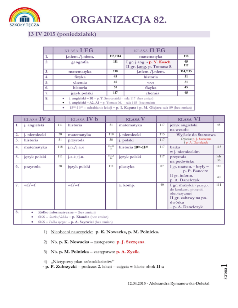 ORGANIZACJA 82. 13 IV 2015 (poniedziałek) KLASA I EG j.niem./j.niem. geografia 1. 2. 3. 4. 5. 6. 7. 8. 115/114 111 118 matematyka fizyka chemia historia język polski 1. KLASA IV j. angielski 2. 3. j. niemiecki historia 38 4. 45 45 51 117 45 117 114/115 51 51 45 45 j. angielski – B1 – p. T. Stypczyński - sala 117 (bez zmian) j. angielski – A2, A1 – p. Tomasz M. - sala 115 (bez zmian) 1500-1600 – odrabianie lekcji – p. I. Kaputa i p. M. Olejarz sala 89 (bez zmian) a 111 KLASA historia IV b 51 118 51 matematyka 118 j.n./j.a.k 5. język polski 111 6. przyroda 38 wf/wf 118 matematyka przyroda 7. KLASA II EG matematyka I gr. j.ang. - p. Y. Kosch II gr. j.ang. p. Tomasz S. j.niem./j.niem. historia wos fizyka chemia KLASA V matematyka 117 j. niemiecki j. polski 115 114,11 3a historia 1035-1120 117 j.a.k./j.n. 113a,1 14 język polski 117 język polski 111 plastyka 87 38 wf/wf z. komp. 117 40 KLASA VI 45 język angielski na wesoło Wyjście do Starostwa Opieka: p. J. Szczęsna i p. A. Danelczyk bajka w j. niemieckim przyroda na podwórku I gr. matem. - bryły – p. P. Bancerz II gr. inform. p. A. Danelczyk I gr. muzyka - przygot 115 lub 38 118 40 111 do konkursu piosenki obcojęzycznej II gr. zabawy na podwórku – p. A. Danelczyk Kółko informatyczne – (bez zmian) SKS – Siatka/lekka – p. Klaudia (bez zmian) SKS – Piłka ręczna - p. A. Szyrwiel (bez zmian) 1) Nieobecni nauczyciele: p. K. Nowacka, p. M. Polnicka. 2) Nb. p. K. Nowacka – zastępstwo: p. J. Szczęsna. 3) Nb. p. M. Polnicka – zastępstwo: p. A. Zyzik. 4) „Nietypowy plan szóstoklasistów” - p. P. Zubrzycki – podczas 2. lekcji – zajęcia w klasie obok II a 12.04.2015 - Aleksandra Rymanowska-Doleżal 1 Strona 8. ORGANIZACJA 82. c.d. 13 IV 2015 (poniedziałek) 5)Spotkanie nauczycieli języków obcych z Dyrektorem EG Godz. 15.00 – gab. 18 Strona 2 6) Spotkanie Tutorów z Dyrektorem EG Godz. 15.20 – gab. nr 18. 12.04.2015 - Aleksandra Rymanowska-Doleżal ORGANIZACJA 82. 14 IV 2015 (wtorek) KLASA I EG zaj. artystyczne 1. 2. 3. 4. 5. 6. 7. 8. 1. KLASA IV j.n.k/j.a. 2. 3. j.a./j.n.k przyroda 4. 5. 6. 7. język polski matematyka religia/etyka godz. wych. 113a/1 13 113/11 3a 38 111 118 51 118 Comenius – próba przedstawienia kukiełkowego 118 113a/114 117 117 115 geografia j.ang./j.ang. j.niem./j.niem. język polski matematyka wf/wf dod. matematyka – p. P. Bancerz – sala 118 (bez zmian) dod. matematyka – p. E. Łagowski – sala 89 (bez zmian) 1500-1600 – odrabianie lekcji – p. I. Kaputa , sala 89 (bez zmian) KLASA przyroda IV b plastyka j. niemiecki matematyka j. angielski język polski godz. wych. 38 87 115 118 51 111 38 KLASA V matematyka matematyka język polski przyroda j. n. przygot. j. angielski religia/etyka 117 117 117 38 115 45 51 111 111/113 114/115 111 118 KLASA VI gimnastyka w j. niemieckim Zajęcia kulinarne – pizza 3.l. p. J. Cymerman 4.l. p. A. Danelczyk film - p. J. Szczęsna film – p. A. Doleżal wf / wf zabawy na podwórku szkolnym (wf z EG) p. Justyna i nauczyciele wf sala gim 45 45 45 SKS – Zumba – p. Eliza (bez zmian) SKS – Siatkówka - p. Klaudia (bez zmian) dod. j. angielski – p. K. Nowacka (bez zmian) 9. lekcja – kółko teatralne – p. A. Bednarz (bez zmian) 9. lekcja – kółko teatralne – p. M. Kosewicz (bez zmian) 1) Nieobecni nauczyciele: p. K. Nowacka, p. M. Polnicka. 2) Nb. p. K. Nowacka – zastępstwo: p. J. Szczęsna. 3) Nb. p. M. Polnicka – zastępstwo: p. A. Zyzik (cały dzień w kl. 0 b) 4) Konkurs recytatorski klas I-III Godz. 10.00, Organizacja: p. A. Polis Komisja: p. A. Doleżal, p. M. Nitko, ………….. 3 a 87 Strona 8. matematyka j.ang./j.ang. język polski język polski wdż wf/wf KLASA II EG zaj. artystyczne 111 12.04.2015 - Aleksandra Rymanowska-Doleżal ORGANIZACJA 82. c.d. 14 IV 2015 (wtorek) 5) Współpraca pol.-niem. Organizacja p. M. Dracz. Godz. 13.00 Uczestnicy: p. M. Dracz, p. D. Kupisz, p. A. Malkiewicz Strona 4 Zastępstwa w kl. II b 13.00 – 14.00 – p. M. Olejarz 14.00-15.30 – p. A. Danelczyk (zabawy na podwórku szkolnym z klasą II a) P. W Delmaczyński – pomoże p. Ani Danelczyk w opiece nad uczniami klas II. 12.04.2015 - Aleksandra Rymanowska-Doleżal ORGANIZACJA 82. 15 IV 2015 (środa) 1. 2. 3. 4. 5. 6. 7. KLASA I EG geografia matematyka j.ang./j.ang. j.niem./j.niem. język polski język polski wdż lub próba tańca p. P. Owczarek 8. 1. 2. 3. język polski 111 matematyka religia/etyka 118 114/51 114/115 45 45 45 118 111 45/113a 111 111 118 51 a 113a,1 14 114,11 3a KLASA IV przyroda religia/etyka 51 b 51 51 KLASA V religia przyroda j. niemiecki 115 język polski 117 j. angielski matematyka 45 język polski j. niemiecki 51 38 118 38 115 KLASA VI Zajęcia kulinarne w j. niemieckim p. D. Kupisz p. J. Szczęsna I gr. inform. p. A. Danelczyk II gr. matem. - bryły – p. P. Bancerz Quiz - przygotowany przez uczniów 45 40 118 117 4. l. s. Kazimiera 5. l. A. Doleżal Edukacja filmowa klas IV-VI Wyjście: 12.30, powrót po godz. 15. Opieka: p. J. Cymerman, p. M. Kosewicz, p. A. Danelczyk, p. K. Pilipczuk. 1) Nieobecni nauczyciele: p. K. Nowacka, p. M. Polnicka, p. G. Łagowska. 2) Nb. p. K. Nowacka – zastępstwo: p. J. Szczęsna. 5 3) Nb. p. M. Polnicka – zastępstwo: p. A. Zyzik. Strona 6. 7. 8. 111 118 SKS – Zumba – p. Eliza (bez zmian) SKS – Piłka ręczna - p. A. Szyrwiel (bez zmian) 1500-1600 – odrabianie lekcji – p. I. Kaputa , sala 89 (bez zmian) 9. lekcja – SKS - Koszykówka – p. J. Sawicki (bez zmian) j. rosyjski – p. Y. Kosch (bez zmian) KLASA IV j.a.k/j.n. j.n./j.a.k 4. 5. KLASA II EG matematyka geografia j.ang./j.ang. język polski język polski matematyka religia - zajęcia katechetą świeckim 12.04.2015 - Aleksandra Rymanowska-Doleżal ORGANIZACJA 82. c.d. 15 IV 2015 (środa) 4) Edukacja filmowa klas IV-VI Wyjście: 12.30, powrót po godz. 15. Opieka: p. J. Cymerman, p. M. Kosewicz, p. A. Danelczyk, p. K. Pilipczuk. p. J. Sawicki – zastępstwo za p. K. Pilipczuk w kl. II