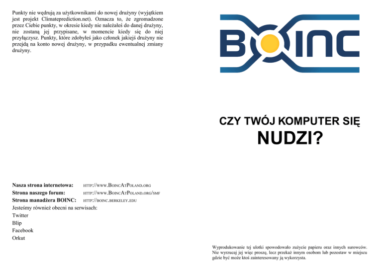 Punkty nie wędrują za użytkownikami do nowej drużyny (wyjątkiem jest projekt Climateprediction.net). Oznacza to, że zgromadzone przez Ciebie punkty, w okresie kiedy nie należałeś do danej drużyny, nie zostaną jej przypisane, w momencie kiedy się do niej przyłączysz. Punkty, które zdobyłeś jako członek jakiejś drużyny nie przejdą na konto nowej drużyny, w przypadku ewentualnej zmiany drużyny. CZY TWÓJ KOMPUTER SIĘ NUDZI? Nasza strona internetowa: HTTP://WWW.BOINCATPOLAND.ORG Strona naszego forum: HTTP://WWW.BOINCATPOLAND.ORG/SMF Strona manadżera BOINC: HTTP://BOINC.BERKELEY.EDU Jesteśmy również obecni na serwisach: Twitter Blip Facebook Orkut Wyprodukowanie tej ulotki spowodowało zużycie papieru oraz innych surowców. Nie wyrzucaj jej więc proszę, lecz przekaż innym osobom lub pozostaw w miejscu gdzie być może ktoś zainteresowany ją wykorzysta. PRZETWARZANIE ROZPROSZONE (ANG. DISTRIBUTED COMPUTING - DC) Polega na podzieleniu danego zagadnienia obliczeniowego na wiele części a następnie wysłaniu ich do wielu niezależnych od siebie komputerów. Te po pobraniu pewnej porcji danych z serwera, wykonują zaprogramowane obliczenia, po czym przesyłają rezultaty swojej pracy z powrotem do serwera, gdzie są dostępne dla naukowców. Przetwarzanie rozproszone stanowi tańszą alternatywę wobec budowania jednostek o wysokiej mocy obliczeniowej, takich jak klastry czy superkomputery. Niestety jego zastosowanie ogranicza się do tych problemów, które dają się podzielić. CZY NIE LEPIEJ BYŁOBY WYKORZYSTAĆ JEDEN, BARDZO MOCNY KOMPUTER? Na to pytanie nie ma jednej dobrej odpowiedzi. Przetwarzanie rozproszone pozwala uzyskać moc obliczeniową o wiele większą, niż najnowocześniejsze superkomputery i to przy dużo niższych kosztach. Z drugiej strony, nie każdy problem nadaje się do przetwarzania rozproszonego. Jednak wszędzie tam, gdzie udaje się zaprząc do pracy wiele komputerów, uzyskuje się nadspodziewanie dobre efekty. ALE CO TO MA WSPÓLNEGO ZE MNĄ? Rozwój internetu pozwolił naukowcom zajmującym się przetwarzaniem rozproszonym na ciekawą „zagrywkę”. W roku 1999 na Uniwersytecie Berkeley wystartował projekt SETI@home, wykorzystujący do przetwarzania rozproszonego komputery użytkowników internetu. Naukowcy zauważyli bowiem, że komputery w domach czy biurach, bardzo często nie są wykorzystywane w pełni swoich możliwości. Choć to wydaje się mało prawdopodobne, to jednak przeciętny komputer rzadko kiedy obciążony jest w 100%, a często jego praca sprowadza się do wyświetlania wygaszacza ekranu. Projektanci SETI@home stworzyli zatem wygaszacz ekranu, który każdy użytkownik DLACZEGO WARTO LICZYĆ Z BOINC@POLAND? Jako członek BOINC@Poland będziesz miał dostęp do najlepszej polskiej strony poświęconej BOINC, gdzie znajdziesz informacje o wszystkich projektach, poradniki i artykuły, które pomogą Ci poruszać się w świecie BOINC. Na naszej stronie staramy się również na bieżąco informować o wszystkich istotnych wydarzeniach z projektów i świata BOINC. Na forum BOINC@Poland szybko dowiesz się o powstaniu nowych projektów, przerwach w działaniu projektów oraz znajdziesz osoby, które chętnie odpowiedzą na Twoje pytania związane z BOINC i pomogą rozwiązać ewentualne problemy. Z nami przekonasz się, że liczenie w BOINC to nie tylko wspieranie nauki, lecz również zabawa. Rywalizujemy z najlepszymi drużynami świata nie tylko w ramach stałych statystyk, lecz bierzemy udział w często organizowanych wyścigach. Okazją do poznania większej ilości projektów może być udział w zabawie Projekt miesiąca. Licząc razem z BOINC@Poland będziesz wspierał największą polską drużynę, która znajduje się w ścisłej światowej czołówce drużyn BOINC. Obecnie BOINC@Poland plasuje się w pierwszej dziesiątce drużyn, podczas gdy w klasyfikacji krajów Polska zajmuje wysokie 9. miejsce. Obrazuje to duże zaangażowanie polskich użytkowników w obliczenia rozproszone. Nie oznacza to że spoczywamy na laurach, bo przecież stać nas na więcej. Dla porównania największa czeska drużyna jest na 5 miejscu, a Czechy mają 4 razy mniej obywateli niż Polska. To obrazuje jak wiele mamy jeszcze do zrobienia i co możemy osiągnąć wspólnymi siłami UWAGI NA TEMAT PUNKTÓW. Podkreślamy, że pozycja Polski czy polskiej drużyny w statystykach ma znaczenie wyłącznie prestiżowe. Sama rywalizacja na punkty stanowi zaś jedynie uatrakcyjnienie liczenia, którego głównym celem jest wspieranie nauki. Przyłączenie się do drużyny nie ma żadnego wpływu na Twoje indywidualne statystyki. Jeśli przyłączysz się do drużyny, od tej chwili będzie ona otrzymywać równowartość zdobywanych przez Ciebie punktów. Ty nic nie stracisz, a drużyna zyska punkty. JAK TO DZIAŁA? Gdy uruchamiasz BOINC na swoim komputerze, program działa zgodnie z poniższym schematem. rozproszonego na jednym komputerze. Jest to możliwe dzięki ujednoliconej strukturze wszystkich projektów. Co więcej, każdy użytkownik może w łatwy sposób ustalić, ile czasu jego komputer poświęci na pracę z poszczególnymi projektami. BOINC potrafi także zmagazynować dane wejściowe i wyjściowe, aby pracować bez przerw, gdy połączenie z serwerem projektu jest niemożliwe. Ponadto za czas przeznaczony na prace z projektami przyznawane są użytkownikom punkty kredytowe, które pozwalają na współzawodnictwo pomiędzy poszczególnymi użytkownikami, ale też pomiędzy krajami lub drużynami. BOINC@Poland jest właśnie jedną z takich drużyn. NA JAKICH SYSTEMACH OPERACYJNYCH MOŻNA URUCHOMIĆ BOINC? 1. Twój komputer otrzymuje zestaw instrukcji z serwera harmonogramów. Instrukcje te są zależne od Twojego PC, np.: serwer nie przydzieli mu pracy wymagającej większej ilości pamięci RAM, niż posiadasz. Projekty mogą obejmować wiele aplikacji, a serwer może przesłać dane dla którejkolwiek z nich. 2. Tw