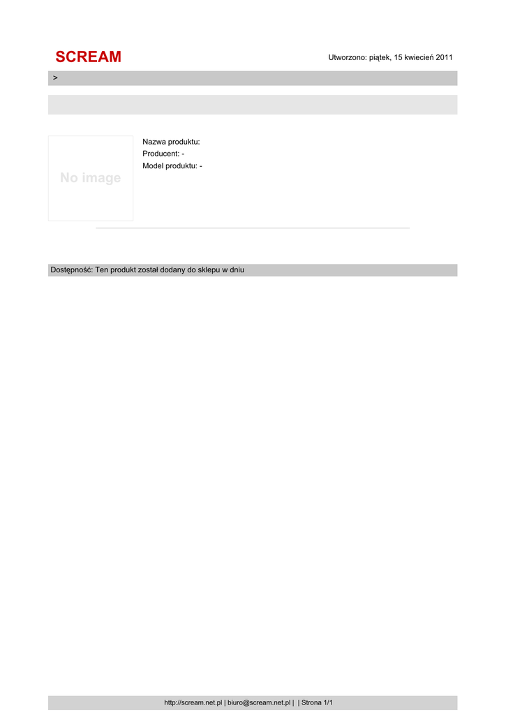 SCREAM Utworzono: piątek, 15 kwiecień 2011 > Nazwa produktu: Producent: Model produktu: - No image Dostępność: Ten produkt został dodany do sklepu w dniu http://scream.net.pl | [email protected] | | Strona 1/1