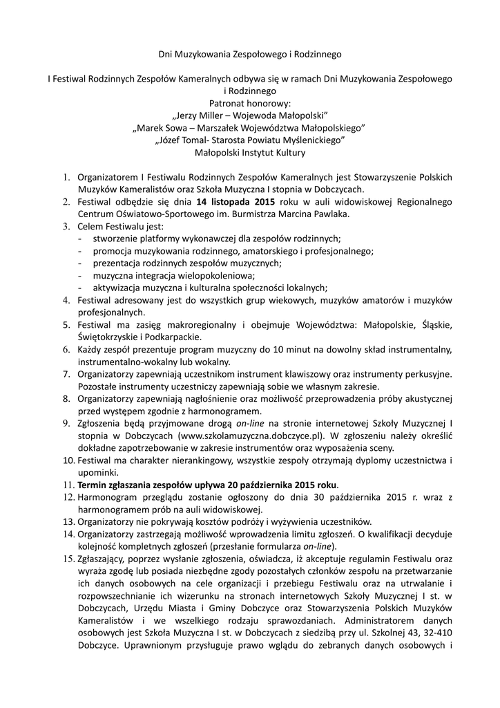 Dni Muzykowania Zespołowego i Rodzinnego I Festiwal Rodzinnych Zespołów Kameralnych odbywa się w ramach Dni Muzykowania Zespołowego i Rodzinnego Patronat honorowy: „Jerzy Miller – Wojewoda Małopolski” „Marek Sowa – Marszałek Województwa Małopolskiego” „Józef Tomal- Starosta Powiatu Myślenickiego” Małopolski Instytut Kultury 1. Organizatorem I Festiwalu Rodzinnych Zespołów Kameralnych jest Stowarzyszenie Polskich Muzyków Kameralistów oraz Szkoła Muzyczna I stopnia w Dobczycach. 2. Festiwal odbędzie się dnia 14 listopada 2015 roku w auli widowiskowej Regionalnego Centrum Oświatowo-Sportowego im. Burmistrza Marcina Pawlaka. 3. Celem Festiwalu jest: - stworzenie platformy wykonawczej dla zespołów rodzinnych; - promocja muzykowania rodzinnego, amatorskiego i profesjonalnego; - prezentacja rodzinnych zespołów muzycznych; - muzyczna integracja wielopokoleniowa; - aktywizacja muzyczna i kulturalna społeczności lokalnych; 4. Festiwal adresowany jest do wszystkich grup wiekowych, muzyków amatorów i muzyków profesjonalnych. 5. Festiwal ma zasięg makroregionalny i obejmuje Województwa: Małopolskie, Śląskie, Świętokrzyskie i Podkarpackie. 6. Każdy zespół prezentuje program muzyczny do 10 minut na dowolny skład instrumentalny, instrumentalno-wokalny lub wokalny. 7. Organizatorzy zapewniają uczestnikom instrument klawiszowy oraz instrumenty perkusyjne. Pozostałe instrumenty uczestniczy zapewniają sobie we własnym zakresie. 8. Organizatorzy zapewniają nagłośnienie oraz możliwość przeprowadzenia próby akustycznej przed występem zgodnie z harmonogramem. 9. Zgłoszenia będą przyjmowane drogą on-line na stronie internetowej Szkoły Muzycznej I stopnia w Dobczycach (www.szkolamuzyczna.dobczyce.pl). W zgłoszeniu należy określić dokładne zapotrzebowanie w zakresie instrumentów oraz wyposażenia sceny. 10. Festiwal ma charakter nierankingowy, wszystkie zespoły otrzymają dyplomy uczestnictwa i upominki. 11. Termin zgłaszania zespołów upływa 20 października 2015 roku. 12. Harmonogram przeglądu zostanie ogłoszony do dnia 30 października 2015 r. wraz z harmonogramem prób na auli widowiskowej. 13. Organizatorzy nie pokrywają kosztów podróży i wyżywienia uczestników. 14. Organizatorzy zastrzegają możliwość wprowadzenia limitu zgłoszeń. O kwalifikacji decyduje kolejność kompletnych zgłoszeń (przesłanie formularza on-line). 15. Zgłaszający, poprzez wysłanie zgłoszenia, oświadcza, iż akceptuje regulamin Festiwalu oraz wyraża zgodę lub posiada niezbędne zgody pozostałych członków zespołu na przetwarzanie ich danych osobowych na cele organizacji i przebiegu Festiwalu oraz na utrwalanie i rozpowszechnianie ich wizerunku na stronach internetowych Szkoły Muzycznej I st. w Dobczycach, Urzędu Miasta i Gminy Dobczyce oraz Stowarzyszenia Polskich Muzyków Kameralistów i we wszelkiego rodzaju sprawozdaniach. Administratorem danych osobowych jest Szkoła Muzyczna I st. w Dobczycach z siedzibą przy ul. Szkolnej 43, 32-410 Dobczyce. Uprawnionym przysługuje prawo wglądu do zebranych danych osobowych i żądania ich uzupełnienia, uaktualnienia, sprostowania, czasowego lub stałego wstrzymania ich przetwarzania lub ich usunięcia, jeżeli są one niekompletne, nieaktualne, nieprawdziwe lub zostały zebrane z naruszeniem ustawy albo są już zbędne do realizacji celu, dla którego zostały zebrane. 16. Wszelkie pytania prosimy kierować na adres: [email protected].