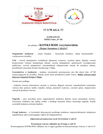 !!! UWAGA !!! ZAPRASZAM DZIECI klas „0”-III do udziału w KONKURSIE recytatorskim „Święto Narodowe 3 MAJA” Organizator konkursu – Aneta Szachna – kierownik świetlicy, Adam Krasnosielski – wychowawca świetlicy Cele - rozwój umiejętności werbalnych (płynność wymowy, czystość głosu, dykcja), rozwój kreatywności (własna interpretacja tekstu), rozwój umiejętności społecznych (występowanie publiczne), rozwój umiejętności emocjonalnych (dopasowanie emocji do przekazu tekstu), przybliżenie znaczenia Święta Narodowego 3 Maja. Uczestnictwo w konkursie - konkurs recytatorski przeznaczony jest dla dzieci klas „0”-III uczęszczających do świetlicy. Każdy uczeń może przedstawić jeden wiersz. Dobór wiersza musi dotyczyć tematyki Święta 3 Maja. Ocenie jury podlega: - trudność wiersza (słownictwo zawarte w wierszu, długość wiersza), samodzielność wykonania wiersza (bez pomocy kartki, książki), dykcja, płynność wymowy, czystość głosu, dopasowanie emocji do przekazu wiersza Nagrody - jury powołane przez organizatorów konkursu dokona oceny prezentacji wierszy. Zwycięzcy konkursu (po jednej osobie z każdego poziomu klasy) otrzymają nagrody. Każdy uczestnik konkursu otrzyma dyplom. Uwagi końcowe - w kwestiach dotyczących przebiegu konkursu, nieprzewidzianych niniejszym regulaminem, głos rozstrzygający należy do Organizatorów. Zgłoszenia przyjmowane są do 26 kwietnia w sali 23 Prezentacja wierszy odbędzie się 10 maja w sali 23 Rozstrzygnięcie KONKURSU odbędzie się w ciągu tygodnia od dnia prezentacji wierszy w sali nr 23 Serdecznie zapraszamy Aneta Szachna i Adam Krasnosielski
