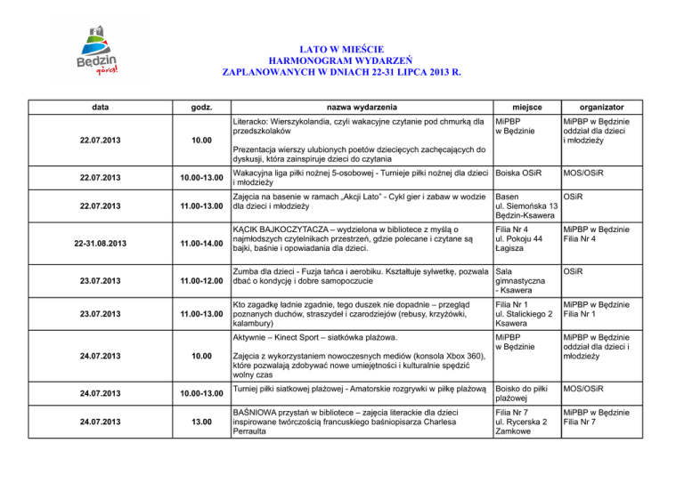 LATO W MIEŚCIE HARMONOGRAM WYDARZEŃ ZAPLANOWANYCH W DNIACH 22-31 LIPCA 2013 R. data godz. nazwa wydarzenia Literacko: Wierszykolandia, czyli wakacyjne czytanie pod chmurką dla przedszkolaków 22.07.2013 miejsce MiPBP w Będzinie 10.00 organizator MiPBP w Będzinie oddział dla dzieci i młodzieży Prezentacja wierszy ulubionych poetów dziecięcych zachęcających do dyskusji, która zainspiruje dzieci do czytania 22.07.2013 10.00-13.00 22.07.2013 11.00-13.00 Wakacyjna liga piłki nożnej 5-osobowej - Turnieje piłki nożnej dla dzieci Boiska OSiR i młodzieży MOS/OSiR Zajęcia na basenie w ramach „Akcji Lato” - Cykl gier i zabaw w wodzie dla dzieci i młodzieży Basen OSiR ul. Siemońska 13 Będzin-Ksawera KĄCIK BAJKOCZYTACZA – wydzielona w bibliotece z myślą o najmłodszych czytelnikach przestrzeń, gdzie polecane i czytane są bajki, baśnie i opowiadania dla dzieci. Filia Nr 4 ul. Pokoju 44 Łagisza MiPBP w Będzinie Filia Nr 4 22-31.08.2013 11.00-14.00 11.00-12.00 Zumba dla dzieci - Fuzja tańca i aerobiku. Kształtuje sylwetkę, pozwala Sala dbać o kondycję i dobre samopoczucie gimnastyczna - Ksawera OSiR 23.07.2013 23.07.2013 11.00-13.00 Kto zagadkę ładnie zgadnie, tego duszek nie dopadnie – przegląd poznanych duchów, straszydeł i czarodziejów (rebusy, krzyżówki, kalambury) Filia Nr 1 ul. Stalickiego 2 Ksawera MiPBP w Będzinie Filia Nr 1 Aktywnie – Kinect Sport – siatkówka plażowa. MiPBP w Będzinie MiPBP w Będzinie oddział dla dzieci i młodzieży Turniej piłki siatkowej plażowej - Amatorskie rozgrywki w piłkę plażową Boisko do piłki plażowej MOS/OSiR BAŚNIOWA przystań w bibliotece – zajęcia literackie dla dzieci inspirowane twórczością francuskiego baśniopisarza Charlesa Perraulta Filia Nr 7 ul. Rycerska 2 Zamkowe MiPBP w Będzinie Filia Nr 7 24.07.2013 10.00 24.07.2013 10.00-13.00 24.07.2013 13.00 Zajęcia z wykorzystaniem nowoczesnych mediów (konsola Xbox 360), które pozwalają zdobywać nowe umiejętności i kulturalnie spędzić wolny czas FESTYN W DZIELNICY BĘDZINA 24.07.2013 15.00-18.00 25.07.2013 11.00-13.00 25.07.2013 mini festyn dla najmłodszych w dzielnicy Będzina podczas którego animatorzy zapraszają do wspólnej zabawy np. do zabaw rekreacyjnoruchowych, rozwiązywania krzyżówek i kalamburów, zabaw plastycznych ( malowanie kredą na asfalcie);wszystkie działania nagradzane są gadżetami i maskotkami przygotowanymi przez organizatorów. Całości imprezy towarzyszy muzyka oraz liczne atrakcje w postaci zamku dmuchanego, straganów z zabawkami, waty cukrowej oraz popcornu na terenie placu J.M. Lustigera w Będzinie Ośrodek Kultury Zajęcia na basenie w ramach „Akcji Lato” - Cykl gier i zabaw w wodzie dla dzieci i młodzieży Basen OSiR ul. Siemońska 13 Będzin-Ksawera 17.00-19.00 Zajęcia na skateparku - Zajęcia dla młodzieży prowadzone przez profesjonalnych Skateów Skatepark OSiR 26.07.2013 9.00-15.00 Wycieczka autokarowa do “Miasteczka TWINPIGS” – Westernowy Park Żory Rozrywki OSiR 26.07.2013 10.00-13.00 Gry i zabawy dla najmłodszych - Gry i zabawy dla dziecina terenie OSiR-u i boisku do piłki plażowej MOS/OSiR 26.07.2013 11.00-13.00 Duchy, czorty i diabły będzińskie: historie i legendy będziński e- zajęcia Filia Nr 1 literackie dla dzieci ul. Stalickiego 2 Ksawera MiPBP w Będzinie Filia Nr 1 Audiobooki na WAKACJE, czyli książki, które można słuchać zawsze i wszędzie – prezentacja popularnych tytułów Filia Nr 4 ul. Pokoju 44 Łagisza MiPBP w Będzinie Filia Nr 4 Zajęcia na basenie w ramach „Akcji Lato” - Cykl gier i zabaw w wodzie dla dzieci i młodzieży Basen OSiR ul. Siemońska 13 Będzin-Ksawera Stawiam na wiedzę: Turystyczny Będzin – plakat przedstawiający najatrakcyjniejsze miejsca Będzina – zajęcia edukacyjno-plastyczne MiPBP w Będzinie 26.07.2013 11.00 29.07.2013 11.00-13.00 29.07.2013 10.00 29.07.2013 10.00-13.00 Teren OSiR OSiR MiPBP w Będzinie oddział dla dzieci i młodzieży Zajęcia mające poprzez dobrą zabawę wzbogacić wiedzę dzieci o mieście, w którym mieszkają oraz zachęcić do twórczej prezentacji walorów Będzina Wakacyjna liga piłki nożnej 5-osobowej - Turnieje piłki nożnej dla dzieci Boisko OSiR i młodzieży MOS/OSiR 30.07.2013 11.00-13.00 31.07.2013 10.00-13.00 31.07.2013 Zumba dla dzieci - Fuzja tańca i aerobiku. Kształtuje sylwetkę, pozwala Boisko OSiR lub dbać o kondycję i dobre samopoczucie sala gimnastyczna Ksawera OSiR Turniej piłki siatkowej plażowej - Amatorskie rozgrywki w piłkę plażową Boisko do piłki plażowej MOS/OSiR Stawiam na wiedzę: Turystyczny Będzin –podchody historycznoliteracko- przyrodnicze po Będzinie MiPBP w Będzinie MiPBP w Będzinie oddział dla dzieci i młodzieży 10.00 Zajęcia mające poprzez dobra zabawę wzbogacić wiedzę dzieci o mieście, w którym mieszkają oraz zachęcić do aktywności fizycznej FESTYN W DZIELNICY BĘDZINA 31.07.2013 15.00-18.00 Skwer na terenie Ośrodek Kultury Osiedla Ksawera mini festyn dla najmłodszych w dzielnicy Będzina podczas którego animatorzy zapraszają do wspólnej zabawy np. do zabaw rekreacyjnoruchowych, rozwiązywania krzyżówek i kalamburów, zabaw plastycznych ( malowanie kredą na asfalcie);wszystkie działania nagradzane są gadżetami i maskotkami przygotowanymi przez organizatorów. Całości imprezy towarzyszy muzyka oraz liczne atrakcje w postaci zamku dmuchanego, straganów z zabawkami, waty cukrowej oraz popcornu CAŁOMIESIĘCZNE SPOTKANIA, WYSTAWY Wystawa malarstwa pt. „NO PASARAN” Wiolety Frączek 1-30.07.2013 1-30.07.2013 10.00-19.00 10.00 - 19.00 MiPBP w Będzinie Wystawa promująca sztukę wśród mieszkańców Powiatu Będzińskiego Galeria klubu prezentuje dorobek artystyczny twórcy nieprofesjonalnego, członka „Pod Sową” STKZD w Będzinie. Ekspozycja, adresowana do młodzieży i dorosłych prezentowana będzie w Galerii klubu „Pod Sową” do końca lipca GALERIA MŁODEGO ARTYSTY: wystawa prac pl