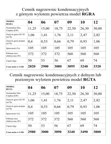 Cennik nagrzewnic kondensacyjnych z górnym wylotem powietrza model RGRA MODEL RGRA 04 06 07 09 10 12 Nominalna Moc Cieplna (kW) 11,25 15,00 18,75 22,50 26,30 30,00 Zużycie gazu GZ-50 (m3/h) 1,06 1,41 1,76 2,11 2,47 2,82 Zużycie gazu propan (m3/h) 0,4 0,53 0,66 0,79 0,93 1,06 Sprawność (%) 105 105 105 105 105 105 Pobrana moc elektryczna (W) 372 372 372 560 560 560 Ciężar (kg) 50 53 56 67 69 74 Cena netto w USD 2820 2900 3080 3095 3240 3320 Cennik nagrzewnic kondensacyjnych z dolnym lub poziomym wylotem powietrza model RGTA MODEL RGTA 04 06 07 09 10 12 Nominalna Moc Cieplna (kW) 11,25 15,00 18,75 22,50 26,30 30,00 Zużycie gazu GZ-50 (m3/h) 1,06 1,41 1,76 2,11 2,47 2,82 Zużycie gazu propan (m3/h) 0,4 0,53 0,66 0,79 0,93 1,06 Sprawność (%) 105 105 105 105 105 105 Pobrana moc elektryczna (W) 372 372 372 560 560 560 Ciężar (kg) 50 53 56 67 69 74 Cena netto w USD 2980 3000 3090 3240 3490 3800 Cennik nagrzewnic powietrza model SGPN MODEL SGPN 04 06 09 11 13 Nominalna Moc Cieplna (kW) 13,00 20,00 26,00 33,00 40,00 Zużycie gazu GZ-50 (m3/h) 1,30 2,00 2,60 3,30 4,00 Zużycie gazu propan (m3/h) 0,50 0,77 1,10 1,27 1,55 Sprawność (%) 92,00 92,40 92,20 92,50 92,20 Pobrana moc elektryczna (W) 373 373/56 372 0 560 560 Ciężar (kg) 39 48 54 63 68 Cena netto w USD 1880 1960 2060 2180 2260 Cennik klimatyzatorów – agregat chłodniczy model SAGL + parownik model RCFL (w obudowie) Moc (KW) Model + typ parownika 19,50 65 NAS + (HM-6024) Cena netto w USD 17,58 60 NAS + (HM-6024) 4920 14,07 48 NAS + (HM-4821) 12,31 42 NAS + (HM-4821) 4280 3900 10,55 36 TAS + (HM-3617) 3420 8,79 30 TAS + (HM-3617) 7,03 24 TAS + (HM-2414) 3040 2880 5260 Filtr włókninowy - cena netto 18 USD Filtr elektrostatyczny z ujemną jonizacją 1400cfm - cena netto 900 USD Filtr elektrostatyczny z ujemną jonizacją 2000cfm - cena netto 1000 USD Nawilżacz powietrza (obejściowy) Skuttle 2001 - cena netto 550 USD Nawilżacz powietrza (wentylatorowy) Skuttle 2002 - cena netto 650 USD Nawilżacz powietrza (rozpylający) Skuttle 592-22 - cena netto 650 USD Termoregulator Lux 511 - cena netto 140 USD Termoregulator Lux 711 - cena netto 170 USD