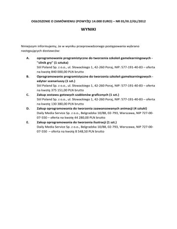 OGŁOSZENIE O ZAMÓWIENIU (POWYŻĘJ 14.000 EURO) – NR 01/III.2/GL/2012 WYNIKI Niniejszym informujemy, że w wyniku przeprowadzonego postępowania wybrano następujących dostawców: A. B. C. D. E. oprogramowanie programistyczne do tworzenia szkoleń gamelearningowych "silnik gry" (1 sztuka) Stil Poland Sp. z o.o., ul. Słowackiego 1, 42-260 Poraj, NIP: 577-191-40-83 – oferta na kwotę 840 000,00 PLN brutto Oprogramowanie programistyczne do tworzenia szkoleń gamelearningowych edytor scenariuszy (1 szt.) Stil Poland Sp. z o.o., ul. Słowackiego 1, 42-260 Poraj, NIP: 577-191-40-83 – oferta na kwotę 375 151,00 PLN brutto Zakup zestawu gotowych szablonów graficznych (1 szt.) Stil Poland Sp. z o.o., ul. Słowackiego 1, 42-260 Poraj, NIP: 577-191-40-83 – oferta na kwotę 130 380,00 PLN brutto Zakup oprogramowania do tworzenia zaawansowanych animacji (4 sztuki) Daily Media Service Sp. z o.o., Belgradzka 10/88, 02-793, Warszawa, NIP 727-0007-550 – oferta na kwotę 44 280,00 PLN brutto Zakup oprogramowania do tworzenia ilustracji (1 szt.) Daily Media Service Sp. z o.o., Belgradzka 10/88, 02-793, Warszawa, NIP 727-0007-550 – oferta na kwotę 8 548,50 PLN brutto