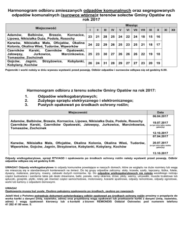Harmonogram odbioru zmieszanych odpadów komunalnych oraz segregowanych odpadów komunalnych (surowce wtórne)z terenów sołectw Gminy Opatów na rok 2017 Miesiąc Miejscowość Adamów, Balbinów, Brzezie, Kornacice, Lipowa, Nikisiałka Duża, Podole, Rosochy Karwów, Nikisiałka Mała, Oficjałów, Okalina Kolonia, Okalina Wieś, Tudorów, Wąworków Czerników Karski, Czerników Opatowski, Jałowęsy, Jurkowice, Marcinkowice, Tomaszów, Zochcinek Gojców, Jagnin, Strzyżowice, Kobylanki, Kobylany, Kochów I II III IV V VI VII VIII IX X 23 21 28 25 24 22 24 18 15 16 24 22 29 26 25 23 25 21 18 17 25 23 30 27 26 26 26 22 19 18 26 24 31 28 29 27 27 23 20 19 XI XII Pojemniki i worki należy w dniu wywozu wystawić przed posesję. Odbiór odpadów i surowców odbywa się od godziny 6.00. Harmonogram odbioru z terenu sołectw Gminy Opatów na rok 2017: 1. 2. 3. Odpadów wielkogabarytowych; Zużytego sprzętu elektrycznego i elektronicznego; Pustych opakowań po środkach ochrony roślin; Miejscowość Adamów, Balbinów, Brzezie, Kornacice, Lipowa, Nikisiałka Duża, Podole, Rosochy Czerników Karski, Czerników Opatowski, Jałowęsy, Jurkowice, Marcinkowice, Tomaszów, Zochcinek Data 06.04.2017 19.07.2017 (w tym dniu tylko wielko gabaryty) 12.10.2017 07.04.2017 Karwów, Nikisiałka Mała, Oficjałów, Okalina Kolonia, Okalina Wieś, Tudorów, Wąworków, Gojców, Jagnin, Strzyżowice, Kobylanki, Kobylany, Kochów 20.07.2017 (w tym dniu tylko wielko gabaryty) 13.10.2017 Odpady wielkogabarytowe, sprzęt RTV/AGD i opakowania po środkach ochrony roślin należy wystawić przed posesję. Odbiór odpadów odbywa się od godziny 6.00. UWAGA!! Odpady wielkogabarytowe to odpady komunalne powstające w naszych domach, które ze względu na duże rozmiary lub wagę nie mieszczą się w standardowych kontenerach na śmieci. Do tej grupy odpadów zaliczmy: stoły, krzesła, szafy, tapczany, łóżka, fotele, dywany, materace, pierzyny, rowery, zabawki dużych rozmiarów, itp. Do odpadów wielkogabarytowych nie należą wszelkiego rodzaju części budowlane i sanitarne takie jak deski drewniane, belki, panele, ramy okienne, drzwi, płoty, wanny, umywalki, muszle to aletowe lub spłuczki, grzejniki, płytki, rolety jak również części samochodowe, motorowery, kosiarki spalinowe, odpady remontowe, odpady ogrodowe, worki lub kartony z odpadami domowymi. UWAGA! Opakowania muszą być puste. Osobno pakujemy opakowania po środkach, osobno po nawozach. Jeżeli ktoś z Państwa potrzebuje dokument potwierdzający odbiór opakowań po środkach ochrony roślin prosimy o przypięcie do worka kartki z danymi (imię, nazwisko, adres) oraz przybliżoną wagą opakowań lub przekazanie kartki z danymi (imię, nazwisko, adres) i wagą opakowań kierowcy lub o kontakt z biurem REMONDIS Oddział Ostrowiec pod numerem telefonu 41 262 41 00 wew. 5.