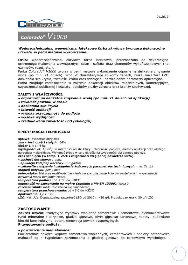 04.2013 Colorado® V1000 Wodorozcieńczalna, wewnętrzna, lateksowa farba akrylowa tworząca dekoracyjne i trwałe, w pełni matowe wykończenie. OPIS: wodorozcieńczalna, akrylowa farba lateksowa, przeznaczona do dekoracyjnoochronnego malowania wewnętrznych ścian i sufitów oraz elementów wykończeniowych (np. gzymsów, rozet, etc.). Farba Colorado® V1000 tworzy w pełni matowe wykończenie odporne na delikatne zmywanie wodą (po min. 21 dniach). Produkt charakteryzuje znikomy zapach, niska zawartość LZO, doskonała siła krycia, trwałość, krótki czas schnięcia i bardzo dobre parametry aplikacyjne. Farba znajduje zastosowanie w zakresie dekoracji obiektów mieszkalnych, komercyjnych, użyteczności publicznej i oświaty, obiektów służby zdrowia oraz branży spożywczej. ZALETY I WŁAŚCIWOŚCI: ● odporność na delikatne zmywanie wodą (po min. 21 dniach od aplikacji) ● trwałość powłoki w czasie ● doskonała siła krycia ● łatwość aplikacji ● wysoka przyczepność do podłoża ● wysoka wydajność ● zredukowana zawartość LZO (ekologia) SPECYFIKACJA TECHNICZNA: spoiwo: dyspersja akrylowa zawartość części stałych: 54% ciężar 1 l: 1,46 kg wydajność: ok. 10 m2/l w zależności od struktury i chłonności podłoża, metody aplikacji oraz użytego narzędzia malarskiego. Wykonać próbę w celu określenia wydajności dla danego podłoża. czas schnięcia (w temp. + 25C i wilgotności względnej powietrza 50%): - suchość dotykowa: 1 godz. - aplikacja kolejnej warstwy: 6-8 godzin - całkowite związanie i osiągnięcie końcowych parametrów technicznych: min. 21 dni stopień połysku: pełny mat kolorystyka: biel oraz możliwość barwienia na szeroką gamę kolorów pastelowych w systemach barwienia marki Benjamin Moore. temperatura podłoża: od +5°C do +30°C odporność na szorowanie na mokro (zgodnie z PN-EN 13300): klasa 2 rozcieńczalnik: woda (nie zaleca się rozcieńczać) temperatura przechowywania: od +5°C do +32°C opakowania: 4,6 l, 14 l LZO: Kat. A/a. Dopuszczalna zawartość LZO od 2010 r. –30 g/l. Produkt zawiera < 30 g/l LZO. ZASTOSOWANIE Zakres użycia: tradycyjne wyprawy wapienno-cementowe i cementowe, cienkowarstwowe tynki mineralne i akrylowe, gładzie gipsowe, płyty gipsowo-kartonowe, tapety, budowlane bloczki konstrukcyjne, beton, renowacja powłok dyspersyjnych. Przygotowanie podłoża: ● powierzchnie niemalowane: Powierzchnie nowych wypraw cementowo-wapiennych, cementowych i podłoży betonowych malować po 4 tygodniach sezonowania a gładzie gipsowe po całkowitym wyschnięciu i 1 związaniu. Należy usunąć zalęgający brud, kurz, tłuste plamy i luźne fragmenty podłoża. Nierówności i spękania podłoża wyrównać materiałem zbliżonym składem do pierwotnie użytego. Występujące na powierzchni mikroorganizmy (pleśń, algi i grzyby) należy usunąć stosując odpowiednie preparaty. Ściany i sufity zagruntować preparatem gruntującym SUPER SPEC HP™ CLEAR ACRYLIC SEALER P27 marki Benjamin Moore. Problematyczne podłoża z uciążliwymi plamami lub zaciekami zagruntować izolującą farbą gruntującą FRESH START® HIGH-HIDING ALL PURPOSE PRIMER 046 marki Benjamin Moore. Uwaga: w przypadku niemalowanych podłoży czynność gruntowania stanowi absolutny wymóg technologiczny. ● powierzchnie malowane (istniejące powłoki malarskie): Usunąć zalęgający brud, kurz, tłuste plamy, łuszczące się powłoki malarskie oraz luźne fragmenty podłoża. Powierzchnie błyszczące zmatowić. Nierówności i spękania podłoża wyrównać materiałem zbliżonym składem do pierwotnie użytego. Występujące na powierzchni mikroorganizmy (pleśń, algi i grzyby) należy usunąć stosując odpowiednie preparaty. W przypadku renowacji starych powłok malarskich wykonać wymalowanie próbne. Uzyskanie pozytywnego wyniku decyduje o ostatecznym zastosowaniu produktu. Czynność gruntowania może zostać pominięta jedynie pod warunkiem doskonałego zachowania istniejącej powłoki malarskiej. Odsłonięte fragmenty podłoża (również te po reperacjach, np. szpachlowaniu) zagruntować preparatem gruntującym SUPER SPEC HP™ CLEAR ACRYLIC SEALER P27 marki Benjamin Moore. Wspomniany preparat zastosować także w przypadku osłabionej warstwy malarskiej w celu jej przesączenia i wzmocnienia. APLIKACJA Podłoże musi być nośne, suche, czyste i odpylone. Produkt przeznaczony do stosowania w postaci handlowej, przed użyciem wymaga jedynie dokładnego wymieszania. W razie konieczności farbę można rozcieńczyć czystą wodą w ilości max. 10%. Nanieść minimum 2 warstwy farby nie wcześniej niż po 12 godzinach od gruntowania preparatem gruntującym SUPER SPEC HP™ CLEAR ACRYLIC SEALER P27 lub po 24 godzinach od aplikacji farby gruntującej FRESH START® HIGH-HIDING ALL PURPOSE PRIMER 046 marki Benjamin Moore. Nanosić pędzlem, wałkiem malarskim lub natryskiem. Przy wyborze konwencjonalnej metody natryskowej (powietrznej) z pompą membranową zaleca się rozcieńczenie farby poprzez dodatek maks. 20% wody, a przy metodzie bezpowietrznej „air less” i wykorzystaniu agregatu tłokowego maks. 10%. Zalecane parametry: ciśnienie 150÷180 bar, końcówka dyszy - 21÷40. Pracować metodą „mokre w mokre” unikając powstania śladów od narzędzia malarskiego. Przerwy technologiczne zaplanować na krawędziach ścian i elementów oraz w narożnikach pomieszczeń. Należy zwracać szczególną uwagę na szybką i nieprzerwaną realizację prac malarskich. Zaleca się nakładanie farby pionowymi pasami nie dopuszczając do nadmiernego przesychania poszczególnych fragmentów wymalowania. Kolejną warstwę aplikować po min. 6-8 godzinach. Nie nanosić na powłoki farb wapiennych i klejowych. Zaleca się użycie narzędzi malarskich marki BENJAMIN MOORE lub RICHARD. Warunki klimatyczne w trakcie i po aplikacji: Prace malarskie prowadzić przy temperaturze powietrza i podłoża nie niższej niż +50C. Optyma
