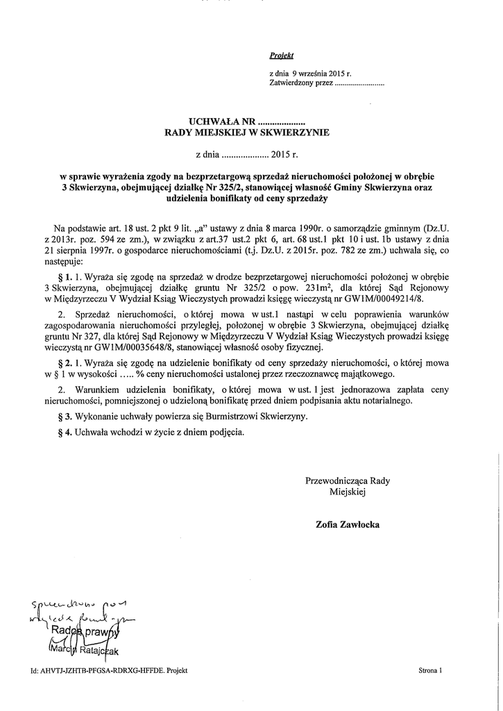 z dnia 9 września 2015 r. Zatwierdzony przez . UCHWAŁANR . RADY MIEJSKIEJ WSKWIERZYNIE z dnia 2015 r. w sprawie wyrażenia zgody na bezprzetargową sprzedaż nieruchomości położonej w obrębie 3 Skwierzyna, obejmującej działkę Nr 325/2, stanowiącej własność Gminy Skwierzyna oraz udzielenia bonifikaty od ceny sprzedaży Na podstawie art. 18 ust. 2 pkt 9 lit. "a" ustawy z dnia 8 marca 1990r. o samorządzie gminnym (Dz.U. z 2013r. poz. 594 ze zm.), w związku z art.37 ust.2 pkt 6, art. 68 ust.l pkt 10 i ust. lb ustawy z dnia 21 sierpnia 1997r. o gospodarce nieruchomościami (t.j. Dz.U. z 20l5r. poz. 782 ze zm.) uchwala się, co następuje: § 1. 1. Wyraża się zgodę w drodze bezprzetargowej nieruchomości położonej w obrębie 3 Skwierzyna, obejmującej działkę gruntu Nr 325/2 o pow. 231m2, dla której Sąd Rejonowy w Międzyrzeczu V Wydział Ksiąg Wieczystych prowadzi księgę wieczystą nr GWlM/000492l4/8. na sprzedaż 2. Sprzedaż nieruchomości, o której mowa w ust. 1 nastąpi w celu poprawienia warunków zagospodarowania nieruchomości przyległej, położonej w obrębie 3 Skwierzyna, obejmującej działkę gruntu Nr 327, dla której Sąd Rejonowy w Międzyrzeczu V Wydział Ksiąg Wieczystych prowadzi księgę wieczystą nr GWlM/00035648/8, stanowiącej własność osoby fizycznej. § 2. 1. Wyraża się zgodę na udzielenie bonifikaty od ceny sprzedaży nieruchomości, o której mowa w § 1 w wysokości ..... % ceny nieruchomości ustalonej przez rzeczoznawcę majątkowego. 2. Warunkiem udzielenia bonifikaty, o której mowa w ust. 1 jest jednorazowa zapłata ceny pomniejszonej o udzieloną bonifikatę przed dniem podpisania aktu notarialnego. nieruchomości, § 3. Wykonanie uchwały powierza się Burmistrzowi Skwierzyny. § 4. Uchwała wchodzi w życie z dniem podjęcia. Przewodnicząca Rady Miejskiej Zofia Id: AHVTJ-JZHTB-PFGSA-RDRXG-HFFDE. Projekt Zawłocka Strona 1 UZASADNIENIE do projektu uchwały w sprawie wyrażenia zgody na bezprzetargową sprzedaż nieruchomości położonej w obrębie 3 Skwierzyna, obejmującej działkę gruntu Nr 325/2, stanowiącej własność Gminy Skwierzyna oraz udzielenia bonifikaty od ceny sprzedaży Gmina Skwierzyna jest właścicielką nieruchomości położonej w obrębie 3 Skwierzyna, obejmującej działkę gruntu Nr 325/2 o pow. 231m 2, dla której Sąd Rejonowy w Międzyrzeczu V Wydział Ksiąg Wieczystych prowadzi księgę wieczystą nr GWIM/00049214/8. Z wnioskiem I dt, celem poprawienia o nabycie tego terenu wystąpił jego dzierżawca - p warunków zagospodarowania nieruchomości przyległej obejmującej działkę gruntu Nr 327. Zgodnie z miejscowym planem zagospodarowania przestrzennego działka Nr 325/2 wchodzi w skład terenu oznaczonego symbolem "ZI" - teren zieleni izolacyjnej, natomiast działka Nr 327 wchodzi w skład terenu oznaczonego symbolem "MN" - teren zabudowy mieszkaniowej jednorodzinnej. Działka gruntu Nr 325/2 to nieruchomość niezabudowana. Działka o regularnym kształcie, płaskim ukształtowaniu terenu. Ogrodzona łącznie z przyległa działką nr 327, zagospodarowana, porośnięta trawą, ścieżka utwardzona nawierzchnią bitumiczną, z nasadzeniami pojedynczych iglaków. Grunt sklasyfikowany jako "RV" - grunty orne. Wg operatu szacunkowego wartość rynkowa prawa własności gruntu, celem jego sprzedaży na poprawę warunków zagospodarowania nieruchomości przyległej o nr ewid. 327 na dzień 10.06.2015r. wynosi 13.656,00 zł. Po zapoznaniu się z operatem szacunkowym określającym wartość ww. nieruchomości • • • • • potwierdziła wolę nabycia działki gruntu Nr 325/2, wnosząc o udzielenie 50% bonifikaty od ceny sprzedaży, określonej przez rzeczoznawcę majątkowego, deklarując.' że po udzieleniu bonifikaty kwotę należną za powyższą działkę uiści jednorazowo. Zgodnie z art. 37 ust. 2 pkt 6 ustawy z dnia 21 sierpnia 1997r. o gospodarce nieruchomościami - nieruchomość jest zbywana w drodze bezprzetargowej, jeżeli przedmiotem zbycia jest nieruchomość lub jej części, jeśli mogą poprawić warunki zagospodarowania nieruchomości przyległej; stanowiącej własność lub oddanej w użytkowanie wieczyste osobie, która zamierza tę nieruchomość lub jej część nabyć, jeśli nie mogą być zagospodarowane jako odrębne nieruchomości. Z uwagi na fakt, iż działka gruntu Nr 325/2 ze względu na niewielką powierzchnię nie może zostać zagospodarowana jako odrębna nieruchomość, a może poprawić warunki zagospodarowania nieruchomości przyległej, spełniony jest wymóg ww. przepisu, a tym samym można ją zbyć w drodze bezprzetargowej na rzecz Wnioskodawcy. Natomiast, w myśl art. 68 ust. 1 pkt 10 przytoczonej wyżej ustawy właściwy organ może udzielić bortlfikatvod ceny ustalonej zgodnie-t art. 67 ust. 3,napodstawie odpowiednio zarządzenia wojewody albo uchwały rady lub sejmiku, jeżeli nieruchomość jest sprzedawana osobie, o której mowa wart. 37 ust. 2 pkt 6, z zastrzeżeniem, że nieruchomość przyległa jest przeznaczona lub wykorzystywana na cele mieszkaniowe. W związku z powyższym, w niniejszym przypadku spełnione są wymogi niezbędne do Gminy Skwierzyna w drodze bezprzetargowej, na poprawę warunków zagospodarowania nieruchomości przyległej, z jednoczesnym udzieleniem bonifikaty od ceny sprzedaży. Proponuje się wyrażenie zgody na udzielenie 50 % bonifikaty od ceny sprzedaży, przy jednorazowej zapłacie ceny nieruchomości, pomniejszonej o udzieloną bonifikatę przed dniem podpisania aktu notarialnego. sprzedaży nieruchomości Koszty przygotowania nieruchomości do zbycia pozostaną po stronie Wnioskodawcy. Wnoszę o przyjęcie proponowanego projektu uchwały. Sporządziła: KIEROWNIK REFERATU G05POdilrki/'miE chornościarru i Z<JGo5podarov. Jolanta f .a Przj!5trzenneGo ~v' Iróz-Pawlu~