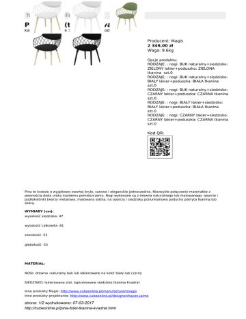 http://cubeonline.pl PINA fotel (tkanina Kvadrat) kategoria: Kategorie > KRZESŁA > Z podłokietnikami Producent: Magis 2 349,00 zł Waga: 9.6kg Opcje produktu: RODZAJE: : nogi: BUK naturalny+siedzisko: ZIELONY lakier+poduszka: ZIELONA tkanina szt.0 RODZAJE: : nogi: BUK naturalny+siedzisko: BIAŁY lakier+poduszka: BIAŁA tkanina szt.0 RODZAJE: : nogi: BUK naturalny+siedzisko: CZARNY lakier+poduszka: CZARNA tkanina szt.0 RODZAJE: : nogi: BIAŁY lakier+siedzisko: BIAŁY lakier+poduszka: BIAŁA tkanina szt.0 RODZAJE: : nogi: CZARNY lakier+siedzisko: CZARNY lakier+poduszka: CZARNA tkanina szt.0 Kod QR: Pina to krzesło o wyjątkowo zwartej bryle, surowe i eleganckie jednocześnie. Niezwykłe połączenie materiałów z pewnością doda uroku każdemu pomieszczeniu. Nogi wykonane są z drewna naturalnego lub malowanego; oparcie i podłokietniki tworzy metalowa, malowana siatka; na oparciu i siedzisku poliuretanowa poducha pokryta tkaniną lub skórą. WYMIARY (cm): wysokość siedziska- 47 wysokość całkowita- 81 szerokość- 53 głębokość- 53 MATERIAŁ: NOGI: drewno -naturalny buk lub lakierowane na kolor biały lub czarny SIEDZISKO: lakierowana stal, tapicerowane siedzisko tkanina Kvadrat Inne produkty Magis: http://www.cubeonline.pl/manufacturer/magis Inne produkty projektanta: http://www.cubeonline.pl/designer/hayon-jaime strona: 1/2 wydrukowano: 07-03-2017 http://cubeonline.pl/pina-fotel-tkanina-kvadrat.html strona: 2/2 wydrukowano: 07-03-2017 http://cubeonline.pl/pina-fotel-tkanina-kvadrat.html