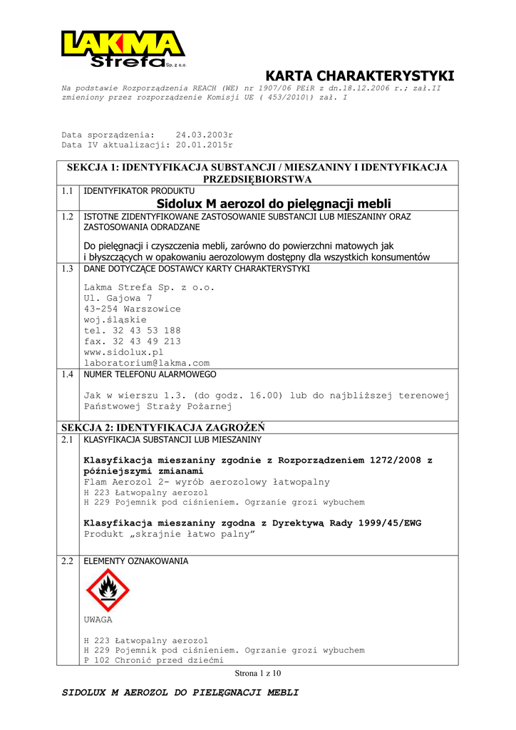 KARTA CHARAKTERYSTYKI Na podstawie Rozporządzenia REACH (WE) nr 1907/06 PEiR z dn.18.12.2006 r.; zał.II zmieniony przez rozporządzenie Komisji UE ( 453/2010|) zał. I Data sporządzenia: 24.03.2003r Data IV aktualizacji: 20.01.2015r SEKCJA 1: IDENTYFIKACJA SUBSTANCJI / MIESZANINY I IDENTYFIKACJA PRZEDSIĘBIORSTWA 1.1 IDENTYFIKATOR PRODUKTU 1.2 ISTOTNE ZIDENTYFIKOWANE ZASTOSOWANIE SUBSTANCJI LUB MIESZANINY ORAZ ZASTOSOWANIA ODRADZANE Sidolux M aerozol do pielęgnacji mebli Do pielęgnacji i czyszczenia mebli, zarówno do powierzchni matowych jak i błyszczących w opakowaniu aerozolowym dostępny dla wszystkich konsumentów 1.3 DANE DOTYCZĄCE DOSTAWCY KARTY CHARAKTERYSTYKI Lakma Strefa Sp. z o.o. Ul. Gajowa 7 43-254 Warszowice woj.śląskie tel. 32 43 53 188 fax. 32 43 49 213 www.sidolux.pl [email protected] 1.4 NUMER TELEFONU ALARMOWEGO Jak w wierszu 1.3. (do godz. 16.00) lub do najbliŜszej terenowej Państwowej StraŜy PoŜarnej SEKCJA 2: IDENTYFIKACJA ZAGROśEŃ 2.1 KLASYFIKACJA SUBSTANCJI LUB MIESZANINY Klasyfikacja mieszaniny zgodnie z Rozporządzeniem 1272/2008 z późniejszymi zmianami Flam Aerozol 2- wyrób aerozolowy łatwopalny H 223 Łatwopalny aerozol H 229 Pojemnik pod ciśnieniem. Ogrzanie grozi wybuchem Klasyfikacja mieszaniny zgodna z Dyrektywą Rady 1999/45/EWG Produkt „skrajnie łatwo palny” 2.2 ELEMENTY OZNAKOWANIA UWAGA H 223 Łatwopalny aerozol H 229 Pojemnik pod ciśnieniem. Ogrzanie grozi wybuchem P 102 Chronić przed dziećmi Strona 1 z 10 SIDOLUX M AEROZOL DO PIELĘGNACJI MEBLI KARTA CHARAKTERYSTYKI Na podstawie Rozporządzenia REACH (WE) nr 1907/06 PEiR z dn.18.12.2006 r.; zał.II zmieniony przez rozporządzenie Komisji UE ( 453/2010|) zał. I P 210 Przechowywać z dala od źródeł ciepła, gorących powierzchni, iskrzenia, otwartego ognia i innych źródeł zapłonu. Nie palić P 211 Nie rozpylać nad otwartym ogniem lub innym źródłem zapłonu. P 251 Nie przekłuwać ani nie spalać, nawet po zuŜyciu. P 410+ P412 Chronić przed światłem słonecznym. Nie wystawiać na działanie temperatury przekraczającej 50 °C/122 °F. Składniki: Sidolux M aerozol kwiat: kompozycja zapachowa ( Hexyl Cinnamal) Sidolux M aerozol migdał: kompozycja zapachowa Sidolux M aerozol miodowy: kompozycja zapachowa 2.3 INNE ZAGROśENIA Pojemnik pod ciśnieniem: chronić przed słońcem i nagrzaniem powyŜej 50°C. Nie przekłuwać ani nie spalać, takŜe po zuŜyciu SEKCJA 3:SKŁAD/ INFORMACJA O SKŁADNIKACH 3.1 3.2 SUBSTANCJE Nie dotyczy MIESZANINY NIEBEZPIECZNE SKŁADNIKI MIESZANINY (WE) 1272/2008 Nazwa substancji/ INCI Nr indeksowy Nr WE name mieszanina gazów płynnych propan-butan- izobutan Nr CAS 100 % mieszanina gazów płynnych propan- butan- izobutan zawiera: Butan 601-004-00-0 203-448-7 106-97-8 Izobutan 601-004-00-0 200-857-2 75-28-5 Propan 601-003-00-5 200-827-9 74-98-6 Nr rejestru % wagowy Klasa zagroŜenia Zwroty H ------- 10-15 % Flam gas 1 Press gas H 220 H 280 01211947469132 01211948539527 01211948694421 0-100 % Flam gas 1 Press gas H 220 H 280 0-100 % Flam gas 1 Press gas H 220 H 280 0-100 % Flam gas 1 Press gas H 220 H 280 NIEBEZPIECZNE SKŁADNIKI MIESZANINY wg Dyrektywy 67/548 /EWG Nazwa substancji/ INCI Nr indeksowy Nr WE name mieszanina gazów płynnych propan-butan- izobutan Nr CAS 100 % mieszanina gazów płynnych propan- butan- izobutan zawiera: Butan 601-004-00-0 203-448-7 106-97-8 Izobutan 601-004-00-0 200-857-2 75-28-5 Propan 601-003-00-5 200-827-9 74-98-6 Nr rejestru % wagowy Symbol zagroŜenia Zwroty R ------- 10-15 % F R12 01211947469132 01211948539527 01211948694421 0-100 % F 0-100 % F 0-100 % F + + R12 + R12 + R12 SEKCJA 4: ŚRODKI PIERWSZEJ POMOCY 4.1 Opis środków pierwszej pomocy W przypadku wystąpienia jakichkolwiek niepokojących objawów wezwać natychmiast lekarza lub odwieźć poszkodowanego do szpitala, pokazać kartę charakterystyki, opakowanie produktu lub etykietę. Strona 2 z 10 SIDOLUX M AEROZOL DO PIELĘGNACJI MEBLI KARTA CHARAKTERYSTYKI Na podstawie Rozporządzenia REACH (WE) nr 1907/06 PEiR z dn.18.12.2006 r.; zał.II zmieniony przez rozporządzenie Komisji UE ( 453/2010|) zał. I Inhalacja Kontakt z oczami Kontakt ze skórą Połknięcie: 4.2 W warunkach normalnych zagroŜenie praktycznie nie istnieje. W warunkach awaryjnych wyprowadzić lub wynieść poszkodowanego na świeŜe powietrze. Przepłukać obficie wodą, jeŜeli podraŜnienie oczu utrzymuje się, skonsultować się ze specjalistą. Zapobiegawczo umyć wodą z mydłem. W przypadku podraŜnienia skóry skonsultować się z lekarzem. Wypić 1-2 szklanki wody. W razie potrzeb skontaktować się z lekarzem, pokazać kartę charakterystyki, opakowanie produktu lub etykietę. Nieprzytomnej osobie nigdy nie podawać nic doustnie. NAJWAśNIEJSZE OSTRE I OPÓŹNIONE OBJAWY ORAZ SKUTKI NARAśENIA Patrz pkt 11. 4.3 WSKAZANIA DOTYCZĄCE WSZELKIEJ NATYCHMIASTOWEJ POMOCY LEKARSKIEJ I SZCZEGÓLNEGO POSTĘPOWANIA Z POSZKODOWANYM Brak danych SEKCJA 5: POSTĘPOWANIE W PRZYPADKU POśARU 5.1 ŚRODKI GAŚNICZE dwutlenek węgla, proszki gaśnicze, gaśnica pianowa, prądy wodne rozproszone. 5.2 SZCZEGÓLNE ZAGROśENIE ZWIĄZANE Z SUBSTANCJĄ LUB MIESZANINĄ podczas poŜaru powstają niebezpieczne dla zdrowia pary i dymy, które mogą zawierać tlenki węgla, siarki oraz związki organiczne i nieorganiczne. Nie wdychać dymów. 5.3 INFORMACJE DLA STRAśY POśARNEJ: odzieŜ gazoszczelna i aparaty izolujące drogi oddechowe niezaleŜne od otaczającego powietrza. SEKCJA 6: POSTĘPOWANIE W PRZYPADKU NIEZAMIERZONEGO UWOLNIENIA DO ŚRODOWISKA 6.1 INDYWIDUALNE ŚRODKI OCHRONY, WYPOSAśENIE OCHRONNE I PROCEDURY W SYTUACJACH AWARAYJNYCH Nie dopuszczać osób postronnych i nieupowaŜnionych. Unikać bezpośredniego kontaktu z produktem, zapewnić wentylację, stosować odpowiednie środki ochrony indywidualnej, patrz pkt.8. 6.2 ŚRODKI OSTROśNOŚCI W ZAKRESIE OCHRONY ŚRODOWISKA Zapobiegać zanieczyszczeniu gleby i wody oraz przedostaniu się do kanalizacji, rowów lub rzek. 6.3 6.4 METO