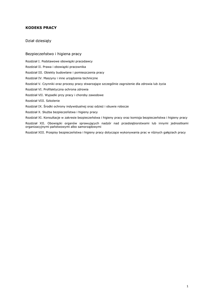 KODEKS PRACY Dział dziesiąty Bezpieczeństwo i higiena pracy Rozdział I. Podstawowe obowiązki pracodawcy Rozdział II. Prawa i obowiązki pracownika Rozdział III. Obiekty budowlane i pomieszczenia pracy Rozdział IV. Maszyny i inne urządzenia techniczne Rozdział V. Czynniki oraz procesy pracy stwarzające szczególnie zagrożenie dla zdrowia lub życia Rozdział VI. Profilaktyczna ochrona zdrowia Rozdział VII. Wypadki przy pracy i choroby zawodowe Rozdział VIII. Szkolenie Rozdział IX. Środki ochrony indywidualnej oraz odzież i obuwie robocze Rozdział X. Służba bezpieczeństwa i higieny pracy Rozdział XI. Konsultacje w zakresie bezpieczeństwa i higieny pracy oraz komisja bezpieczeństwa i higieny pracy Rozdział XII. Obowiązki organów sprawujących nadzór nad przedsiębiorstwami lub innymi jednostkami organizacyjnymi państwowymi albo samorządowymi Rozdział XIII. Przepisy bezpieczeństwa i higieny pracy dotyczące wykonywania prac w różnych gałęziach pracy 1 Rozdział I - Podstawowe obowiązki pracodawcy Art. 207. § 1. Pracodawca ponosi odpowiedzialność za stan bezpieczeństwa i higieny pracy w zakładzie pracy. § 2. Pracodawca jest obowiązany chronić zdrowie i życie pracowników poprzez zapewnienie bezpiecznych i higienicznych warunków pracy przy odpowiednim wykorzystaniu osiągnięć nauki i techniki. W szczególności pracodawca jest obowiązany: 1) organizować prace w sposób zapewniający bezpieczne i higieniczne warunki pracy, 2) zapewniać przestrzeganie w zakładzie pracy przepisów oraz zasad bezpieczeństwa i higieny pracy, wydawać polecenia usunięcia uchybień w tym zakresie oraz kontrolować wykonanie tych poleceń, 3) zapewniać wykonanie nakazów, wystąpień, decyzji i zarządzeń wydawanych przez organy nadzoru nad warunkami pracy, 4) zapewniać wykonanie zaleceń społecznego inspektora pracy. § 3. Pracodawca oraz osoba kierująca pracownikami są obowiązani znać, w zakresie niezbędnym do wykonywania ciążących na nich obowiązków, przepisy o ochronie pracy, w tym przepisy oraz zasady bezpieczeństwa i higieny pracy. Art. 208. § 1. W razie gdy jednocześnie w tym samym miejscu wykonują prace pracownicy zatrudnieni przez różnych pracodawców, pracodawcy ci mają obowiązek: 1) współpracować ze sobą, 2) wyznaczyć koordynatora sprawującego nadzór nad bezpieczeństwem i higieną pracy wszystkich pracowników zatrudnionych w tym samym miejscu, 3) ustalić zasady współdziałania uwzględniające sposoby postępowania w przypadku wystąpienia zagrożeń dla zdrowia lub życia pracowników. § 2. Wyznaczenie koordynatora, o którym mowa w § 1, nie zwalnia poszczególnych pracodawców z obowiązku zapewnienia bezpieczeństwa i higieny pracy zatrudnionym przez nich pracownikom. Art. 209. § 1. (142) Pracodawca rozpoczynający działalność jest obowiązany, w terminie 30 dni od dnia rozpoczęcia tej działalności, zawiadomić na piśmie właściwego inspektora pracy i właściwego państwowego inspektora sanitarnego o miejscu, rodzaju i zakresie prowadzonej działalności. § 2. (143) Obowiązek, o którym mowa w § 1, ciąży na pracodawcy odpowiednio w razie zmiany miejsca, rodzaju i zakresu prowadzonej działalności, zwłaszcza zmiany technologii lub profilu produkcji, jeżeli zmiana technologii może powodować zwiększenie zagrożenia dla zdrowia pracowników. § 3. (144) (skreślony). § 4. Właściwy inspektor pracy lub właściwy państwowy inspektor sanitarny może zobowiązać pracodawcę prowadzącego działalność powodującą szczególne zagrożenia dla zdrowia lub życia pracowników do okresowej aktualizacji informacji, o której mowa w § 1. Rozdział II - Prawa i obowiązki pracownika Art. 210. § 1. W razie gdy warunki pracy nie odpowiadają przepisom bezpieczeństwa i higieny pracy i stwarzają bezpośrednie zagrożenie dla zdrowia lub życia pracownika albo gdy wykonywana przez niego praca grozi takim niebezpieczeństwem innym osobom, pracownik ma prawo powstrzymać się od wykonywania pracy, zawiadamiając o tym niezwłocznie przełożonego. § 2. Jeżeli powstrzymanie się od wykonywania pracy nie usuwa zagrożenia, o którym mowa w § 1, pracownik ma prawo oddalić się z miejsca zagrożenia, zawiadamiając o tym niezwłocznie przełożonego. § 3. Za czas powstrzymania się od wykonywania pracy lub oddalenia się z miejsca zagrożenia w przypadkach, o których mowa w § 1 i 2, pracownik zachowuje prawo do wynagrodzenia. § 4. Pracownik ma prawo, po uprzednim zawiadomieniu przełożonego, powstrzymać się od wykonywania pracy wymagającej szczególnej sprawności psychofizycznej w przypadku, gdy jego stan psychofizyczny nie zapewnia bezpiecznego wykonywania pracy i stwarza zagrożenie dla innych osób. § 5. Przepisy § 1, 2 i 4 nie dotyczą pracownika, którego obowiązkiem pracowniczym jest ratowanie życia ludzkiego lub mienia. § 6. Minister Pracy i Polityki Socjalnej w porozumieniu z Ministrem Zdrowia i Opieki Społecznej określi, w drodze rozporządzenia, rodzaje prac wymagających szczególnej sprawności psychofizycznej. Art. 211. Przestrzeganie przepisów i zasad bezpieczeństwa i higieny pracy jest podstawowym obowiązkiem pracownika. W szczególności pracownik jest obowiązany: 1) znać przepisy i zasady bezpieczeństwa i higieny pracy, brać udział w szkoleniu i instruktażu z tego zakresu oraz poddawać się wymaganym egzaminom sprawdzającym, 2) wykonywać prace w sposób zgodny z przepisami i zasadami bezpieczeństwa i higieny pracy oraz stosować się do wydawanych w tym zakresie poleceń i wskazówek przełożonych, 3) dbać o należyty stan maszyn, urządzeń, narzędzi i sprzętu oraz o porządek i ład w miejscu pracy, 4) stosować środki ochrony zbiorowej, a także używać przydzielonych środków ochrony indywidualnej oraz odzieży i obuwia roboczego, zgodnie z ich przeznaczeniem, 5) poddawać się wstępnym, okresowym i kontrolnym oraz innym zaleconym badaniom lekarskim