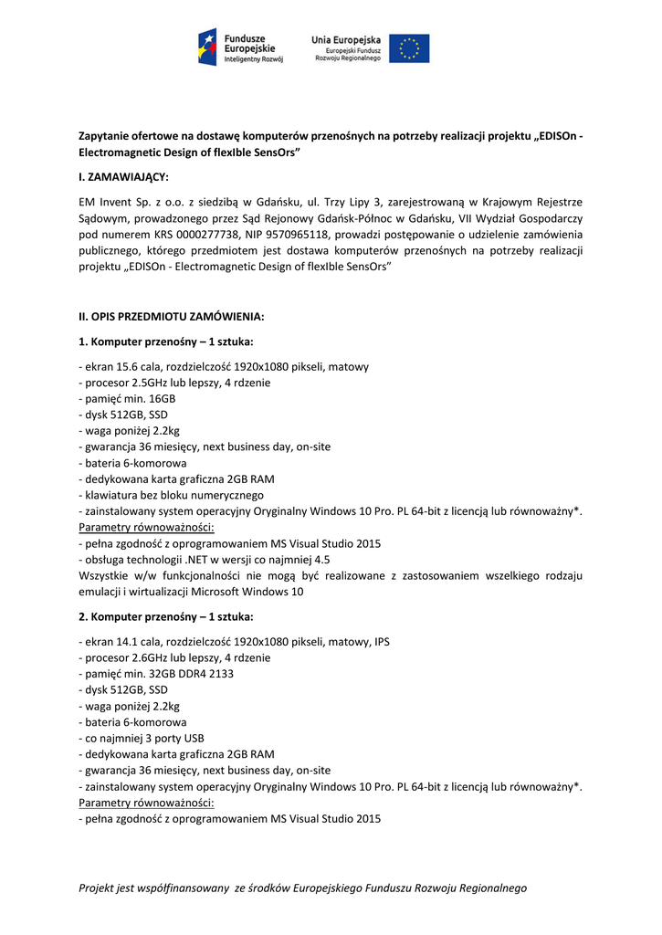Zapytanie ofertowe na dostawę komputerów przenośnych na potrzeby realizacji projektu „EDISOn Electromagnetic Design of flexIble SensOrs” I. ZAMAWIAJĄCY: EM Invent Sp. z o.o. z siedzibą w Gdańsku, ul. Trzy Lipy 3, zarejestrowaną w Krajowym Rejestrze Sądowym, prowadzonego przez Sąd Rejonowy Gdańsk-Północ w Gdańsku, VII Wydział Gospodarczy pod numerem KRS 0000277738, NIP 9570965118, prowadzi postępowanie o udzielenie zamówienia publicznego, którego przedmiotem jest dostawa komputerów przenośnych na potrzeby realizacji projektu „EDISOn - Electromagnetic Design of flexIble SensOrs” II. OPIS PRZEDMIOTU ZAMÓWIENIA: 1. Komputer przenośny – 1 sztuka: - ekran 15.6 cala, rozdzielczość 1920x1080 pikseli, matowy - procesor 2.5GHz lub lepszy, 4 rdzenie - pamięć min. 16GB - dysk 512GB, SSD - waga poniżej 2.2kg - gwarancja 36 miesięcy, next business day, on-site - bateria 6-komorowa - dedykowana karta graficzna 2GB RAM - klawiatura bez bloku numerycznego - zainstalowany system operacyjny Oryginalny Windows 10 Pro. PL 64-bit z licencją lub równoważny*. Parametry równoważności: - pełna zgodność z oprogramowaniem MS Visual Studio 2015 - obsługa technologii .NET w wersji co najmniej 4.5 Wszystkie w/w funkcjonalności nie mogą być realizowane z zastosowaniem wszelkiego rodzaju emulacji i wirtualizacji Microsoft Windows 10 2. Komputer przenośny – 1 sztuka: - ekran 14.1 cala, rozdzielczość 1920x1080 pikseli, matowy, IPS - procesor 2.6GHz lub lepszy, 4 rdzenie - pamięć min. 32GB DDR4 2133 - dysk 512GB, SSD - waga poniżej 2.2kg - bateria 6-komorowa - co najmniej 3 porty USB - dedykowana karta graficzna 2GB RAM - gwarancja 36 miesięcy, next business day, on-site - zainstalowany system operacyjny Oryginalny Windows 10 Pro. PL 64-bit z licencją lub równoważny*. Parametry równoważności: - pełna zgodność z oprogramowaniem MS Visual Studio 2015 Projekt jest współfinansowany ze środków Europejskiego Funduszu Rozwoju Regionalnego - obsługa technologii .NET w wersji co najmniej 4.5 Wszystkie w/w funkcjonalności nie mogą być realizowane z zastosowaniem wszelkiego rodzaju emulacji i wirtualizacji Microsoft Windows 10 *Zamawiający uzna oprogramowanie za równoważne określonemu powyżej, gdy spełni poniższe wymagania: Zamawiający nie dopuszcza zaoferowania pakietów biurowych, programów i planów licencyjnych opartych o rozwiązania chmury oraz rozwiązań wymagających stałych opłat w okresie używania zakupionego produktu. Dla oprogramowania musi być publicznie znany cykl życia przedstawiony przez producenta systemu i dotyczący rozwoju wsparcia technicznego – w szczególności w zakresie bezpieczeństwa. Wymagane jest prawo do instalacji aktualizacji i poprawek do danej wersji oprogramowania, udostępnianych bezpłatnie przez producenta na jego stronie internetowej w okresie co najmniej 5 lat. UWAGA. Obowiązek wykazania równoważności zaoferowanego systemu operacyjnego leży po stronie Wykonawcy. W tym celu Wykonawca winien przedstawić oświadczenie i dokumenty potwierdzające równoważność pakietu oprogramowania biurowego czy też systemu operacyjnego. III. KRYTERIA OCENY OFERT: Oferty potwierdzające gotowość dostarczenia komputerów zgodnie z opisem wskazanym w Opisie Przedmiotu Zamówienia zostaną ocenione przez zamawiającego. Najkorzystniejsza oferta zostanie wybrana w oparciu o kryterium ceny (100%) IV. MIEJSCE I TERMIN SKŁADANIA OFERT: Wykonawcy zainteresowani uzyskaniem zamówienia winni złożyć swoje oferty na formularzu ofertowym, będącym załącznikiem nr 1 do niniejszego Zapytania Ofertowego oraz specyfikację urządzenia, która umożliwi zamawiającemu weryfikację spełnienia wymagań zawartych w Zapytaniu Ofertowym. Oferty należy przesłać w terminie do 31.01.2017 r. do godziny 12:00 na adres: [email protected] Oferty złożone po ww. terminie Zamawiający uzna jako odrzucone. V. FORMA PŁATNOŚCI Wynagrodzenie za zrealizowane zamówienie będzie płatne po podpisaniu przez Strony protokołu odbioru stwierdzającego należyte wykonanie zamówienia, na podstawie prawidłowo wystawionej faktury, przelewem na rachunek bankowy wskazany przez Wykonawcę, w terminie do 14 dni licząc od dnia dostarczenia ww. dokumentów do siedziby Zamawiającego. VI. INNE: Niniejsze ogłoszenie nie stanowi zobowiązania EM Invent Sp. z o.o. do zawarcia umowy. Niniejsze zapytanie nie stanowi podstawy do roszczeń dotyczących zawarcia umowy. Zamówienie współfinansowane jest ze środków Europejskiego Funduszu Rozwoju Regionalnego w ramach Projekt jest współfinansowany ze środków Europejskiego Funduszu Rozwoju Regionalnego Programu Operacyjnego Inteligentny Rozwój 2014 – 2020 (PO IR), Oś IV: Zwiększenie potencjału naukowo-badawczego, Działanie 4.4: Zwiększanie potencjału kadrowego sektora B+R, Program TEAM TECH. Zamawiający zastrzega sobie prawo do unieważnienia postępowania bez podania przyczyny oraz prawo do podjęcia negocjacji z jednym lub kilkoma wykonawcami. Tylko oferty, co najmniej spełniające kryteria wyżej opisane będą brane pod uwagę. VII. Załącznik Załącznik nr 1 - Formularz oferty Projekt jest współfinansowany ze środków Europejskiego Funduszu Rozwoju Regionalnego