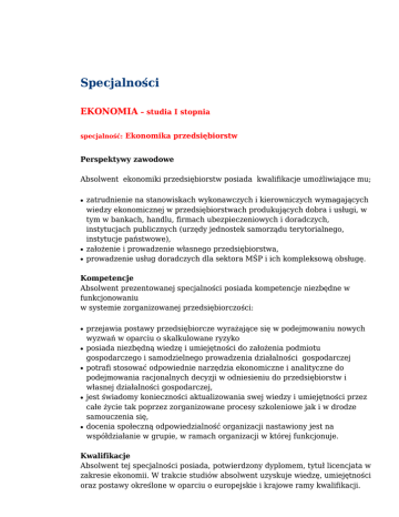 Specjalności EKONOMIA – studia I stopnia specjalność: Ekonomika przedsiębiorstw Perspektywy zawodowe Absolwent ekonomiki przedsiębiorstw posiada kwalifikacje umożliwiające mu; ● ● ● zatrudnienie na stanowiskach wykonawczych i kierowniczych wymagających wiedzy ekonomicznej w przedsiębiorstwach produkujących dobra i usługi, w tym w bankach, handlu, firmach ubezpieczeniowych i doradczych, instytucjach publicznych (urzędy jednostek samorządu terytorialnego, instytucje państwowe), założenie i prowadzenie własnego przedsiębiorstwa, prowadzenie usług doradczych dla sektora MŚP i ich kompleksową obsługę. Kompetencje Absolwent prezentowanej specjalności posiada kompetencje niezbędne w funkcjonowaniu w systemie zorganizowanej przedsiębiorczości: ● ● ● ● ● przejawia postawy przedsiębiorcze wyrażające się w podejmowaniu nowych wyzwań w oparciu o skalkulowane ryzyko posiada niezbędną wiedzę i umiejętności do założenia podmiotu gospodarczego i samodzielnego prowadzenia działalności gospodarczej potrafi stosować odpowiednie narzędzia ekonomiczne i analityczne do podejmowania racjonalnych decyzji w odniesieniu do przedsiębiorstw i własnej działalności gospodarczej, jest świadomy konieczności aktualizowania swej wiedzy i umiejętności przez całe życie tak poprzez zorganizowane procesy szkoleniowe jak i w drodze samouczenia się, docenia społeczną odpowiedzialność organizacji nastawiony jest na współdziałanie w grupie, w ramach organizacji w której funkcjonuje. Kwalifikacje Absolwent tej specjalności posiada, potwierdzony dyplomem, tytuł licencjata w zakresie ekonomii. W trakcie studiów absolwent uzyskuje wiedzę, umiejętności oraz postawy określone w oparciu o europejskie i krajowe ramy kwalifikacji. Umiejętności Zgodnie z europejskimi i krajowymi ramami kwalifikacji absolwenci ekonomiki produkcji posiadają umiejętności niezbędne do prowadzenia własnego przedsiębiorstwa, oraz do funkcjonowania jako specjaliści w innych podmiotach gospodarczych, a w szczególności; ● ● ● ● ● Potrafią rozwiązywać konkretne problemy gospodarcze w zakresie prowadzenia własnego czy powierzonego im podmiotu gospodarczego. Potrafią wykorzystać podstawowe narzędzia i metody analityczne do rozwiązywania problemów decyzyjnych na poziomie mikroekonomicznym. Potrafią pozyskiwać informacje z literatury, baz danych i innych źródeł, analizować i interpretować uzyskane informacje, a także wyciągać wnioski oraz formułować opinie wraz z ich uzasadnieniem, dotyczące obszaru gospodarki i spraw społecznych. Potrafią pracować i komunikować się w zespole rozwiązującym konkretne zagadnienia z zakresu funkcjonowania przedsiębiorstwa. Posiadają praktyczną umiejętność posługiwania się językiem obcym w działalności zawodowej. Dzięki studiom na specjalności „Ekonomika przedsiębiorstw” nauczysz się… ● ● ● ● ● ● ● ● ● ● Jak projektować biznes plan oraz jakie inne czynności wykonać w celu założenia firmy Skąd zdobyć środki i jakie czynniki decydują o jej rozwoju Jak wpływa na funkcjonowanie gospodarstwa domowego i podmiotów gospodarczych ogólna koniunktura, polityka gospodarcza i społeczna, postawy i zachowania ludzi Jak optymalizować zasoby oraz środki finansowe będące w dyspozycji firmy, Jak sięgać po środki unijne w celu finansowania rozwoju firmy Jak działać w konkurencyjnym otoczeniu i jak kształtować politykę własnej lub firmy w której funkcjonujemy Jak współdziałać w grupie społecznej dbając o własny i nie naruszając innych interesów Jak prognozować rozwój firmy i własny Jak funkcjonują podmioty kierujące gospodarką i jakich instrumentów używają Jak globalizacja i instytucje międzynarodowe na nas oddziałują specjalność: Analizy ekonomiczne i rachunkowość Perspektywy zawodowe Absolwent specjalności analiz ekonomicznych i rachunkowości posiada kwalifikacje umożliwiające mu; ● ● ● dministracyjnych czy społecznych w celu analizowania i przetwarzania danych związanych z ich funkcjonowaniem, pracy w firmach outsourcingowych, oraz w centrach logistycznych, przy analizowaniu i przetwarzaniu danych, prowadzenia własnych firm usługowo-rozliczeniowych. Kompetencje Absolwent specjalności „Analizy ekonomiczne i rachunkowość” posiada ogólne kompetencje ekonomiczne oraz specjalistyczne kompetencji zawodowe, w szczególności; ● ● ● ● ● ● zna i rozumie zachowania funkcjonowanie organizacji i podmiotów szczególnie w zakresie ich gospodarek finansowych, zna podstawy tworzenia, funkcjonowania i rozwoju przedsiębiorstw, zna zasady zarządzania aktywami i pasywami podmiotów gospodarczych, publicznych i społecznych, oraz zasady sporządzania sprawozdań finansowych, zna podstawowe techniki pozyskiwania i przetwarzania danych pozwalające opisywać wzajemne zależności i procesy ekonomiczne i społeczne, posiada elementarną wiedzę o normach prawnych i umowach prawa gospodarczego w obszarze działalności gospodarczej, potrafi wykorzystywać posiadaną wiedzę do planowania systemów finansowych przedsiębiorstwa, analizy finansowej prowadzonych działań gospodarczych. Umiejętności Absolwenci specjalności „Analizy ekonomiczne i rachunkowość” posiadają umiejętności niezbędne do przeprowadzenia wszelkiego typu analiz, związanych zwłaszcza ze sferą finansową działalności gospodarczej i społecznej, w szczególności; ● Potrafią posługiwać się wybranymi metodami analizy finansowej w ocenie kondycji danego podmiotu, ● ● ● ● Potrafią wykorzystywać podstawowe narzędzia i metody analityczne do prognozowania zjawisk gospodarczych, Potrafią pozyskiwać informacje z baz danych, oraz tworzyć własne zbiory celem właściwej oceny analizowanego podmiotu, Posiadają elementarne umiejętności badawcze, analityczne i prognostyczne pozwalające na wskazanie przyczyn i skutków podejm