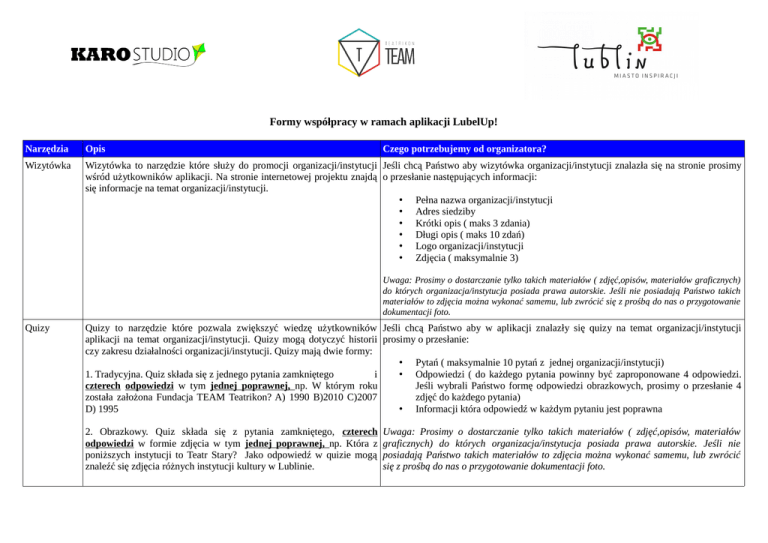 Formy współpracy w ramach aplikacji LubelUp! Narzędzia Opis Czego potrzebujemy od organizatora? Wizytówka Wizytówka to narzędzie które służy do promocji organizacji/instytucji Jeśli chcą Państwo aby wizytówka organizacji/instytucji znalazła się na stronie prosimy wśród użytkowników aplikacji. Na stronie internetowej projektu znajdą o przesłanie następujących informacji: się informacje na temat organizacji/instytucji. • Pełna nazwa organizacji/instytucji • Adres siedziby • Krótki opis ( maks 3 zdania) • Długi opis ( maks 10 zdań) • Logo organizacji/instytucji • Zdjęcia ( maksymalnie 3) Uwaga: Prosimy o dostarczanie tylko takich materiałów ( zdjęć,opisów, materiałów graficznych) do których organizacja/instytucja posiada prawa autorskie. Jeśli nie posiadają Państwo takich materiałów to zdjęcia można wykonać samemu, lub zwrócić się z prośbą do nas o przygotowanie dokumentacji foto. Quizy Quizy to narzędzie które pozwala zwiększyć wiedzę użytkowników Jeśli chcą Państwo aby w aplikacji znalazły się quizy na temat organizacji/instytucji aplikacji na temat organizacji/instytucji. Quizy mogą dotyczyć historii prosimy o przesłanie: czy zakresu działalności organizacji/instytucji. Quizy mają dwie formy: • Pytań ( maksymalnie 10 pytań z jednej organizacji/instytucji) 1. Tradycyjna. Quiz składa się z jednego pytania zamkniętego i • Odpowiedzi ( do każdego pytania powinny być zaproponowane 4 odpowiedzi. czterech odpowiedzi w tym jednej poprawnej, np. W którym roku Jeśli wybrali Państwo formę odpowiedzi obrazkowych, prosimy o przesłanie 4 została założona Fundacja TEAM Teatrikon? A) 1990 B)2010 C)2007 zdjęć do każdego pytania) D) 1995 • Informacji która odpowiedź w każdym pytaniu jest poprawna 2. Obrazkowy. Quiz składa się z pytania zamkniętego, czterech odpowiedzi w formie zdjęcia w tym jednej poprawnej, np. Która z poniższych instytucji to Teatr Stary? Jako odpowiedź w quizie mogą znaleźć się zdjęcia różnych instytucji kultury w Lublinie. Uwaga: Prosimy o dostarczanie tylko takich materiałów ( zdjęć,opisów, materiałów graficznych) do których organizacja/instytucja posiada prawa autorskie. Jeśli nie posiadają Państwo takich materiałów to zdjęcia można wykonać samemu, lub zwrócić się z prośbą do nas o przygotowanie dokumentacji foto. Narzędzia Opis Czego potrzebujemy od organizatora? Infografiki Na stronie internetowej projektu znajdą się infografiki, który w prosty Jeśli chcą Państwo wykorzystać tę formę prosimy o kontakt, wtedy na spotkaniu sposób zaprezentują najważniejsze praktyczne informacje np. co zrobić ustalimy dokładnie jakich informacji potrzebujemy i jak najlepiej je zaprezentować. jak ma się pomysł na realizację działania w dzielnicy? Check-in To narzędzie, które dzięki lokalizatorowi GPS pozwala sprawdzić, czy Od organizacji/instytucji zainteresowanych wykorzystaniem tego narzędzie oczekujemy: użytkownik gry w danym momencie pojawił się w wymaganym 1. W przypadku wybrania pierwszej opcji – wystarczy deklaracja miejscu. Narzędzie można wykorzystać do: i informacje o organizacji/instytucji zaprezentowane w opisie Wizytówki 1. Zaproszenia uczestników do odwiedzenia danego miejsca przez 2. W przypadku drugiej opcji będziemy potrzebowali informacji o miejscu, dacie i cały czas trwania rozgrywki ( np. użytkownik zostaje godzinie rozpoczęcia i zakończenia wydarzenia, a także krótkiego opisu nagrodzony za odwiedzenie Domu Kultury Narnia w dowolnym wydarzenia momencie trwania rozgrywki) 3. W przypadku wybrania opcji trzeciej będziemy potrzebowali tych samych 2. Zachęcenia uczestników do wzięcia udziału w wydarzeniu, np. informacji co w punkcie 2 i dodatkowo informacji ile osób chcieliby Państwo, w spektaklu teatralnym w Domu Kultury Narnia, który odbywa żeby za pomocą aplikacji zebrało się jednocześnie podczas wydarzenia. się 10.10.2015 o godzn. 15:00 – 16:00. Uczestnicy gry zostaną nagrodzeni za zalogowanie się w DK Narnia tego konkretnego dnia w czasie trwania wydarzenia. 3. Zachęcenia uczestników do grupowego uczestniczenia w wydarzeniu. np. Dom Kultury Narnia chciałby, żeby w pikniku z okazji dnia sąsiada wzięło udział 100 młodych osób. Piknik zaczyna się o godzinie 15:00. Użytkownicy gry zostaną nagrodzeni, jeśli w umówionym miejscu o umówionej godzinie zaloguje się jednocześnie 100 osób. Kody QR Kody QR możemy wykorzystać jeśli chcemy bardziej zaangażować Jeśli są Państwo zainteresowani wykorzystaniem tego narzędzia prosimy o kontakt w uczestników gry w działanie na rzecz danej organizacji. celu ustalenia szczegółowych informacji i sposobu współpracy. Przykładowe zastosowanie narzędzia: 1. Pozyskanie wolontariuszy do projektu, np. Dom Kultury Narnia potrzebuje pomocy 2 osób przy organizacji warsztatów dla dzieci. Jeśli 2 graczy przyjdzie i zaangażuje się w organizację warsztatów, to na zakończenie swojej pracy dostaną od osoby Narzędzia Opis odpowiedzialnej za wydarzenie, kod QR, który będą mogli zeskanować i otrzymać nagrodę przypisaną do tego zadania. 2. Zachęcenie do spotkania/rozmowy z pracownikiem/pracowniczką instytucji/organizacji. 3. Zachęcenie młodych ludzi do udziału w organizowanym wydarzeniu. Kontakt: Dariusz Figura tel: 609323042 e-mial: [email protected] Aleksandra Iwańska tel: 698670703 e-mail: [email protected] Czego potrzebujemy od organizatora?