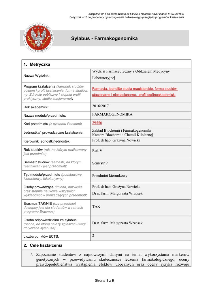 Załącznik nr 1 do zarządzenia nr 54/2015 Rektora WUM z dnia 14.07.2015 r. Załącznik nr 2 do procedury opracowywania i okresowego przeglądu programów kształcenia Sylabus - Farmakogenomika 1. Metryczka Wydział Farmaceutyczny z Oddziałem Medycyny Nazwa Wydziału: Program kształcenia (kierunek studiów, poziom i profil kształcenia, forma studiów, np. Zdrowie publiczne I stopnia profil praktyczny, studia stacjonarne): Laboratoryjnej Farmacja, jednolite studia magisterskie, forma studiów: stacjonarne i niestacjonarne, profil ogólnoakademicki Rok akademicki: 2016/2017 Nazwa modułu/przedmiotu: FARMAKOGENOMIKA Kod przedmiotu (z systemu Pensum): 29556 Jednostka/i prowadząca/e kształcenie: Kierownik jednostki/jednostek: Zakład Biochemii i Farmakogenomiki Katedra Biochemii i Chemii Klinicznej Prof. dr hab. Grażyna Nowicka Rok studiów (rok, na którym realizowany jest przedmiot): Rok V Semestr studiów (semestr, na którym realizowany jest przedmiot): Semestr 9 Typ modułu/przedmiotu (podstawowy, kierunkowy, fakultatywny): Przedmiot kierunkowy Osoby prowadzące (imiona, nazwiska oraz stopnie naukowe wszystkich wykładowców prowadzących przedmiot): Prof. dr hab. Grażyna Nowicka Dr n. farm. Małgorzata Wrzosek Erasmus TAK/NIE (czy przedmiot dostępny jest dla studentów w ramach programu Erasmus): TAK Osoba odpowiedzialna za sylabus (osoba, do której należy zgłaszać uwagi dotyczące sylabusa): Dr n. farm. Małgorzata Wrzosek Liczba punktów ECTS: 2 2. Cele kształcenia 1. Zapoznanie studentów z najnowszymi danymi na temat wykorzystania markerów genetycznych w przewidywaniu skuteczności leczenia farmakologicznego, oceny prawdopodobieństwa wystąpienia efektów ubocznych oraz oceny ryzyka rozwoju Strona 1 z 6 Załącznik nr 1 do zarządzenia nr 54/2015 Rektora WUM z dnia 14.07.2015 r. Załącznik nr 2 do procedury opracowywania i okresowego przeglądu programów kształcenia procesów patologicznych 2. Wykształcenie umiejętności posługiwania się markerami genetycznymi i korzystania z nowych danych naukowych określających ich użyteczność w praktyce klinicznej 3. Kształtowanie zdolności do twórczego rozwiązywania problemów w oparciu o nowoczesne narzędzia badawcze z zakresu genomiki 4. Kształtowanie umiejętności interpretacji nowych danych naukowych z zakresu farmakogenomiki poprzez przygotowywanie prezentacji opartych na wynikach badań naukowych oraz umiejętności stawiania nowych pytań i szukania odpowiedzi poprzez przygotowywanie programów badawczych 3. Wymagania wstępne 1. Zna mechanizmy metabolizmu leków. 2. Zna mechanizmy regulacji procesów metabolicznych i ich modyfikacji przez środki farmakologiczne 3. Zna główne czynniki wpływające na właściwości farmakokinetyczne i farmakodynamiczne leków 4. Zna patogenezę chorób występujących z dużą częstością oraz zasady ich leczenia 5. Zna podstawy genetyki oraz genetycznego zróżnicowania populacji 6. Zna podstawowe metody stosowane w badaniach genetycznych. 4. Przedmiotowe efekty kształcenia Lista efektów kształcenia Symbol przedmiotowego efektu kształcenia Symbol tworzony przez osobę wypełniającą sylabus (kategoria: W-wiedza, U-umiejętności, K-kompetencje oraz numer efektu) Treść przedmiotowego efektu kształcenia Odniesienie do efektu kierunkowego (numer) Efekty kształcenia określają co student powinien wiedzieć, rozumieć i być zdolny wykonać po zakończeniu zajęć. Efekty kształcenia wynikają z celów danego przedmiotu. Osiągniecie każdego z efektów powinno być zweryfikowane, aby student uzyskał zaliczenie. Numer kierunkowego efektu kształcenia zawarty w Rozporządzeniu Ministra Nauki bądź Uchwały Senatu WUM właściwego kierunku studiów. W1 Wymienia udokumentowane w dotychczasowych badaniach farmakogenomicznych warianty genetyczne istotne w ocenie skuteczności i bezpieczeństwa terapii farmakologicznej D.W.14 W2 Wymienia wynikające z dotychczasowych badań farmakogenomicznych wskazania i przeciwwskazania do stosowania określonych leków D.W.19 W3 Przedstawia zasady indywidualizacji farmakoterapii uwzględniające różnice w działaniu leków spowodowane czynnikami E.W.12 Strona 2 z 6 Załącznik nr 1 do zarządzenia nr 54/2015 Rektora WUM z dnia 14.07.2015 r. Załącznik nr 2 do procedury opracowywania i okresowego przeglądu programów kształcenia genetycznymi U1. Uzasadnia wpływ czynników genetycznych na skuteczność i bezpieczeństwo leków oraz konieczność zmian dawkowania leku u indywidualnego chorego w zależności od czynników genetycznych D.U.7, D.U10 U2 Przewiduje wystąpienie działania niepożądanego leku w oparciu o badania genetyczne D.U48 U3 Interpretuje wyniki badań farmakogenomicznych E.U.55 5. Formy prowadzonych zajęć Liczba grup Minimalna liczba osób w grupie Forma Liczba godzin Wykład 10 nieobowiązkowe Seminarium 20 nieobowiązkowe nieobowiązkowe Ćwiczenia 6. Tematy zajęć i treści kształcenia W1. Indywidualizacja działań terapeutycznych-miejsce farmakogenomiki. Markery genetyczne w ocenie ryzyka chorób oraz przewidywaniu skuteczności i bezpieczeństwa terapii (W1) W2. Farmakogenomika w chorobach układu krążenia (W1, W2, W3) W3. Farmakogenomika w leczeniu zaburzeń gospodarki lipidowej i węglowodanowej (W1, W2, W3) W4. Farmakogenomika w leczeniu chorób nowotworowych (W1, W2, W3) W5. Farmakogenomika a Nutrigenomika. Zastosowanie badań genetycznych w ocenie interakcji między lekami a żywnością oraz ich wpływie na skuteczność i bezpieczeństwo terapii (W3, U1) S1. Farmakogenetyka i farmakogenomika – podstawy, zasady, perspektywy. Diagnoza genetyczna a terapia (U1, U2) S2. Narzędzia farmakogenomiki – technologie, metody badawcze, metody statystyczne (W3, U3). Wykrywanie i pomiar zmienności genetycznej, narzędzia skriningowe i diagnostyczne S3. Farmakogenomika w psychiatrii w świetle danych z piśmiennictwa światowego (W1,W2,U1,U2) S4. Najnowsze badania z zakresu farmakogenomiki – pr