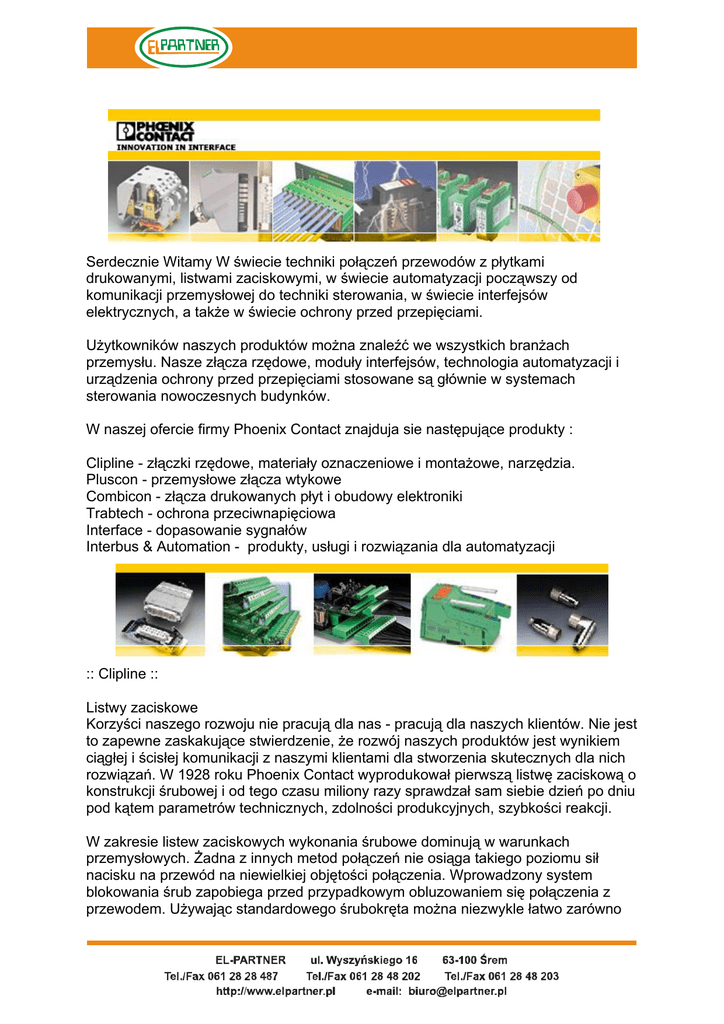 Serdecznie Witamy W świecie techniki połączeń przewodów z płytkami drukowanymi, listwami zaciskowymi, w świecie automatyzacji począwszy od komunikacji przemysłowej do techniki sterowania, w świecie interfejsów elektrycznych, a także w świecie ochrony przed przepięciami. Użytkowników naszych produktów można znaleźć we wszystkich branżach przemysłu. Nasze złącza rzędowe, moduły interfejsów, technologia automatyzacji i urządzenia ochrony przed przepięciami stosowane są głównie w systemach sterowania nowoczesnych budynków. W naszej ofercie firmy Phoenix Contact znajduja sie następujące produkty : Clipline - złączki rzędowe, materiały oznaczeniowe i montażowe, narzędzia. Pluscon - przemysłowe złącza wtykowe Combicon - złącza drukowanych płyt i obudowy elektroniki Trabtech - ochrona przeciwnapięciowa Interface - dopasowanie sygnałów Interbus & Automation - produkty, usługi i rozwiązania dla automatyzacji :: Clipline :: Listwy zaciskowe Korzyści naszego rozwoju nie pracują dla nas - pracują dla naszych klientów. Nie jest to zapewne zaskakujące stwierdzenie, że rozwój naszych produktów jest wynikiem ciągłej i ścisłej komunikacji z naszymi klientami dla stworzenia skutecznych dla nich rozwiązań. W 1928 roku Phoenix Contact wyprodukował pierwszą listwę zaciskową o konstrukcji śrubowej i od tego czasu miliony razy sprawdzał sam siebie dzień po dniu pod kątem parametrów technicznych, zdolności produkcyjnych, szybkości reakcji. W zakresie listew zaciskowych wykonania śrubowe dominują w warunkach przemysłowych. Żadna z innych metod połączeń nie osiąga takiego poziomu sił nacisku na przewód na niewielkiej objętości połączenia. Wprowadzony system blokowania śrub zapobiega przed przypadkowym obluzowaniem się połączenia z przewodem. Używając standardowego śrubokręta można niezwykle łatwo zarówno łączyć przewody jak i manipulować innymi przełączalnymi elementami. Przez użycie do połączeń materiałów o wysokiej jakości, połączenia o długotrwałej stabilności mogą być tworzone nawet dla najsurowszych warunków. Technologia śrubowa jest niezastąpiona wtedy, gdy należy przesyłać wielkie moce. Złącza o przekrojach do 240mm2 mogą przewodzić prądy o wartościach przekraczających 400A. UK Universal Terminal Blocks - uniwersalne listwy o zaciskach śrubowych. Słowo uniwersalny oznacza uniwersalną stopę, które może być zatrzaskiwana na dwóch profilach szyn DIN 35 oraz 32 (TS35 odpowiednik Phoenix Contact to NS 35 ). Precyzyjne stopniowanie przekroi od 0.2 do 240 mm2 oznacza możliwość precyzyjnego doboru złącza do stosowanych przewodów oszczędzając przy tym pieniądze i przestrzeń. Obudowy listew zaciskowych, wykonywane z nie łamliwego poliamidu 6.6, posiadają lejkowe wejścia przewodów dla ich łatwego wprowadzania w zaciski. Każda listwa może być indywidualnie opisywana przy minimum kosztów. Maksimum bezpieczeństwa jest standardem. Tworzywa wypełniają w wymagania klasy palności V0 zgodnie z UL94 , są wolne od halogenu oraz nie łamliwe. Jeśli można coś zrobić tutaj, można to zrobić wszędzie. Platformy wiertnicze, rafinerie, zakłady chemiczne to najcięższa rzeczywistość dla naszych listew zaciskowych i nawet wykonania standardowe wypełniają najwyższe wymagania. Aprobary Ex są zgodne z dyrektywą ATEX 100a . Optymalne opisywanie. Szybki i czytelne opisy zwłaszcza przy zastosowaniu elastycznego systemu komputerowego opisywania (CMS ). W sytuacjach ekstremalnych każdy reaguje inaczej, ale wszystkie listwy zaciskowe Phoenix Contact zachowują się w ten sam sposób. Zasada REAKDYN chrini śruby w listwach zaciskowych przed obluzowaniem podczas pracy. Równocześnie nawet najcieńsze przewody mogą być pewnie połączone pod stabilnym wielkim naciskiem. :: Pluscon :: W każdym systemie automatyki, gdzie są prowadzone sygnały analogowe, binarne i zasilające wymagane są niezawodne, a jednocześnie proste w doborze i obsłudze złącza przemysłowe. PLUSCON stanowi tę grupę produktów z której użytkownik może wybrać złącza wielostykowe w obudowach, złącza do czujników, czy też obwodów drukowanych o stopniu ochrony do IP 65 . Wygodnym narzędziem, które ułatwia dobór produktów PLUSCON jest konfigurator dostępny pod adresem www.select.phoenixocntact.com Dodatkowe informacje pod adresem: www.pluscon.phoenixcontact.com PLUSCON-VC-Variocon Złącza są zestawiane z segmentów na 2, 6 i 8 styków dla sygnałów oraz zasilania i umieszczane w obudowach prostokątnych. Gniazda są montowane bezpośrednio na płytce drukowanej lub ściance urządzenia. Zestaw gniazdo - wtyk tworzy zestaw o stopniu ochrony do IP 65. PLUSCON-RC-Round Connector Okrągłe złącza dla sygnałów i zasilania w obudowach metalowych standardu M23. Maksymalnie w wersji na 19 styków. Wszystkie w stopniu ochrony IP 65 i w wersji EMC. PLUSCON-SACB i SAC - Sensor/Actuator Boxes i Sensor/Actuator Cabling Okablowanie czujników i urządzeń wykonawczych które posiada standardowe przyłącza M8 i M12. Dostępne są skrzynki przyłączeniowe dla kilku wejść/wyjść, z kablem zbiorczym oraz opcjonalnie z sygnalizacją LED. Okablowanie czujników z przyłączami M8 i M12 jest dostępne o wymaganej przez instalację długości. QUICKON Podłączenia elementów okablowania z system przyłączy nożowych, dla których nie jest wymagane odizolowywanie podłączanych przewodów. Złącza QUICKON występują w wersji na 2 i 3 przewody. Stopień ochrony przed czynnikami zewnętrznymi to IP67 . PLUSCON-HC-Heavycon Złącza przemysłowe wielostykowe w obudowach plastikowych lub metalowych dla użytkowania w surowych warunkach przemysłowych. PLUSCON-HCM-Heavycon Modular Złącza przemysłowe zestawiane z modułów w których mogą być łączone sygnały elektryczne (zasilanie, pomiary, HF) do 40 A oraz sygnały pneumatyczne do 8 bar. Złącza mogą być umieszczone w obudowa