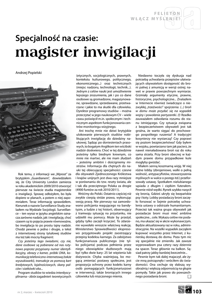Felieton Włącz myślenie! Specjalność na czasie: magister inwigilacji Andrzej Popielski Rok temu, z informacji we „Wprost” za brytyjskim „Guardianem”, dowiedziałem się, że City University London zamierza w roku akademickim 2009/2010 otworzyć pierwsze na świecie studia magisterskie o inwigilacji. Sprawę odłożyłem, bo była dopiero w planach, a potem o niej zapomniałem. Teraz informację sprawdziłem. Kierunek o nazwie Surveillance Study znalazłem na Wydziale Socjologii. Surveillance – ten wyraz w języku angielskim oznacza zarówno nadzór, jak i inwigilację, choć czasem są to pojęcia prawie równoważne, bo inwigilacja to po prostu tajny nadzór. Chodzi pewnie o jedno i drugie, a tekst z internetowej strony tytułowej studiów ma też taki mocny fragment: Czy jesteśmy tego świadomi, czy nie, dane osobowe są pobierane od nas rutynowo poprzez przypisany numer identyfikacyjny, obrazy z kamer, próbki DNA, komunikację telefoniczno-internetową (także wyszukiwarki), transakcje za pomocą kart kredytowych, lojalnościowych, skany palców i siatkówki oka... Program studiów to wiedza interdyscyplinarna – zbiór zagadnień teoretycznych nr 2, marzec – kwiecień 2010 (etycznych, socjologicznych, prawnych, kontekstu kulturowego, politycznego, ekonomicznego...) oraz technicznych (miejsc nadzoru, technologii, technik...). Jednym z celów nauki jest umożliwienie lepszego zrozumienia, jak i po co dane osobowe są gromadzone, magazynowane, sprawdzane, sprzedawane, przetwarzane i jakie to ma skutki dla człowieka. Dyrektor programowy studiów – można przeczytać w jego naukowym CV – wiele czasu poświęcił m.in. społecznym i technicznym aspektom funkcjonowania centrów monitoringu wizyjnego. Ani trochę mnie nie dziwi brytyjskie ulokowanie pierwszych studiów nobilitujących inwigilację do dziedziny naukowej. Sądząc po doniesieniach prasowych, to bogatym Anglikom ten wścibski nadzór doskwiera. Choć w tej dziedzinie jesteśmy tylko biednym krewnym, co mnie nie martwi, ale nie mam złudzeń – jesteśmy ambitni i dościgniemy mistrzów. Informacja dla chętnych do nauki tej obiecującej specjalności: czesne dla obywateli Zjednoczonego Królestwa i krajów unijnych jest dwa razy mniejsze w porównaniu do tzw. reszty świata, ale i tak dla przeciętnego Polaka za drogie (4900 funtów za rok 2010/2011). Wróćmy do Polski. Ostatnio częściej niż zwykle cierpią stróże prawa, wykonując swoją pracę. Nie pierwszy raz zamordowano policjanta reagującego na bandytyzm, a ludzie z tej historii, obserwujący z tramwaju sytuację na przystanku, nie udzielili mu pomocy. Może by przeżył, gdyby tylko zaczęli krzyczeć. To zdarzenie wywołało wreszcie właściwą reakcję. Ministerstwo Sprawiedliwości ekspresowo przygotowało projekt zaostrzający przepisy kodeksu karnego. Za zabójstwo funkcjonariusza publicznego (nie tylko policjanta) podczas pełnienia przez niego obowiązków służbowych mają być tylko dwie kary: 25 lat więzienia lub dożywocie. Chyba ważniejszą, bo mogącą zmieniać postawy społeczne, jest propozycja ochrony przez kodeks karny osób pomagających funkcjonariuszowi w interwencji, także broniących innego człowieka lub niszczonego mienia. Niedawno toczyła się dyskusja nad potrzebą uchwalania przepisów ułatwiających obywatelom dostępność do broni palnej z amunicją w wersji ostrej; nawet w prawie powszechnym wymiarze. Grzmiały argumenty etyczne, prawne, historyczne, psychologiczne... Znalazłem w Internecie również świadczące o niezwykłej „trzeźwości” spojrzenia: (...) broń w domu może przydać się na wypadek wojny i powołania partyzantki. (!) Rzadko zauważałem odwołania rozumu do stanu istniejącego. Czy sytuacja związana z bezpieczeństwem obywateli jest tak groźna, że warto sięgać do prochowego pospolitego ruszenia? A tradycyjni kosynierzy nie wystarczą? Czy poprawi się poziom bezpieczeństwa? Gdy byłem w wojsku, powtarzano tam jak pacierz, że nawet nienaładowana broń raz do roku sama strzela. Przy broni obecnej w każdym prawie domu przypadkowe kule mogłyby gwizdać. Miałem senną koszmarną wizję. W niej różne lobby (zbrojeniowe, walki o pełną wolność, antypacyfistów, stowarzyszenia myśliwych w walce o postęp itd.) przeforsowały ustawę. Spotkałem nielubianego sąsiada z długim i ciężkim futerałem. Pewnie niósł wędki. Rynek szybko nasycił się bronią. Gdzieś ukryły się bezpańskie psy i koty. Lobby posiadaczy broni zaczęło forsować w Sejmie potrzebę uchwalenia ustawy o odstrzale humanitarnym. Przecież tak ważna grupa obywateli jak posiadacze broni musi mieć ambitne społeczne... cele. Wykazu celów nie podano, ma ukazać się w akcie wykonawczym. Będzie aktualizowany raz w roku, administracyjnie. Na wszelki wypadek zacząłem kupować wszystko przez Internet, z kurierską dostawą do domu. Poza tym nic się specjalnie nie zmieniło. Jak zawsze wyprowadzam psa cztery razy dziennie na spacer. Teraz głównie na balkon. Sąsiad patrzy jakby bardziej bezczelnie... Pewnie bym tak dalej majaczył, ale życie mną potrząsnęło i wróciłem do świadomości. Ona cechuje się słabszą wyobraźnią i większą odpornością na głupie pomysły. Takie jak prawo do powszechnego posiadania broni. n 103