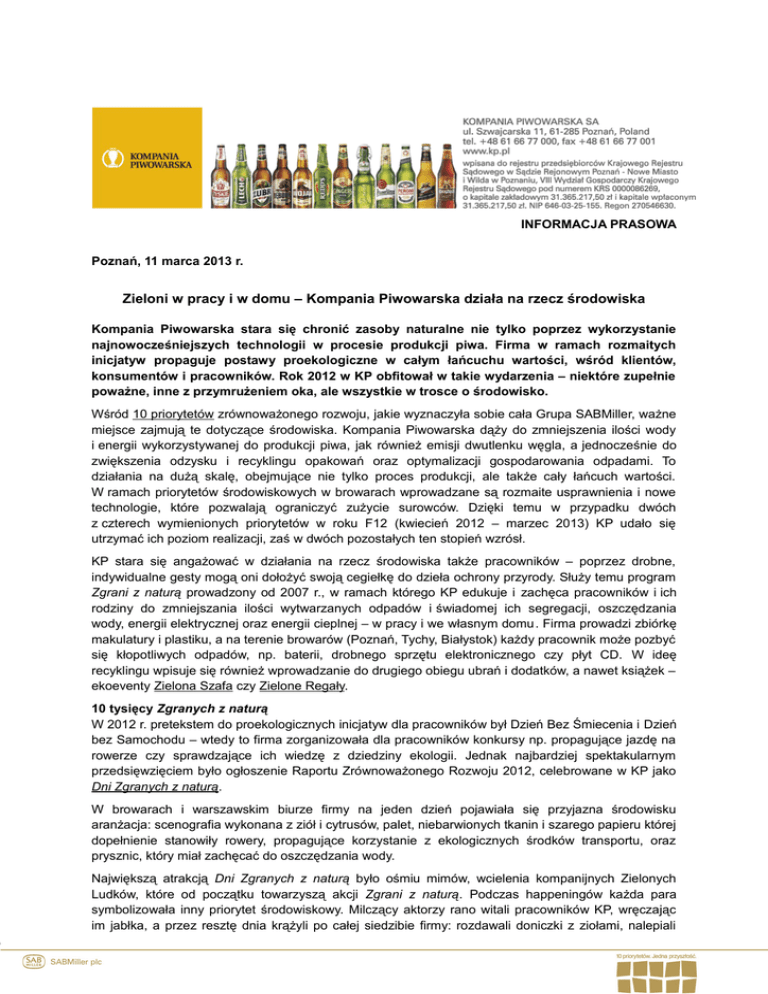 INFORMACJA PRASOWA Poznań, 11 marca 2013 r. Zieloni w pracy i w domu – Kompania Piwowarska działa na rzecz środowiska Kompania Piwowarska stara się chronić zasoby naturalne nie tylko poprzez wykorzystanie najnowocześniejszych technologii w procesie produkcji piwa. Firma w ramach rozmaitych inicjatyw propaguje postawy proekologiczne w całym łańcuchu wartości, wśród klientów, konsumentów i pracowników. Rok 2012 w KP obfitował w takie wydarzenia – niektóre zupełnie poważne, inne z przymrużeniem oka, ale wszystkie w trosce o środowisko. Wśród 10 priorytetów zrównoważonego rozwoju, jakie wyznaczyła sobie cała Grupa SABMiller, ważne miejsce zajmują te dotyczące środowiska. Kompania Piwowarska dąży do zmniejszenia ilości wody i energii wykorzystywanej do produkcji piwa, jak również emisji dwutlenku węgla, a jednocześnie do zwiększenia odzysku i recyklingu opakowań oraz optymalizacji gospodarowania odpadami. To działania na dużą skalę, obejmujące nie tylko proces produkcji, ale także cały łańcuch wartości. W ramach priorytetów środowiskowych w browarach wprowadzane są rozmaite usprawnienia i nowe technologie, które pozwalają ograniczyć zużycie surowców. Dzięki temu w przypadku dwóch z czterech wymienionych priorytetów w roku F12 (kwiecień 2012 – marzec 2013) KP udało się utrzymać ich poziom realizacji, zaś w dwóch pozostałych ten stopień wzrósł. KP stara się angażować w działania na rzecz środowiska także pracowników – poprzez drobne, indywidualne gesty mogą oni dołożyć swoją cegiełkę do dzieła ochrony przyrody. Służy temu program Zgrani z naturą prowadzony od 2007 r., w ramach którego KP edukuje i zachęca pracowników i ich rodziny do zmniejszania ilości wytwarzanych odpadów i świadomej ich segregacji, oszczędzania wody, energii elektrycznej oraz energii cieplnej – w pracy i we własnym domu . Firma prowadzi zbiórkę makulatury i plastiku, a na terenie browarów (Poznań, Tychy, Białystok) każdy pracownik może pozbyć się kłopotliwych odpadów, np. baterii, drobnego sprzętu elektronicznego czy płyt CD. W ideę recyklingu wpisuje się również wprowadzanie do drugiego obiegu ubrań i dodatków, a nawet książek – ekoeventy Zielona Szafa czy Zielone Regały. 10 tysięcy Zgranych z naturą W 2012 r. pretekstem do proekologicznych inicjatyw dla pracowników był Dzień Bez Śmiecenia i Dzień bez Samochodu – wtedy to firma zorganizowała dla pracowników konkursy np. propagujące jazdę na rowerze czy sprawdzające ich wiedzę z dziedziny ekologii. Jednak najbardziej spektakularnym przedsięwzięciem było ogłoszenie Raportu Zrównoważonego Rozwoju 2012, celebrowane w KP jako Dni Zgranych z naturą. W browarach i warszawskim biurze firmy na jeden dzień pojawiała się przyjazna środowisku aranżacja: scenografia wykonana z ziół i cytrusów, palet, niebarwionych tkanin i szarego papieru której dopełnienie stanowiły rowery, propagujące korzystanie z ekologicznych środków transportu, oraz prysznic, który miał zachęcać do oszczędzania wody. Największą atrakcją Dni Zgranych z naturą było ośmiu mimów, wcielenia kompanijnych Zielonych Ludków, które od początku towarzyszą akcji Zgrani z naturą. Podczas happeningów każda para symbolizowała inny priorytet środowiskowy. Milczący aktorzy rano witali pracowników KP, wręczając im jabłka, a przez resztę dnia krążyli po całej siedzibie firmy: rozdawali doniczki z ziołami, nalepiali wlepki z zasadami Zgranych z naturą oraz odgrywali scenki na temat proekologicznych zachowań. Dodatkowo tego dnia na specjalnym stoisku ekojazdy można było sprawdzić swój refleks oraz nauczyć się w sposób ekonomiczny i przyjazny środowisku prowadzić samochód. Tutaj wstawmy film z Dni zgranych z naturą: http://www.youtube.com/watch?v=QFEi64gCMKc Inicjatywa Zgranych z naturą została rozszerzona na cały kraj, bowiem Kompania Piwowarska wspólnie z siecią Biedronka w październiku przeprowadziła w 14 polskich miastach akcję ekologiczną. Klienci, którzy przynieśli do wybranych sklepów 5 szklanych lub aluminiowych opakowań, mogli je wymienić na praktyczną ekotorbę. W akcji wzięło udział kilka tysięcy osób, które otrzymały ponad 10 tysięcy toreb i w sumie zgromadziły ponad 10 ton surowców wtórnych. Butelka zwrotna wszystkim się opłaca We wrześniu 2012 r. KP rozpoczęła się również akcję „Ekologia się opłaca”, skierowaną do konsumentów oraz partnerów handlowych – detalistów, podejmując istotny temat opakowań zwrotnych. W 1850 sklepach w Warszawie pojawiły się ulotki i plakaty podkreślające oszczędności i korzyści dla środowiska związane z opakowaniami zwrotnymi. Przedstawiciele sił sprzedaży edukowali właścicieli sklepów, które nie mają w swojej ofercie piwa w butelkach zwrotnych, na temat znaczenia tego rodzaju opakowania w handlu tradycyjnym. Innym przejawem działań firmy na rzecz środowiska są ekologiczne, a zarazem designerskie torby z nieużywanych już bannerów reklamowych marek KP. Ich uszycie powierzono Zakładowi Aktywności Zawodowej z Piły – przedsiębiorstwo to zajmuje się m.in. aktywizacją zawodową osób z umiarkowaną i znaczą niepełnosprawnością, ze szczególnym uwzględnieniem osób z upośledzeniem umysłowym i chorych psychicznie. Akcja proekologiczna przyniosła zatem dodatkową korzyść – pomoc społeczności lokalnej, co pokazuje, że działania Kompanii Piwowarskiej w zakresie zrównoważonego rozwoju są kompleksowe i synergiczne. Do redaktora: Kompania Piwowarska – Lider branży piwowarskiej w Polsce Kompania Piwowarska jest największym przedsiębiorstwem piwowarskim w Polsce. Kilkusetletnie doświadczenia w warzeniu piwa, nowoczesne technologie i rygorystyczne przestrzeganie zasad produkcji na światowym poziomie gwarantują najwyższą jakość naszych produktów. Do portfela marek KP należą najpopularniejsze po