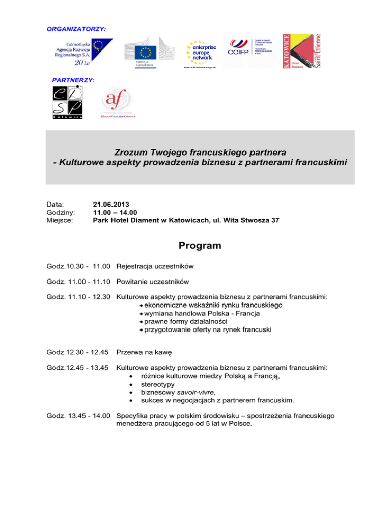 ORGANIZATORZY: PARTNERZY: Zrozum Twojego francuskiego partnera - Kulturowe aspekty prowadzenia biznesu z partnerami francuskimi Data: Godziny: Miejsce: 21.06.2013 11.00 – 14.00 Park Hotel Diament w Katowicach, ul. Wita Stwosza 37 Program Godz.10.30 - 11.00 Rejestracja uczestników Godz. 11.00 - 11.10 Powitanie uczestników Godz. 11.10 - 12.30 Kulturowe aspekty prowadzenia biznesu z partnerami francuskimi: ekonomiczne wskaźniki rynku francuskiego wymiana handlowa Polska - Francja prawne formy działalności przygotowanie oferty na rynek francuski Godz.12.30 - 12.45 Przerwa na kawę Godz.12.45 - 13.45 Kulturowe aspekty prowadzenia biznesu z partnerami francuskimi: różnice kulturowe miedzy Polską a Francją, stereotypy biznesowy savoir-vivre, sukces w negocjacjach z partnerem francuskim. Godz. 13.45 - 14.00 Specyfika pracy w polskim środowisku – spostrzeżenia francuskiego menedżera pracującego od 5 lat w Polsce.