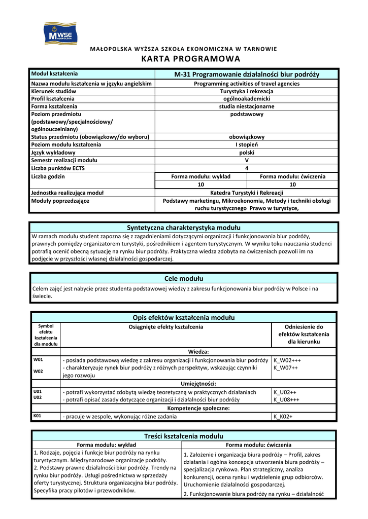 M AŁ O PO L S K A WYŻ SZ A S ZK OŁ A E K ON OM I CZN A W TA RN O WI E KARTA PROGRAMOWA Moduł kształcenia M-31 Programowanie działalności biur podróży Nazwa modułu kształcenia w języku angielskim Kierunek studiów Profil kształcenia Forma kształcenia Poziom przedmiotu (podstawowy/specjalnościowy/ ogólnouczelniany) Status przedmiotu (obowiązkowy/do wyboru) Poziom modułu kształcenia Język wykładowy Semestr realizacji modułu Liczba punktów ECTS Liczba godzin Jednostka realizująca moduł Moduły poprzedzające Programming activities of travel agencies Turystyka i rekreacja ogólnoakademicki studia niestacjonarne podstawowy obowiązkowy I stopień polski V 4 Forma modułu: wykład Forma modułu: ćwiczenia 10 10 Katedra Turystyki i Rekreacji Podstawy marketingu, Mikroekonomia, Metody i techniki obsługi ruchu turystycznego Prawo w turystyce, Syntetyczna charakterystyka modułu W ramach modułu student zapozna się z zagadnieniami dotyczącymi organizacji i funkcjonowania biur podróży, prawnych pomiędzy organizatorem turystyki, pośrednikiem i agentem turystycznym. W wyniku toku nauczania studenci potrafią ocenić obecną sytuację na rynku biur podróży. Praktyczna wiedza zdobyta na ćwiczeniach pozwoli im na podjęcie w przyszłości własnej działalności gospodarczej. Cele modułu Celem zajęć jest nabycie przez studenta podstawowej wiedzy z zakresu funkcjonowania biur podróży w Polsce i na świecie. Opis efektów kształcenia modułu Symbol efektu kształcenia dla modułu W01 W02 U01 U02 K01 Osiągnięte efekty kształcenia Odniesienie do efektów kształcenia dla kierunku Wiedza: - posiada podstawową wiedzę z zakresu organizacji i funkcjonowania biur podróży - charakteryzuje rynek biur podróży z różnych perspektyw, wskazując czynniki jego rozwoju Umiejętności: - potrafi wykorzystać zdobytą wiedzę teoretyczną w praktycznych działaniach - potrafi opisać zasady dotyczące organizacji i działalności biur podróży Kompetencje społeczne: - pracuje w zespole, wykonując różne zadania K_W02+++ K_W07++ K_U02++ K_U08+++ K_K02+ Treści kształcenia modułu Forma modułu: wykład 1. Rodzaje, pojęcia i funkcje biur podróży na rynku turystycznym. Międzynarodowe organizacje podróży. 2. Podstawy prawne działalności biur podróży. Trendy na rynku biur podróży. Usługi pośrednictwa w sprzedaży oferty turystycznej. Struktura organizacyjna biur podróży. Specyfika pracy pilotów i przewodników. Forma modułu: ćwiczenia 1. Założenie i organizacja biura podróży – Profil, zakres działania i ogólna koncepcja utworzenia biura podróży – specjalizacja rynkowa. Plan strategiczny, analiza konkurencji, ocena rynku i wydzielenie grup odbiorców. Uruchomienie działalności gospodarczej. 2. Funkcjonowanie biura podróży na rynku – działalność 3. Biura podróży w Polsce. Czynniki zewnętrzne wpływające na funkcjonowanie biur podróży. Rozwój nowoczesnych technologii. Partnerstwo, sieci współpracy. Kontrola działalności. Badania konkurencji. 4. Produkt turystyczny w działalności biur podróży, Pakiety turystyczne. Jakość usług. Promocja i dystrybucja oferty turystycznej. Internetowe systemy sprzedaży oferty. Literatura podstawowa Literatura uzupełniająca marketingowa Zasady tworzenia ofert turystycznych. Pakiety podstawowe i poszerzone. Wizualizacja oferty turystycznej. Działalność promocyjna biura podróży. Kanały dystrybucji. Konieczna-Domańska A.., Biura podróży na rynku turystycznym, Wyd. PWN, Warszawa 2008. Michalska-Dudek I., Przeorek-Smyka R., Marketing biur podróży, Wyd. C.H.Beck, Warszawa 2010. aktualne opracowania, artykuły dotyczące rynku biur podróży (strony ministerialne, czasopisma branżowe itd.) Metody dydaktyczne podające (wykład, opis, objaśnienie), problemowe (metoda przypadków), praktyczne (projekt, ćwiczenia przedmiotowe)