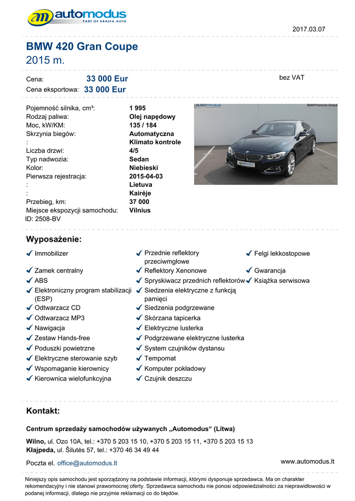 2017.03.07 BMW 420 Gran Coupe 2015 m. Cena: Cena eksportowa: bez VAT 33 000 Eur 33 000 Eur Pojemność silnika, cm³: Rodzaj paliwa: Moc, kW/KM: Skrzynia biegów: : Liczba drzwi: Typ nadwozia: Kolor: Pierwsza rejestracja: : : Przebieg, km: Miejsce ekspozycji samochodu: ID: 2508-BV 1 995 Olej napędowy 135 / 184 Automatyczna Klimato kontrole 4/5 Sedan Niebieski 2015-04-03 Lietuva Kairėje 37 000 Vilnius Wyposażenie: Felgi lekkostopowe Zamek centralny Przednie reflektory przeciwmgłowe Reflektory Xenonowe ABS Elektroniczny program stabilizacji (ESP) Odtwarzacz CD Spryskiwacz przednich reflektorów Siedzenia elektryczne z funkcją pamięci Siedzenia podgrzewane Książka serwisowa Odtwarzacz MP3 Skórzana tapicerka Nawigacja Elektryczne lusterka Zestaw Hands-free Podgrzewane elektryczne lusterka Poduszki powietrzne System czujników dystansu Elektryczne sterowanie szyb Tempomat Wspomaganie kierownicy Komputer pokładowy Kierownica wielofunkcyjna Czujnik deszczu Immobilizer Gwarancja Kontakt: Centrum sprzedaży samochodów używanych „Automodus“ (Litwa) Wilno, ul. Ozo 10A, tel.: +370 5 203 15 10, +370 5 203 15 11, +370 5 203 15 13 Kłajpeda, ul. Šilutės 57, tel.: +370 46 34 49 44 Poczta el. [email protected] www.automodus.lt Niniejszy opis samochodu jest sporządzony na podstawie informacji, którymi dysponuje sprzedawca. Ma on charakter rekomendacyjny i nie stanowi prawomocnej oferty. Sprzedawca samochodu nie ponosi odpowiedzialności za nieprawidłowości w podanej informacji, dlatego nie przyjmie reklamacji co do błędów.