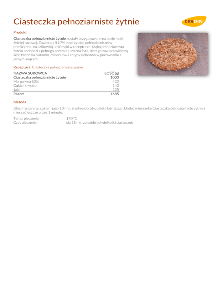 Ciasteczka pełnoziarniste żytnie Produkt Ciasteczka pełnoziarniste żytnie zostały przygotowane na bazie mąki żytniej razowej. Zawierają 51,7% mąki żytniej pełnoziarnistej w przeliczeniu na całkowitą ilość mąki w recepturze. Mąka pełnoziarnista żytnia pochodzi z pełnego przemiału ziarna żyta, dlatego zawiera większą ilość błonnika, witamin, minerałów i antyoksydantów w porównaniu z jasnymi mąkami. Receptura: Ciasteczka pełnoziarniste żytnie NAZWA SUROWCA Ciasteczka pełnoziarniste żytnie Margaryna 80% Cukier kryształ Jaja Razem ILOŚĆ (g) 1000 420 140 125 1685 Metoda Ubić margarynę, cukier i jaja (10 min, średnie obroty, paleta lub rózga). Dodać mieszankę Ciasteczka pełnoziarniste żytnie i mieszać jeszcze przez 1 minutę. Temp. pieczenia Czas pieczenia 170 °C ok. 18 min zależnie od wielkości ciasteczek
