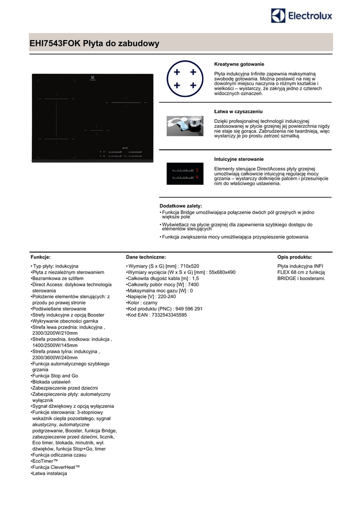 EHI7543FOK Płyta do zabudowy Kreatywne gotowanie Płyta indukcyjna Infinite zapewnia maksymalną swobodę gotowania. Można postawić na niej w dowolnym miejscu naczynia o różnym kształcie i wielkości – wystarczy, że zakryją jedno z czterech widocznych oznaczeń. Łatwa w czyszczeniu Dzięki profesjonalnej technologii indukcyjnej zastosowanej w płycie grzejnej jej powierzchnia nigdy nie staje się gorąca. Zabrudzenia nie twardnieją, więc wystarczy je po prostu zetrzeć szmatką. Intuicyjne sterowanie Elementy sterujące DirectAccess płyty grzejnej umożliwiają całkowicie intuicyjną regulację mocy grzania – wystarczy dotknięcie palcem i przesunięcie nim do właściwego ustawienia. Dodatkowe zalety: • Funkcja Bridge umożliwiająca połączenie dwóch pól grzejnych w jedno większe pole • Wyświetlacz na płycie grzejnej dla zapewnienia szybkiego dostępu do elementów sterujących • Funkcja zwiększenia mocy umożliwiająca przyspieszenie gotowania Funkcje: Dane techniczne: Opis produktu: • Typ płyty: indukcyjna •Płyta z niezależnym sterowaniem •Bezramkowa ze szlifem •Direct Access: dotykowa technologia sterowania •Położenie elementów sterujących: z przodu po prawej stronie •Podświetlane sterowanie •Strefy indukcyjne z opcją Booster •Wykrywanie obecności garnka •Strefa lewa przednia: indukcyjna , 2300/3200W/210mm •Strefa przednia, środkowa: indukcja , 1400/2500W/145mm •Strefa prawa tylna: indukcyjna , 2300/3600W/240mm •Funkcja automatycznego szybkiego grzania •Funkcja Stop and Go •Blokada ustawień •Zabezpieczenie przed dziećmi •Zabezpieczenia płyty: automatyczny wyłącznik •Sygnał dźwiękowy z opcją wyłączenia •Funkcje sterowania: 3-stopniowy wskaźnik ciepła pozostałego, sygnał akustyczny, automatyczne podgrzewanie, Booster, funkcja Bridge, zabezpieczenie przed dziećmi, licznik, Eco timer, blokada, minutnik, wył. dźwięków, funkcja Stop+Go, timer •Funkcja odliczania czasu •EcoTimer™ •Funkcja CleverHeat™ •Łatwa instalacja • Wymiary (S x G) [mm] : 710x520 •Wymiary wycięcia (W x S x G) [mm] : 55x680x490 •Całkowita długość kabla [m] : 1,5 •Całkowity pobór mocy [W] : 7400 •Maksymalna moc gazu [W] : 0 •Napięcie [V] : 220-240 •Kolor : czarny •Kod produktu (PNC) : 949 596 291 •Kod EAN : 7332543345595 Płyta indukcyjna INFI FLEX 68 cm z funkcją BRIDGE i boosterami. EHI7543FOK Płyta do zabudowy