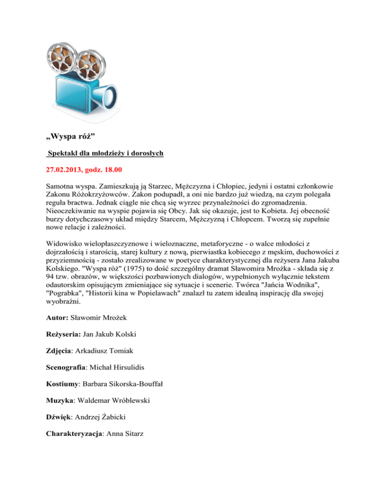 „Wyspa róż” Spektakl dla młodzieży i dorosłych 27.02.2013, godz. 18.00 Samotna wyspa. Zamieszkują ją Starzec, Mężczyzna i Chłopiec, jedyni i ostatni członkowie Zakonu Różokrzyżowców. Zakon podupadł, a oni nie bardzo już wiedzą, na czym polegała reguła bractwa. Jednak ciągle nie chcą się wyrzec przynależności do zgromadzenia. Nieoczekiwanie na wyspie pojawia się Obcy. Jak się okazuje, jest to Kobieta. Jej obecność burzy dotychczasowy układ między Starcem, Mężczyzną i Chłopcem. Tworzą się zupełnie nowe relacje i zależności. Widowisko wielopłaszczyznowe i wieloznaczne, metaforyczne - o walce młodości z dojrzałością i starością, starej kultury z nową, pierwiastka kobiecego z męskim, duchowości z przyziemnością - zostało zrealizowane w poetyce charakterystycznej dla reżysera Jana Jakuba Kolskiego. "Wyspa róż" (1975) to dość szczególny dramat Sławomira Mrożka - składa się z 94 tzw. obrazów, w większości pozbawionych dialogów, wypełnionych wyłącznie tekstem odautorskim opisującym zmieniające się sytuacje i scenerie. Twórca "Jańcia Wodnika", "Pograbka", "Historii kina w Popielawach" znalazł tu zatem idealną inspirację dla swojej wyobraźni. Autor: Sławomir Mrożek Reżyseria: Jan Jakub Kolski Zdjęcia: Arkadiusz Tomiak Scenografia: Michał Hirsulidis Kostiumy: Barbara Sikorska-Bouffał Muzyka: Waldemar Wróblewski Dźwięk: Andrzej Żabicki Charakteryzacja: Anna Sitarz Obsada aktorska: Grażyna Błęcka-Kolska (Kobieta), Michał Pawlicki (Starzec), Bartosz Opania (Mężczyzna), Michał Jasiński (Chłopiec) Rok produkcji: 1998