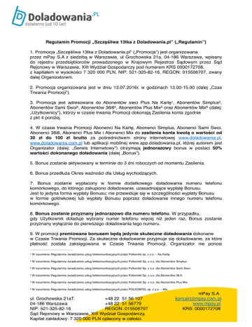 Regulamin Promocji „Szczęśliwa 13tka z Doladowania.pl” („Regulamin”) 1. Promocja „Szczęśliwa 13tka z Doladowania.pl” („Promocja”) jest organizowana przez mPay S.A z siedzibą w Warszawie, ul Grochowska 21a, 04-186 Warszawa, wpisany do rejestru przedsiębiorców prowadzonego w Krajowym Rejestrze Sądowym przez Sąd Rejonowy w Warszawie, XIII Wydział Gospodarczy pod numerem KRS 0000172708, z kapitałem w wysokości 7 320 000 PLN, NIP: 521-325-82-16, REGON: 015506707, zwany dalej Organizatorem. 2. Promocja organizowana jest w dniu 13.07.2016r. w godzinach 13.00-15.00 (dalej „Czas Trwania Promocji”). 3. Promocja jest adresowana do Abonentów sieci Plus Na Kartę1, Abonentów Simplus2, Abonentów Sami Swoi3 , Abonentów 36i64 , Abonentów Plus Mix5 oraz Abonentów Mix6 (dalej: „Użytkownicy”), którzy w czasie trwania Promocji dokonają Zasilenia konta zgodnie z pkt 4 poniżej. 4. W czasie trwania Promocji Abonenci Na Kartę, Abonenci Simplus, Abonenci Sami Swoi, Abonenci 36i6, Abonenci Plus Mix i Abonenci Mix do zasilenia konta kwotą o wartości od 30 zł do 100 zł brutto za pośrednictwem strony internetowej www.doladowania.pl, www.doladowania.com.pl lub aplikacji mobilnej www.app.doladowania.pl, której autorem jest Organizator (dalej: „Serwis Internetowy”) otrzymają jednorazowy bonus w postaci 50% wartości dokonanego doładowania (dalej „Bonus”). 5. Bonus zostanie aktywowany w terminie do 3 dni roboczych od momentu Zasilenia. 6. Bonus przedłuża Okres ważności dla Usług wychodzących. 7. Bonus zostanie wypłacony w formie dodatkowego doładowania numeru telefonu komórkowego, do którego zakupiono doładowanie, uzasadniające wypłatę Bonusu. Jest to jedyna forma wypłaty Bonusu; nie przewiduje się w szczególności wypłaty Bonusu w formie gotówkowej lub wypłaty Bonusu poprzez doładowanie innego numeru telefonu komórkowego. 8. Bonus zostanie przyznany jednorazowo dla numeru telefonu. W przypadku, gdy Użytkownik doładuje wybrany numer telefonu więcej niż jeden raz, Bonus zostanie przyznany wyłącznie do pierwszego doładowania tego numeru. 9. W promocji premiowane bonusem będą jedynie skuteczne doładowania dokonane w Czasie Trwania Promocji. Za skuteczne doładowanie przyjmuje się doładowanie, za które płatność została zaksięgowana w Czasie Trwania Promocji. Organizator nie ponosi 1 W rozumieniu Regulaminu świadczenia usług telekomunikacyjnych przez Polkomtel sp. z o.o. – Na Kartę. 2 W rozumieniu Regulaminu świadczenia usług telekomunikacyjnych przez Polkomtel Sp. z o.o. dla Abonentów Simplus. 3 W rozumieniu Regulaminu świadczenia usług telekomunikacyjnych przez Polkomtel Sp. z o.o. dla Abonentów Sami Swoi. 4 W rozumieniu Regulaminu świadczenia usług telekomunikacyjnych przez Polkomtel Sp. z o.o. dla Abonentów 36.6. 5 W rozumieniu Regulaminu świadczenia usług telekomunikacyjnych przez Polkomtel Sp. z o.o. dla Abonentów Plus Mix. 6 W rozumieniu Regulaminu świadczenia usług telekomunikacyjnych przez POLKOMTEL sp. z o.o. – Mix. ul. Grochowska 21aT. +48 22 51 56 107 04-186 Warszawa +48 22 51 56779 NIP: 521-325-82-16 REGON: 015506707 Sąd Rejonowy w Warszawie, XIII Wydział Gospodarczy, Kapitał zakładowy: 7 320 000 PLN opłacony w całości. mPay S.A. [email protected] www.mpay.pl KRS: 0000172708 odpowiedzialności za błędy operatorów płatności, w szczególności niedostarczenie płatności w Czasie Trwania Promocji. 10. Promocja nie łączy się z innymi promocjami, organizowanymi przez Organizatora, oferowanymi w ramach Serwisu Internetowego. 11. Bonus może być wykorzystany na wszystkie usługi telekomunikacyjne dostępne dla danego Użytkownika określonego w pkt 3 Regulaminu zgodnie z taryfą, z której korzysta. 12. W kwestiach nieuregulowanych niniejszym Regulaminem Promocji zastosowanie mają stosowne regulaminy świadczenia usług telekomunikacyjnych właściwych operatorów oraz obowiązujące polskie przepisy prawa. 13. Informacja o wcześniejszym odwołaniu Promocji zostanie podana przez Organizatora do wiadomości publicznej na stronie internetowej www.doladowania.pl oraz na stronach internetowych www.facebook.com/doladowaniapl. 14. Reklamacje w sprawie Promocji należy zgłaszać w wiadomości e-mail na adres [email protected] podając imię i nazwisko, numer telefonu oraz numer transakcji (zawarty w e-mailu potwierdzającym rozpoczęcie transakcji). Reklamacje będą rozpatrywane w czasie 36h od otrzymania reklamacji. 15. Regulamin dostępny jest w Serwisie Internetowym oraz w siedzibie Organizatora. ul. Grochowska 21aT. +48 22 51 56 107 04-186 Warszawa +48 22 51 56779 NIP: 521-325-82-16 REGON: 015506707 Sąd Rejonowy w Warszawie, XIII Wydział Gospodarczy, Kapitał zakładowy: 7 320 000 PLN opłacony w całości. mPay S.A. [email protected] www.mpay.pl KRS: 0000172708