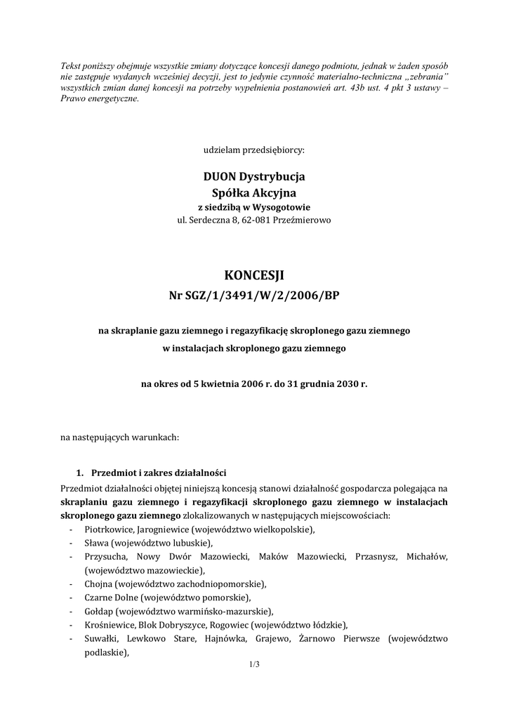 Tekst poniższy obejmuje wszystkie zmiany dotyczące koncesji danego podmiotu, jednak w żaden sposób nie zastępuje wydanych wcześniej decyzji, jest to jedynie czynność materialno-techniczna „zebrania” wszystkich zmian danej koncesji na potrzeby wypełnienia postanowień art. 43b ust. 4 pkt 3 ustawy – Prawo energetyczne. udzielam przedsiębiorcy: DUON Dystrybucja Spółka Akcyjna z siedzibą w Wysogotowie ul. Serdeczna 8, 62-081 Przeźmierowo KONCESJI Nr SGZ/1/3491/W/2/2006/BP na skraplanie gazu ziemnego i regazyfikację skroplonego gazu ziemnego w instalacjach skroplonego gazu ziemnego na okres od 5 kwietnia 2006 r. do 31 grudnia 2030 r. na następujących warunkach: 1. Przedmiot i zakres działalności Przedmiot działalności objętej niniejszą koncesją stanowi działalność gospodarcza polegająca na skraplaniu gazu ziemnego i regazyfikacji skroplonego gazu ziemnego w instalacjach skroplonego gazu ziemnego zlokalizowanych w następujących miejscowościach: - Piotrkowice, Jarogniewice (województwo wielkopolskie), - Sława (województwo lubuskie), - Przysucha, Nowy Dwór Mazowiecki, Maków Mazowiecki, Przasnysz, Michałów, (województwo mazowieckie), - Chojna (województwo zachodniopomorskie), - Czarne Dolne (województwo pomorskie), - Gołdap (województwo warmińsko-mazurskie), - Krośniewice, Blok Dobryszyce, Rogowiec (województwo łódzkie), - Suwałki, Lewkowo Stare, Hajnówka, Grajewo, Żarnowo Pierwsze (województwo podlaskie), 1/3 - Kuźnia Raciborska (województwo śląskie), Osiecznica (województwo dolnośląskie). 2. Warunki prowadzenia działalności 2.1. Warunki ogólne 2.1.1. Koncesjonariusz jest obowiązany do wykonywania działalności objętej niniejszą koncesją na zasadach określonych w ustawie - Prawo energetyczne oraz wydanych na jej podstawie przepisach wykonawczych, w szczególności do zapewnienia wysokiej jakości świadczonych usług przy zachowaniu zasady najniższych możliwych kosztów. 2.1.2. Koncesjonariusz jest obowiązany do przestrzegania obowiązujących przepisów, w tym przepisów o ochronie środowiska i bezpieczeństwie ekologicznym a także wydanych na ich podstawie przepisów wykonawczych. 2.1.3. Koncesjonariusz nie może zawierać umów o świadczenie usług skraplania gazu ziemnego i regazyfikacji skroplonego gazu ziemnego w instalacjach skroplonego gazu ziemnego z przedsiębiorcami, którzy nie posiadają koncesji, w przypadkach gdy taka koncesja jest wymagana przepisami ustawy - Prawo energetyczne. 2.1.4. Koncesjonariusz jest obowiązany do wykonywania działalności w sposób nie powodujący zagrożenia dla życia lub zdrowia ludzkiego oraz nie narażający na powstanie szkód materialnych. 2.1.5. Koncesjonariusz nie będzie subsydiować działalności nie objętej niniejszą koncesją z przychodu osiąganego z działalności objętej tą koncesją. 2.2. Szczególne warunki wykonywania działalności objętej koncesją ze względu na właściwą obsługę odbiorców 2.2.1. Koncesjonariusz jest obowiązany do spełnienia technicznych warunków skraplania gazu ziemnego i regazyfikacji skroplonego gazu ziemnego w instalacjach skroplonego gazu ziemnego określonych w odrębnych przepisach, w szczególności do utrzymywania obiektów, instalacji i urządzeń w należytym stanie technicznym, przy zachowaniu obowiązujących przepisów określających wymogi techniczne, jakościowe i ochrony środowiska, z uwzględnieniem uzasadnionego poziomu kosztów. 2.2.2. Koncesjonariusz jest obowiązany do zapewnienia, aby czynności w zakresie samodzielnej eksploatacji instalacji i urządzeń wykonywały wyłącznie osoby legitymujące się posiadaniem wymaganych w tym zakresie kwalifikacji. 2.2.3. Koncesjonariusz jest obowiązany do utrzymywania lub zagwarantowania możliwości pozyskania środków finansowych lub majątku pozwalającego na zaspokojenie roszczeń osób trzecich mogących powstać wskutek niewłaściwego wykonywania działalności objętej koncesją, w tym szkód w środowisku. 2/3 2.3. Warunki zaprzestania działalności po wygaśnięciu koncesji lub jej cofnięciu 2.3.1. Koncesjonariusz nie później niż na 18 miesięcy przed upływem ważności koncesji i zaprzestaniem działalności spowoduje opracowanie na własny koszt i przedstawi Prezesowi URE analizy: 1) techniczną, 2) finansową (wraz z opinią i raportem biegłego rewidenta z przeprowadzonego badania sprawozdania finansowego Koncesjonariusza za ostatni rok działalności - jeśli obowiązek badania tego sprawozdania wynika z przepisów ustawy z dnia 29 września 1994 r. o rachunkowości /Dz. U. z 2002 r. Nr 76, poz. 694, z 2003 r. Nr 60, poz. 535, Nr 124, poz. 1152, Nr 139, poz. 1324 i Nr 229, poz. 2276, z 2004 r. Nr 96, poz. 959, Nr 145, poz. 1535, Nr 146, poz. 1546 i Nr 213, poz. 2155, z 2005 r. Nr 10, poz. 66, Nr 184, poz. 1539 i Nr 267, poz. 2252/), 3) wpływu na środowisko, w zakresie wykonywanej działalności koncesjonowanej, które określą w szczególności stan wywiązania się Koncesjonariusza ze zobowiązań względem osób trzecich na dzień przewidywanego zakończenia tej działalności. 2.3.2. Koncesjonariusz jest obowiązany do realizacji wniosków i zaleceń wynikających z powyższych analiz, w najkrótszym możliwym terminie. 2.3.3. Koncesjonariusz jest obowiązany po zaprzestaniu działalności koncesjonowanej do likwidacji skutków swojej działalności, w szczególności w zakresie rekultywacji gruntów, przywrócenia rzeźby terenu do właściwego stanu, utylizacji odpadów niebezpiecznych. 2.3.4. Koncesjonariusz, w terminie 18 miesięcy przed planowaną datą zaprzestania działalności koncesjonowanej, opracuje i przedstawi Prezesowi URE plan działań, o których mowa w punkcie 2.3.3, z podaniem źródeł ich finansowania. W przypadku wystąpienia istotnych zmian warunków, na podstawie których powyższy plan został sporządzony, Koncesjonariusz jest obowiązany do jego niezwłocznej aktualizacji. 2.4. Udzielanie informacji 2.4