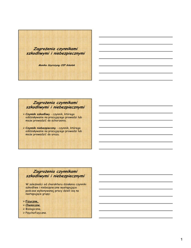 Zagrożenia czynnikami szkodliwymi i niebezpiecznymi Monika Szyrszyng OIP Gdańsk Zagrożenia czynnikami szkodliwymi i niebezpiecznymi Czynnik szkodliwy - czynnik, którego oddziaływanie na pracującego prowadzi lub może prowadzić do schorzenia. Czynnik niebezpieczny - czynnik, którego oddziaływanie na pracującego prowadzi lub może prowadzić do urazu. Zagrożenia czynnikami szkodliwymi i niebezpiecznymi W zależności od charakteru działania czynniki szkodliwe i niebezpieczne występujące podczas wykonywanej pracy dzieli się na następujące grupy: Fizyczne, Chemiczne, Biologiczne, Psychofizyczne. 1 Zagrożenia czynnikami szkodliwymi i niebezpiecznymi Fizyczne: Hałas, Wibracje, Promieniowanie elektromagnetyczne, Mikroklimat. Zagrożenia czynnikami chemicznymi Czynnik chemiczny - każdy pierwiastek lub związek chemiczny, w postaci własnej lub w mieszaninie, w stanie, w jakim występuje w przyrodzie, lub w stanie, w jakim jest wytwarzany, stosowany lub uwalniany w środowisku pracy, w tym podczas usuwania go w postaci odpadów, w trakcie każdej pracy, niezależnie od faktu, czy jest albo nie jest wytwarzany celowo lub jest albo nie jest wprowadzany do obrotu. ROZPORZĄDZENIE MINISTRA ZDROWIA z dnia 30 grudnia 2004 r. w sprawie bezpieczeństwa i higieny pracy związanej z występowaniem w miejscu pracy czynników chemicznych (Dz. U. z dnia 18 stycznia 2005 r., Nr 11 poz. 86) Zagrożenia czynnikami chemicznymi Substancje zaklasyfikowane jako niebezpieczne, Preparaty zaklasyfikowane jako niebezpieczne, Czynniki dla których ustalona jest dopuszczalna wartość stężenia, Czynniki, które ze względu na sposób użytkowania stanowią zagrożenie. 2 Zagrożenia czynnikami chemicznymi W zależności od rodzaju działania na organizm człowieka: Toksyczne, Drażniące, Uczulające, Rakotwórcze, Mutagenne, Teratogenne. Zagrożenia czynnikami chemicznymi W zależności od sposobów wchłaniania: przez drogi oddechowe, przez skórę i błony śluzowe, przez przewód pokarmowy. Częstotliwość pomiarów Czynniki rakotwórcze: co najmniej raz na trzy miesiące - przy stwierdzeniu w ostatnio przeprowadzonym badaniu lub pomiarze stężenia czynnika rakotwórczego lub mutagennego powyżej 0,5 NDS, co najmniej raz na sześć miesięcy - przy stwierdzeniu w ostatnio przeprowadzonym badaniu lub pomiarze stężenia czynnika rakotwórczego lub mutagennego powyżej 0,1 do 0,5 NDS, w każdym przypadku wprowadzenia zmiany w warunkach występowania tego czynnika. 3 Częstotliwość pomiarów Pozostałe czynniki szkodliwe: co najmniej raz w roku - przy stwierdzeniu w ostatnio przeprowadzonym badaniu lub pomiarze stężenia lub natężenia czynnika szkodliwego dla zdrowia powyżej 0,5 NDS lub NDN, co najmniej raz na dwa lata - przy stwierdzeniu w ostatnio przeprowadzonym badaniu lub pomiarze stężenia lub natężenia czynnika szkodliwego dla zdrowia powyżej 0,1 do 0,5 NDS lub NDN, w każdym przypadku wprowadzenia zmiany w warunkach występowania tego czynnika. Częstotliwość pomiarów Badań i pomiarów czynnika szkodliwego dla zdrowia występującego w środowisku pracy nie przeprowadza się, jeżeli wyniki dwóch ostatnio przeprowadzonych badań i pomiarów nie przekroczyły 0,1 NDS lub NDN, a w procesie technologicznym lub w warunkach występowania danego czynnika nie dokonała się zmiana mogąca wpływać na wysokość stężenia lub natężenia czynnika szkodliwego dla zdrowia. Częstotliwość pomiarów Na podstawie wyników badań i pomiarów pracodawca prowadzi na bieżąco rejestr czynników szkodliwych dla zdrowia występujących na stanowisku pracy (wzór określa załącznik nr 1 do rozporządzenia), Pracodawca wpisuje na bieżąco wyniki badań i pomiarów czynnika szkodliwego dla zdrowia do karty badań i pomiarów (wzór określa załącznik nr 2 do rozporządzenia). 4 Dokumentacja - pomiary W przypadku likwidacji zakładu pracy, pracodawca niezwłocznie przekazuje rejestr oraz kartę właściwemu miejscowo państwowemu inspektorowi sanitarnemu. Rejestry oraz karty przechowywane są przez okres 40 lat, licząc od daty ostatniego wpisu. Wyniki badań i pomiarów (sprawozdania z badań) przechowuje się przez okres 3 lat, licząc od daty ostatniego wpisu. Substancje chemiczne - aceton Aceton jest substancją wysoce łatwopalną. Pary mogą tworzyć z powietrzem mieszaninę wybuchową. Pary są cięższe od powietrza, gromadzą się w dolnych partiach pomieszczeń. Zapłon jest możliwy od otwartego ognia, iskry lub gorącej powierzchni. Wdychanie par acetonu powoduje podrażnienie dróg oddechowych, bóle i zawroty głowy, otępienie, osłabienie, nudności, wymioty, zaburzenia oddychania. Wyższe stężenie par działa depresyjnie na centralny system nerwowy. Substancje chemiczne - aceton Połknięcie acetonu powoduje podrażnienie błon śluzowych gardła, przełyku i żołądka, bóle brzucha, nudności, wymioty, przedostanie się acetonu do płuc może wywołać ich poważne uszkodzenie, Kontakt acetonu ze skórą powoduje podrażnienie, a długotrwały kontakt może prowadzić do podrażnienia, wysuszenie skóry, zaczerwienienie i pękanie, Dostanie się acetonu do oczu powoduje podrażnienie oczu, łzawienie, pieczenie, zaczerwienienie i ból. 5 Substancje chemiczne - styren Pary styrenu przedostają się do organizmu poprzez układ oddechowy, a także (w niewielkim stopniu) przez skórę. Wywołują podrażnienie śluzówek dróg oddechowych i oczu. W organizmie człowieka styren działa depresyjnie na obwodowy układ nerwowy. Styren zalicza się go do rakotwórczych 3 kategorii. Drogi narażenia człowieka: wdychanie, kontakt ze skórą, kontakt z oczami. spożycie, Substancje chemiczne - styren Wdychanie par i aerozoli: W łagodnych przypadkach pojawia się kaszel, podrażnienie ust i gardła, czasami ból w klatce piersiowej. W groźniejszych przypadkach – dezorientacja, senność i utrata przytomności; mogą pojawić się drgawki. Rzadkim powikłaniem jest skróceni
